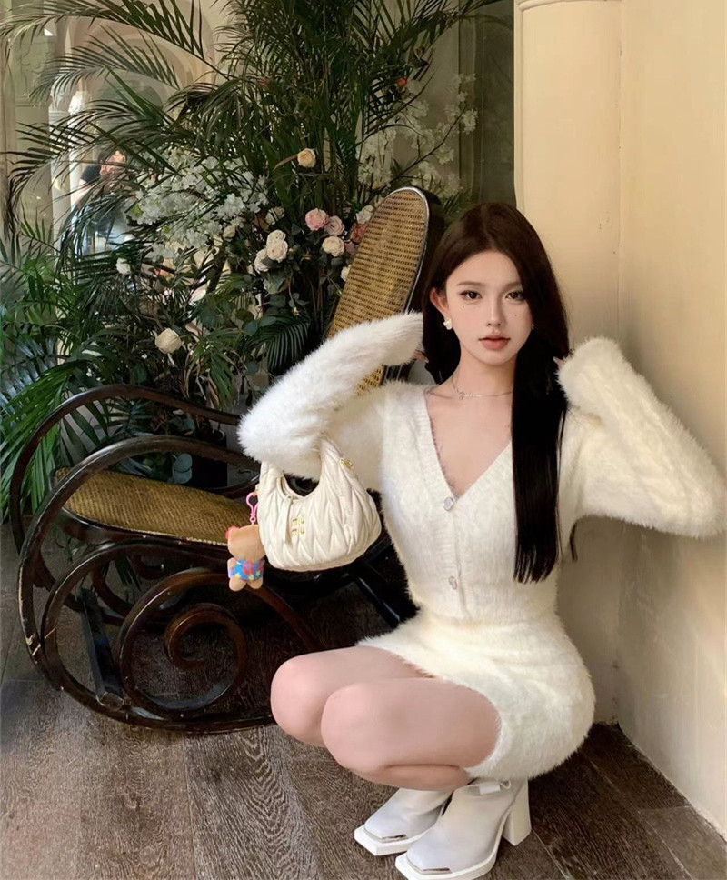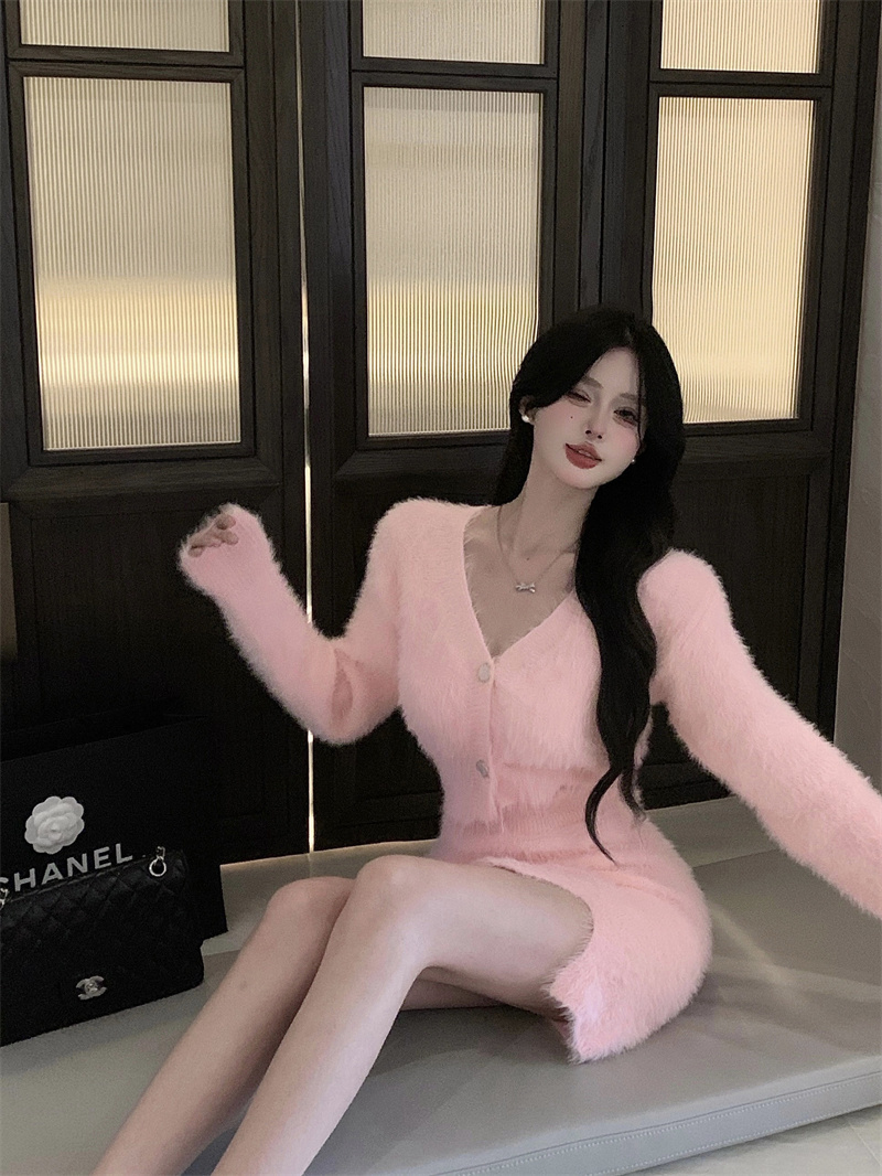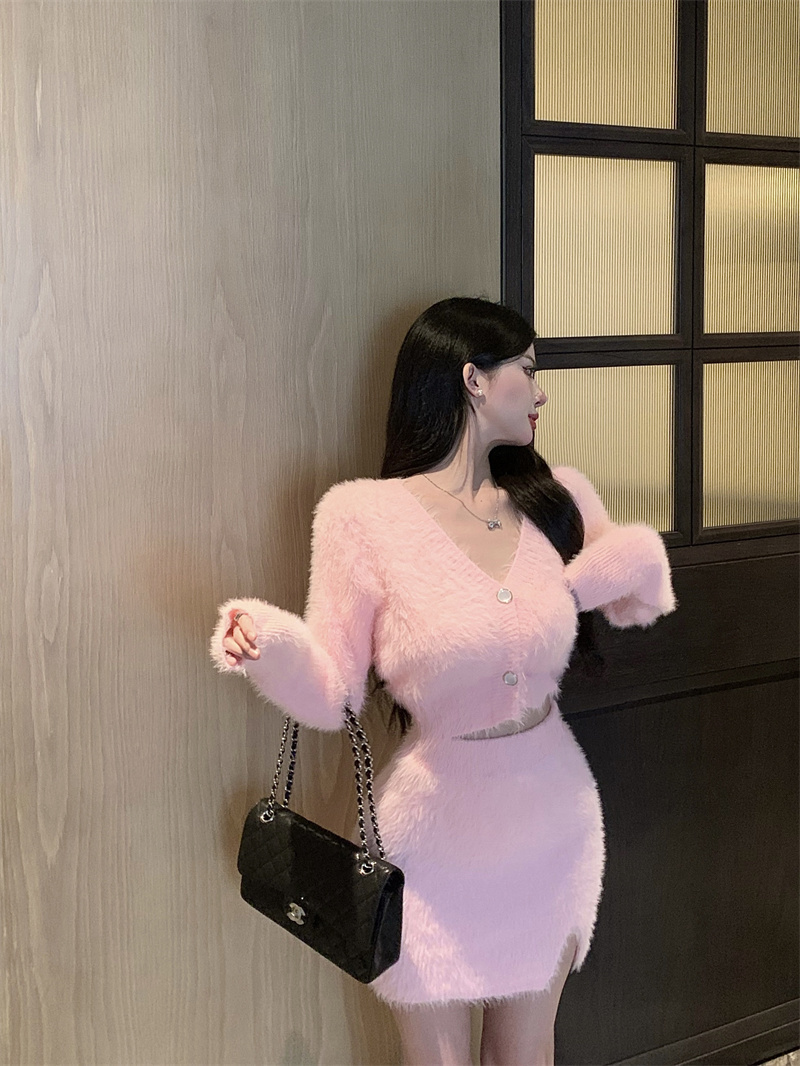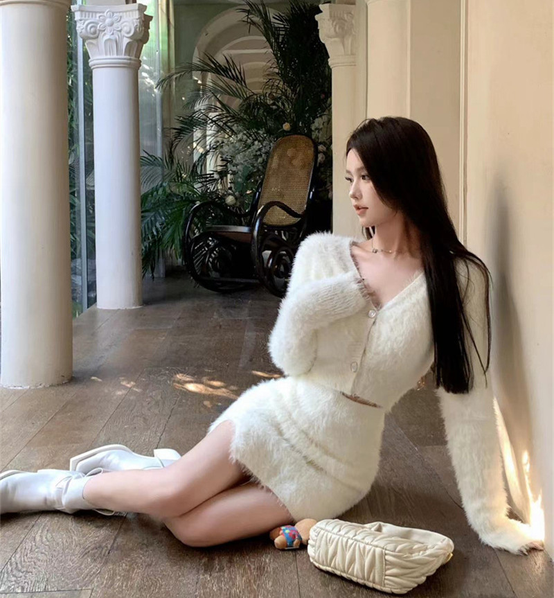 RM30770#辣妹纯欲海马毛纯色开衫性感包臀半身裙针织毛衣两件套
