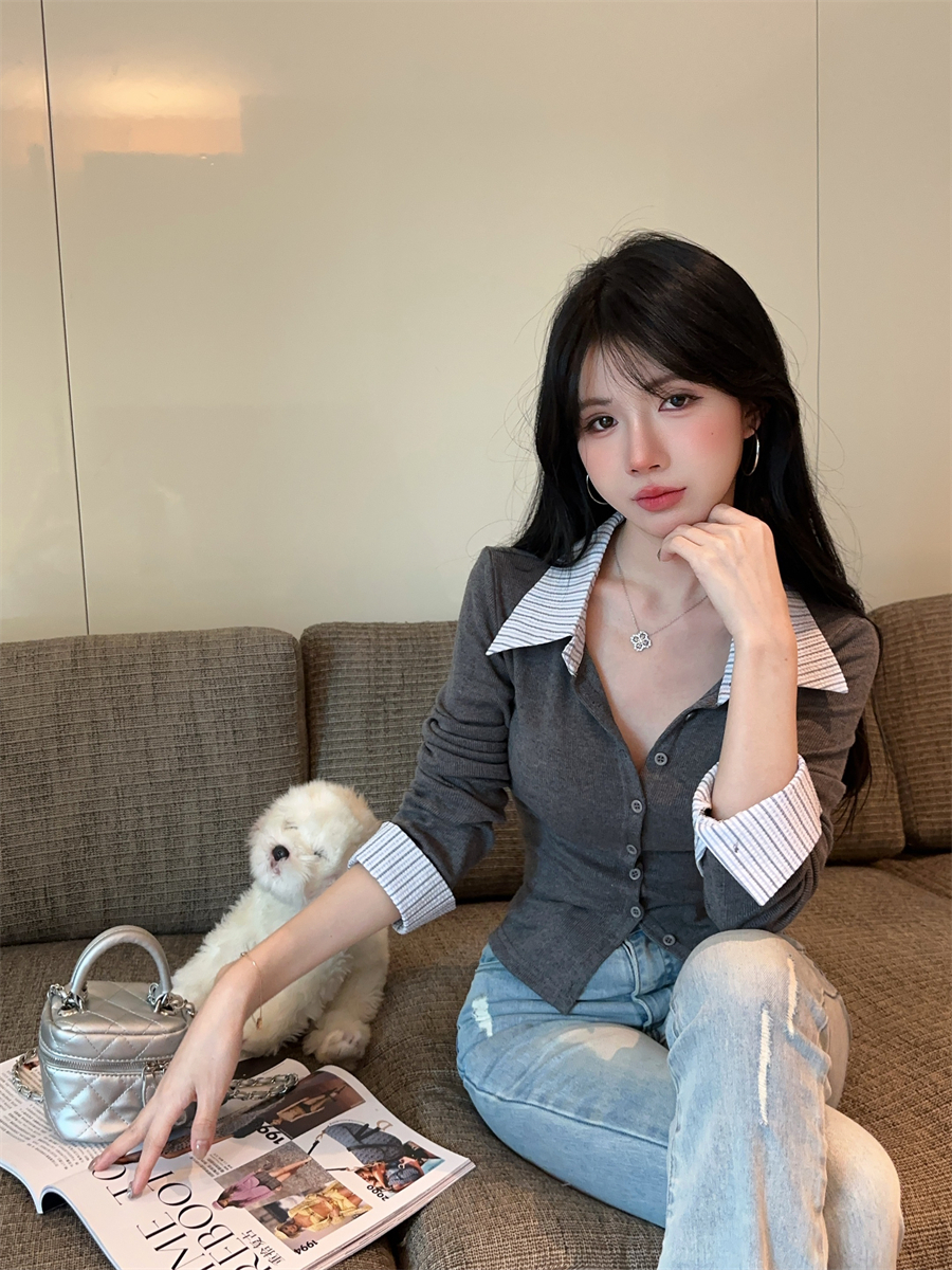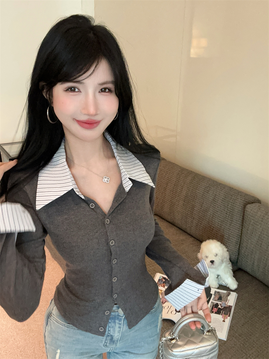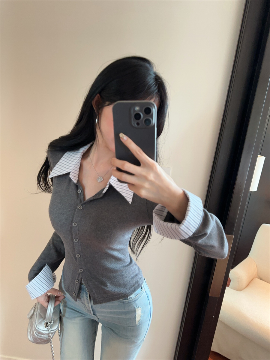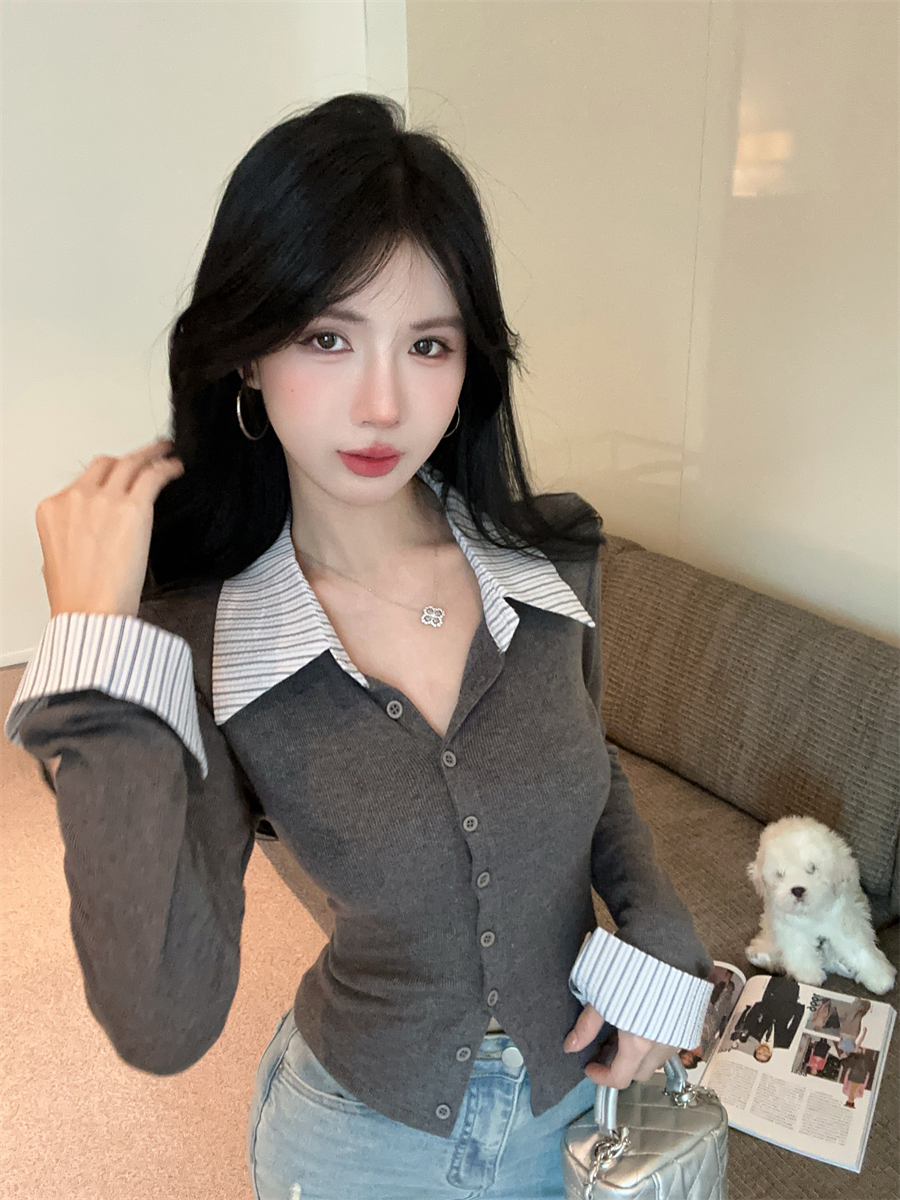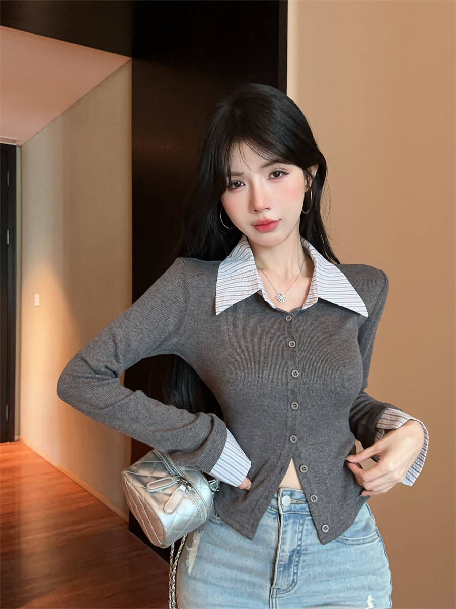 PF24627# 设计感假两件拼接针织秋季修身短款Polo领长袖开衫上衣女裝貨源服裝批發