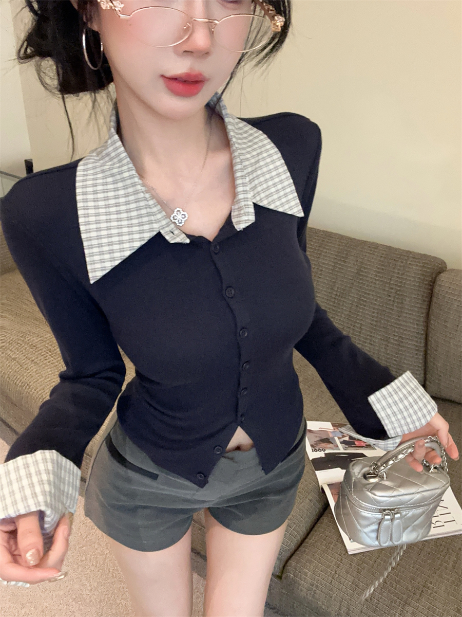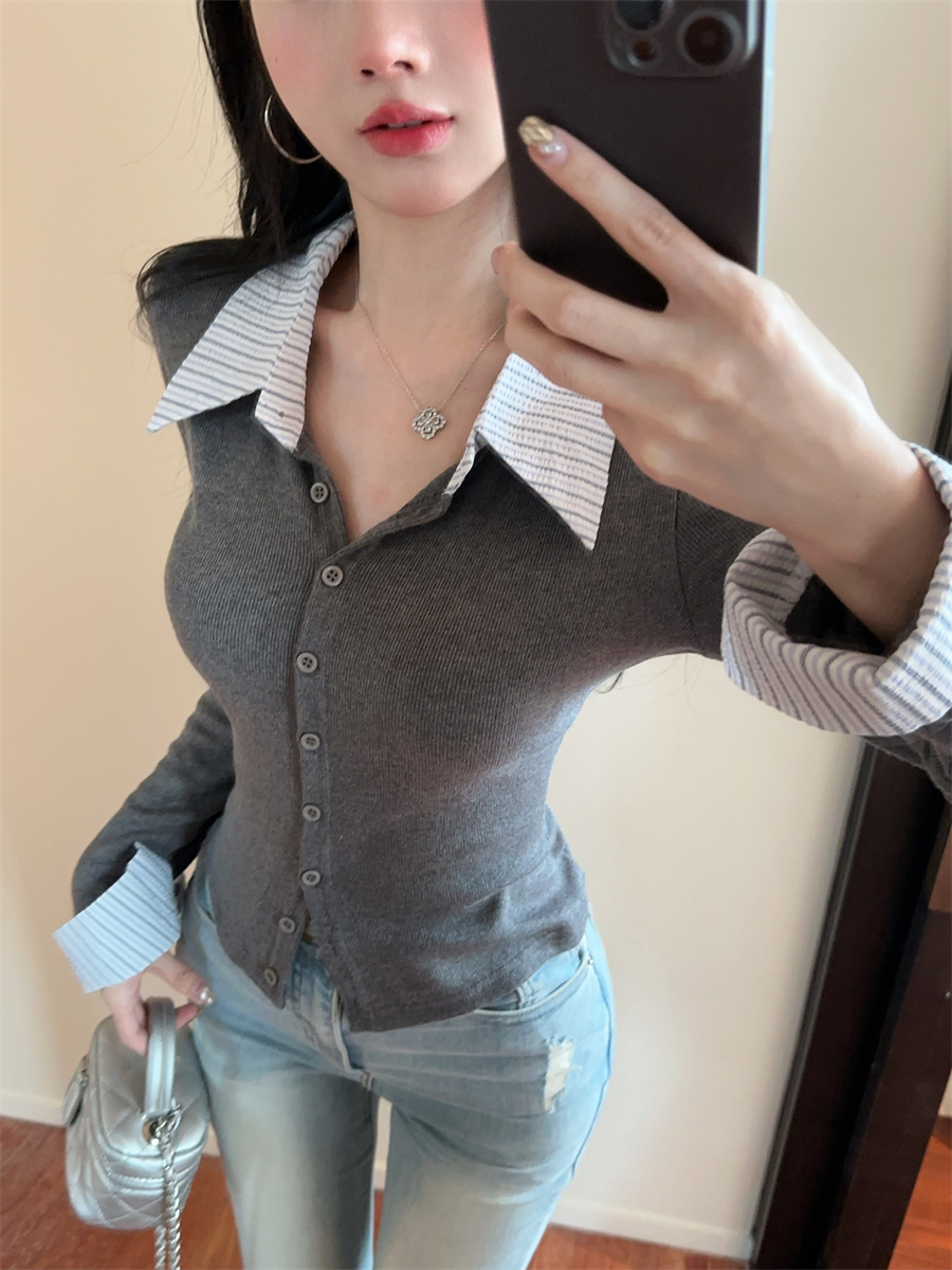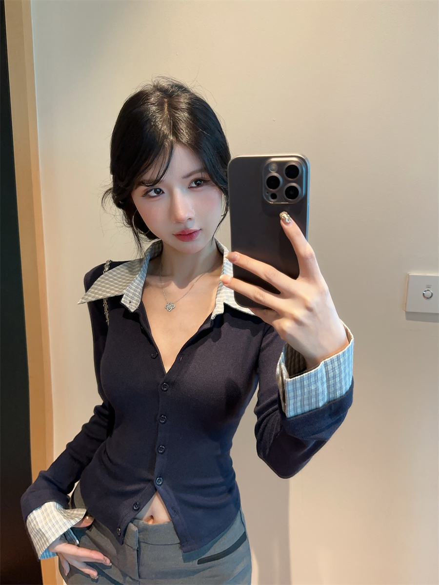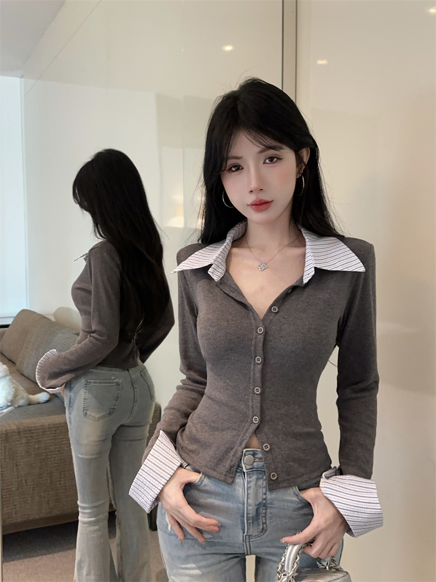 PF24627# 设计感假两件拼接针织秋季修身短款Polo领长袖开衫上衣女裝貨源服裝批發