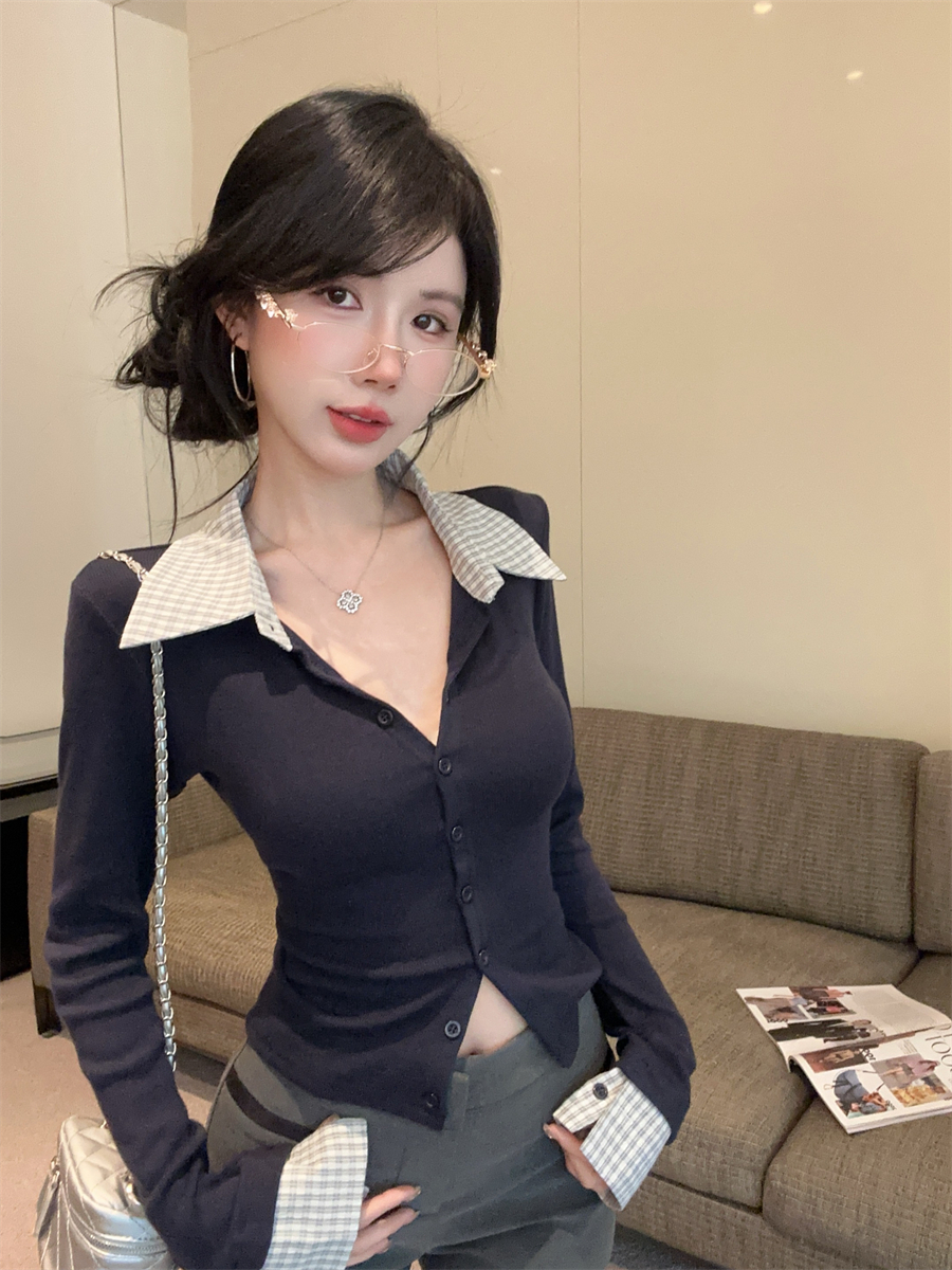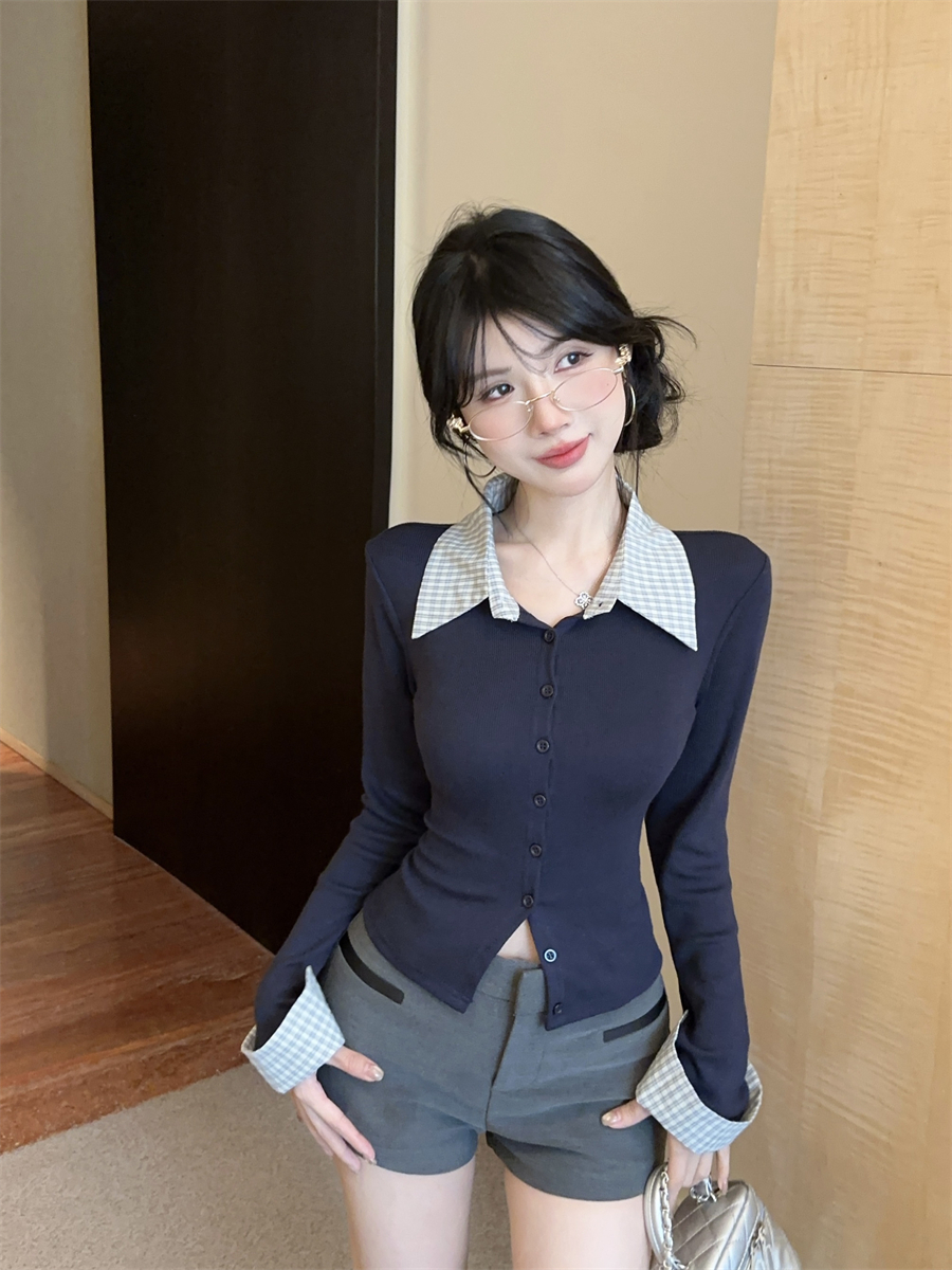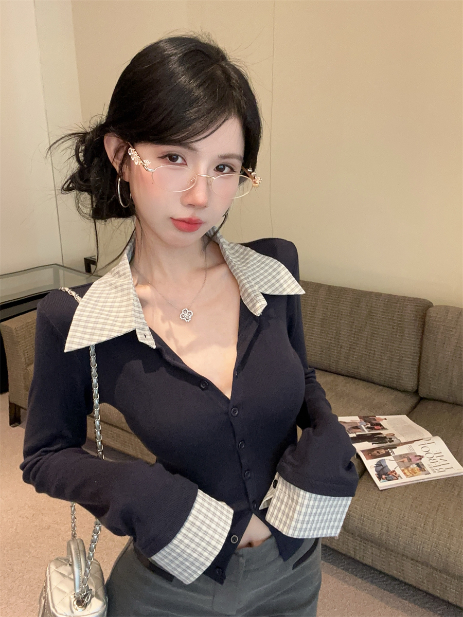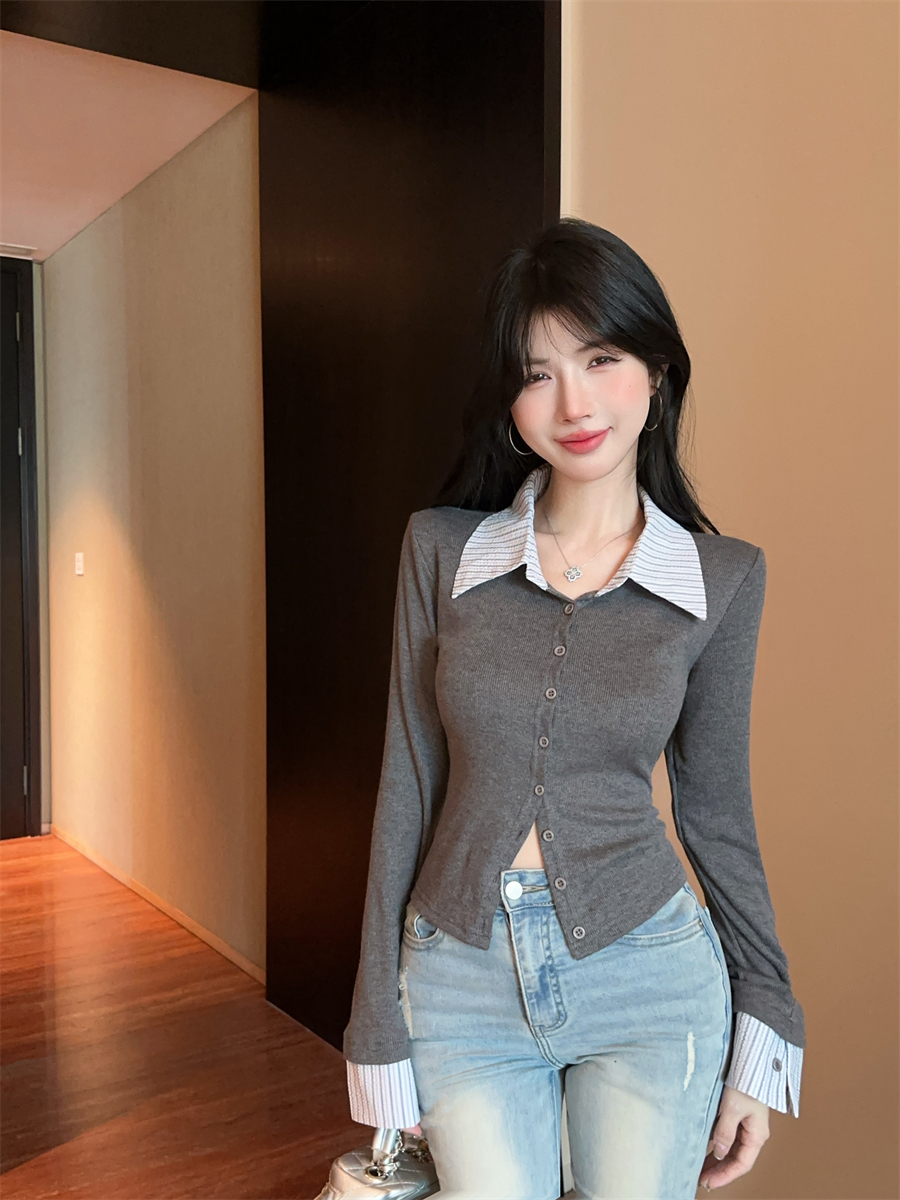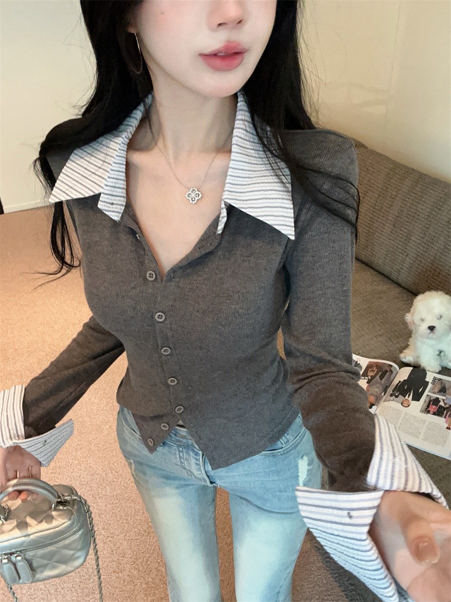 PF24627# 设计感假两件拼接针织秋季修身短款Polo领长袖开衫上衣女裝貨源服裝批發