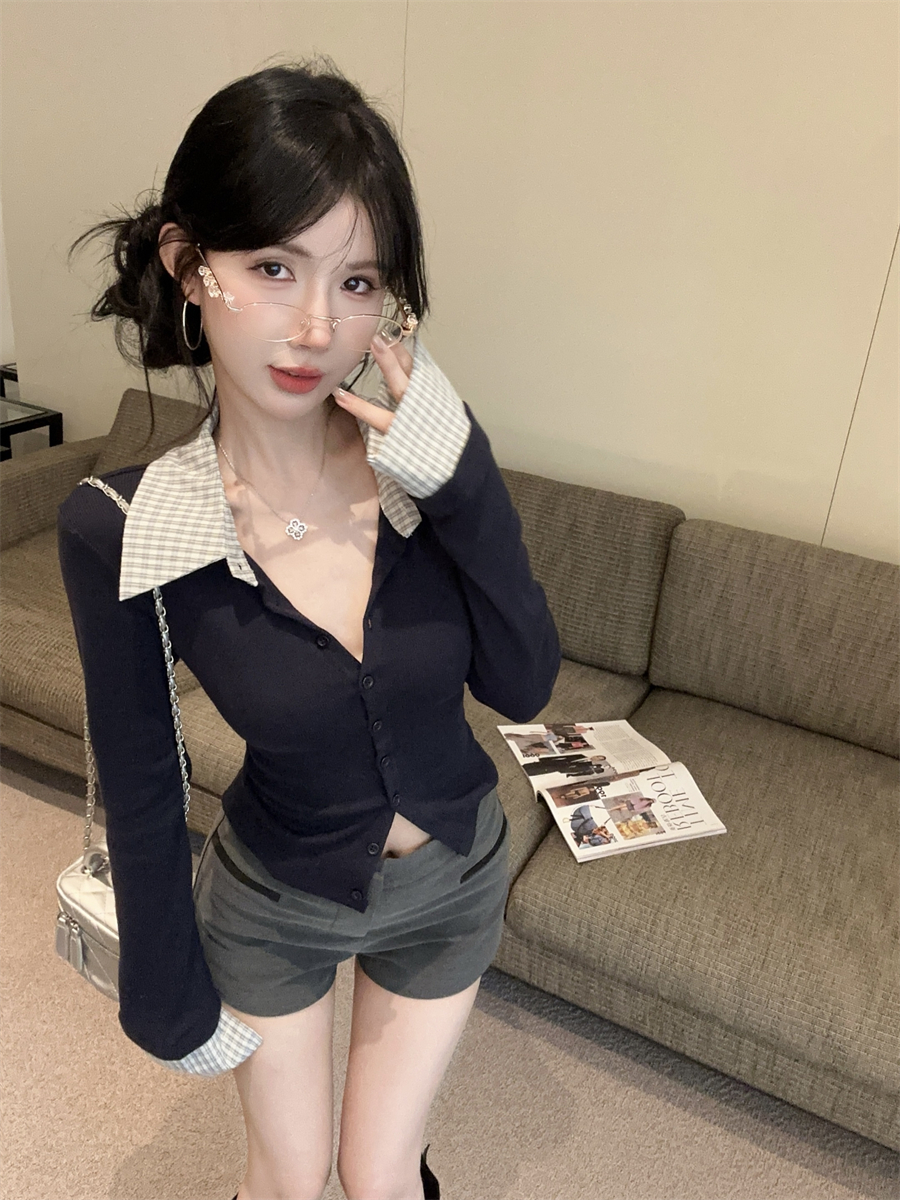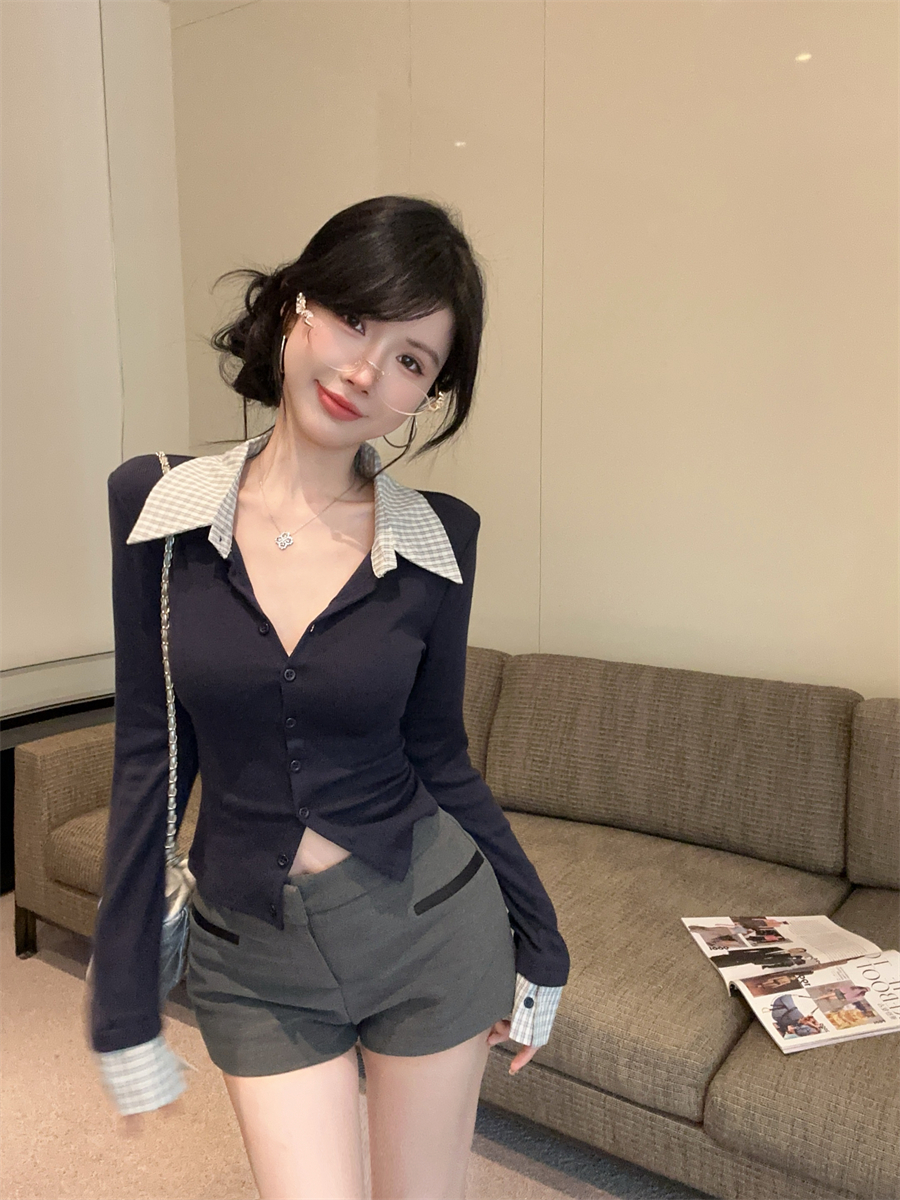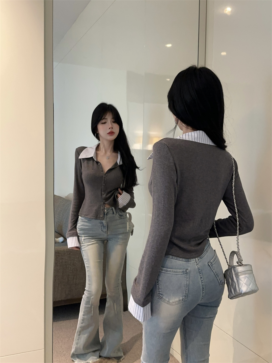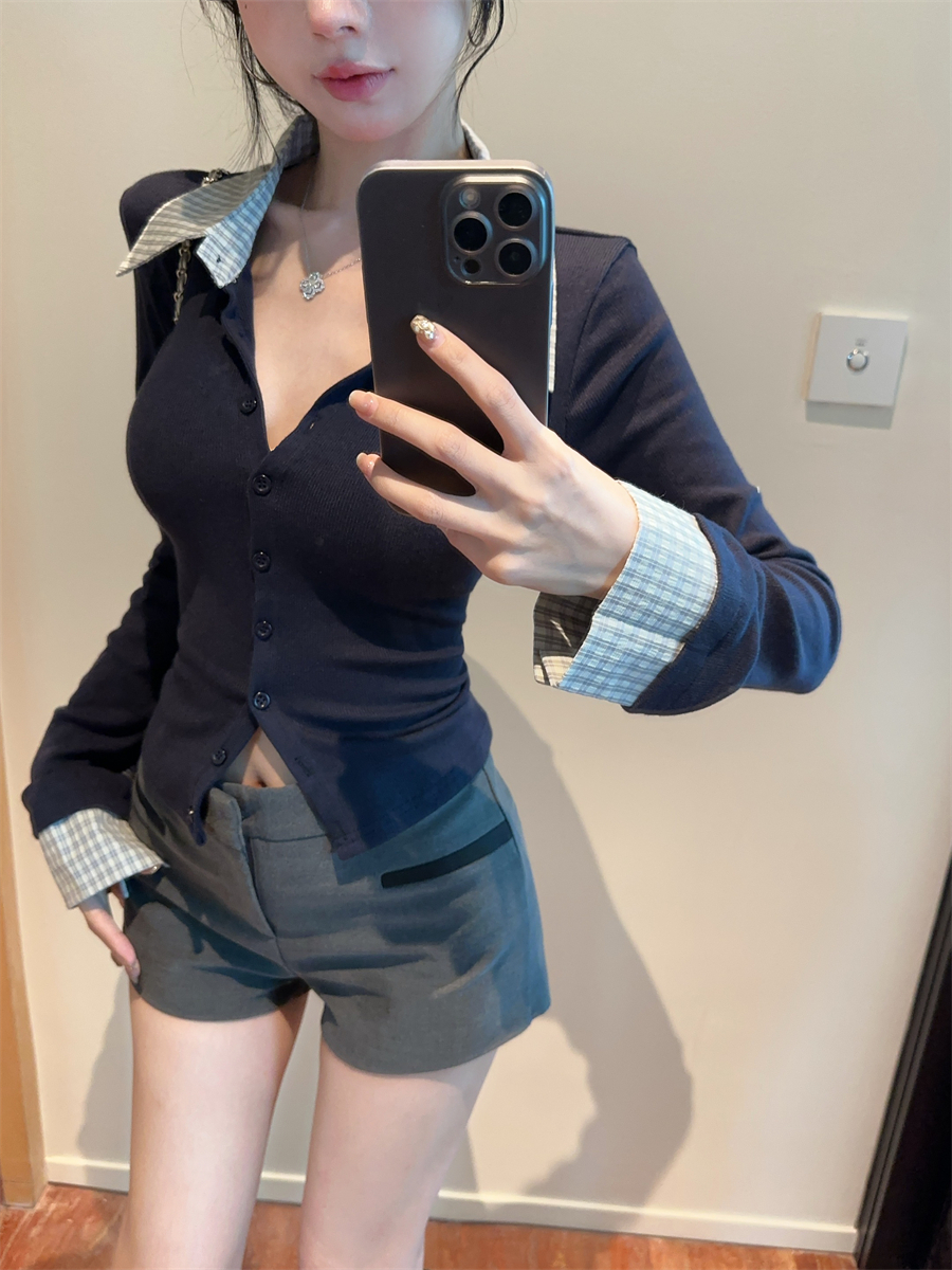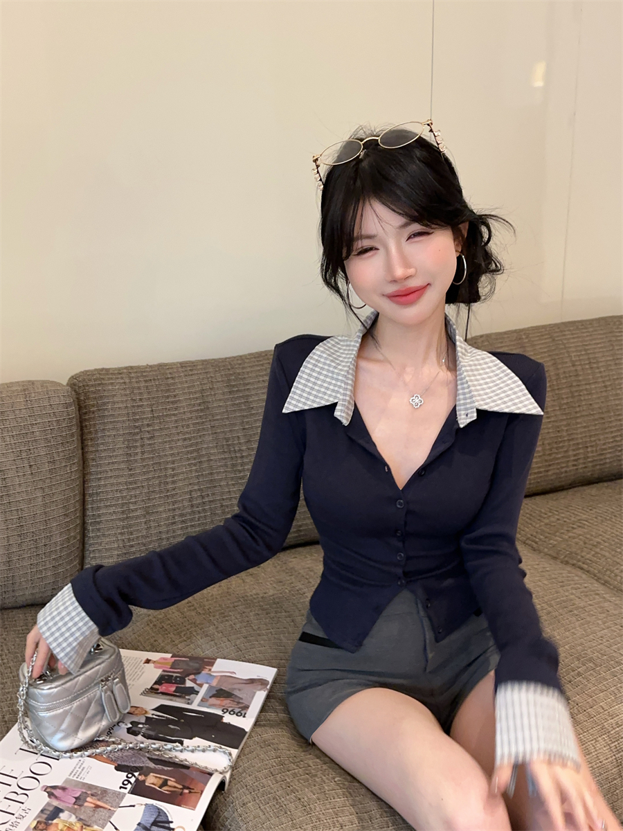 PF24627# 设计感假两件拼接针织秋季修身短款Polo领长袖开衫上衣女裝貨源服裝批發