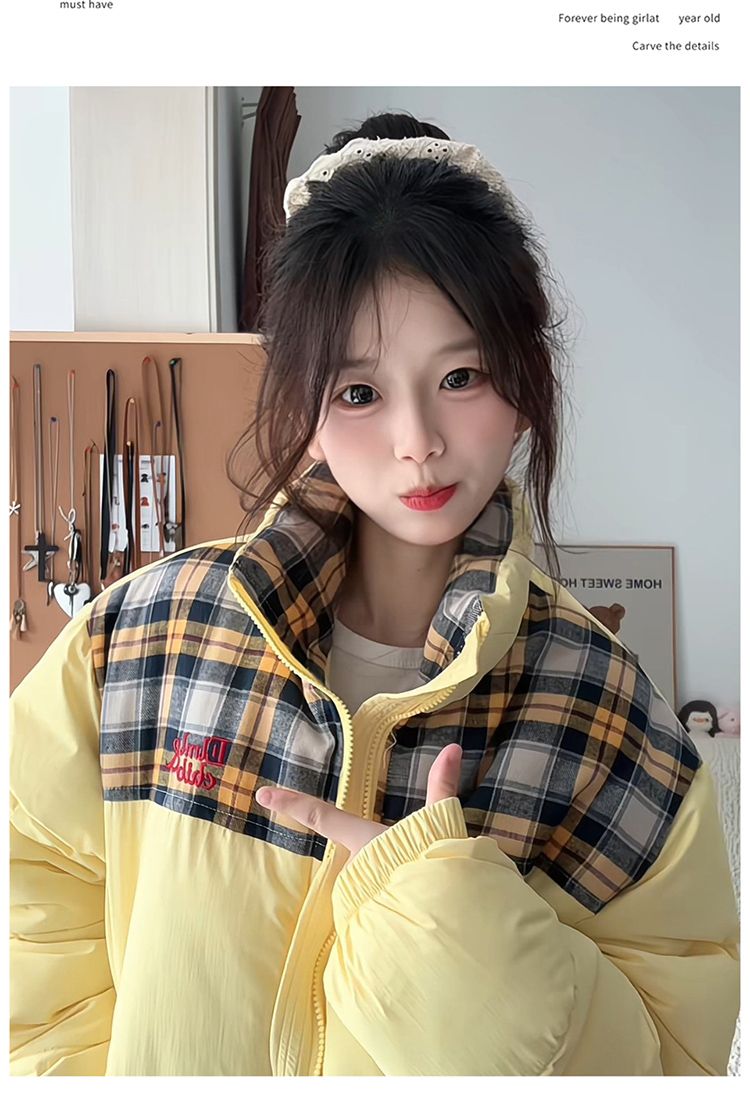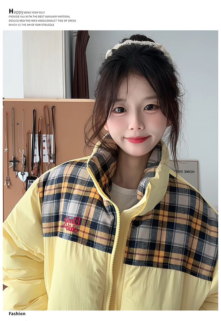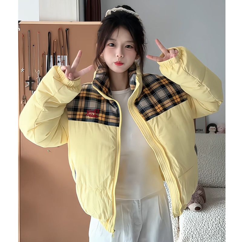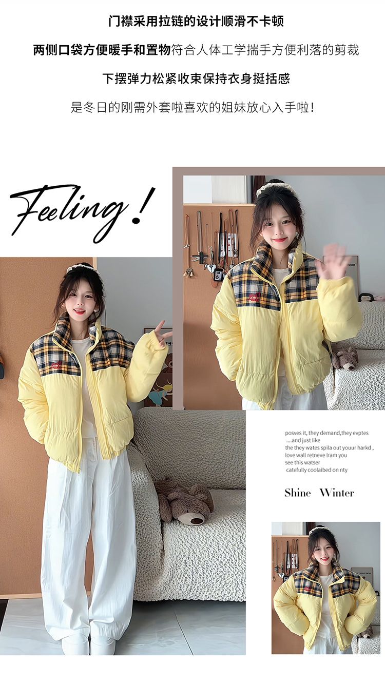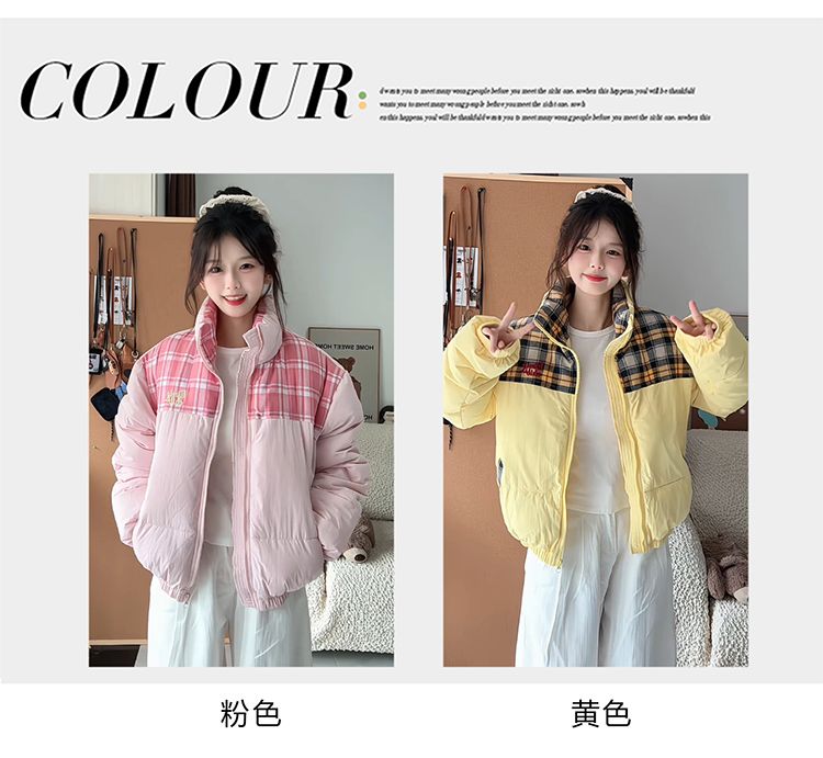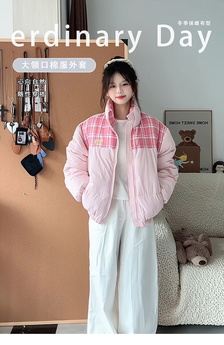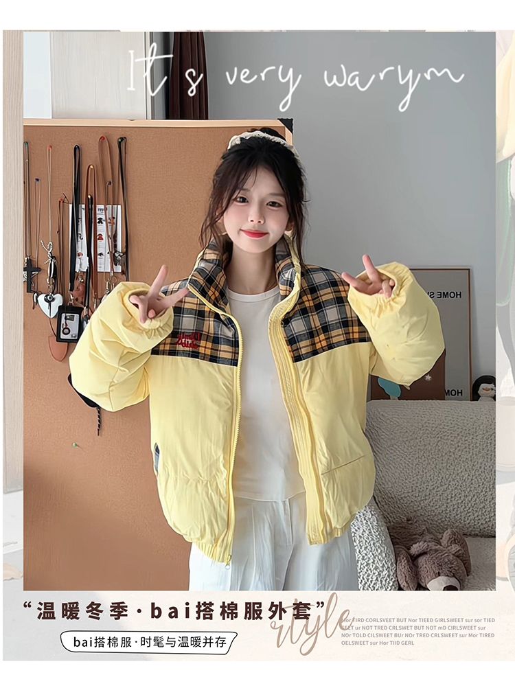 MY14252# 新款韩版拼接格子立领棉服外套女个性百搭休闲棉衣女女裝貨源服裝批發