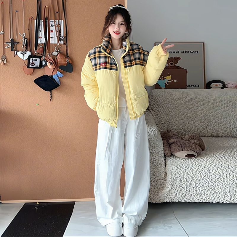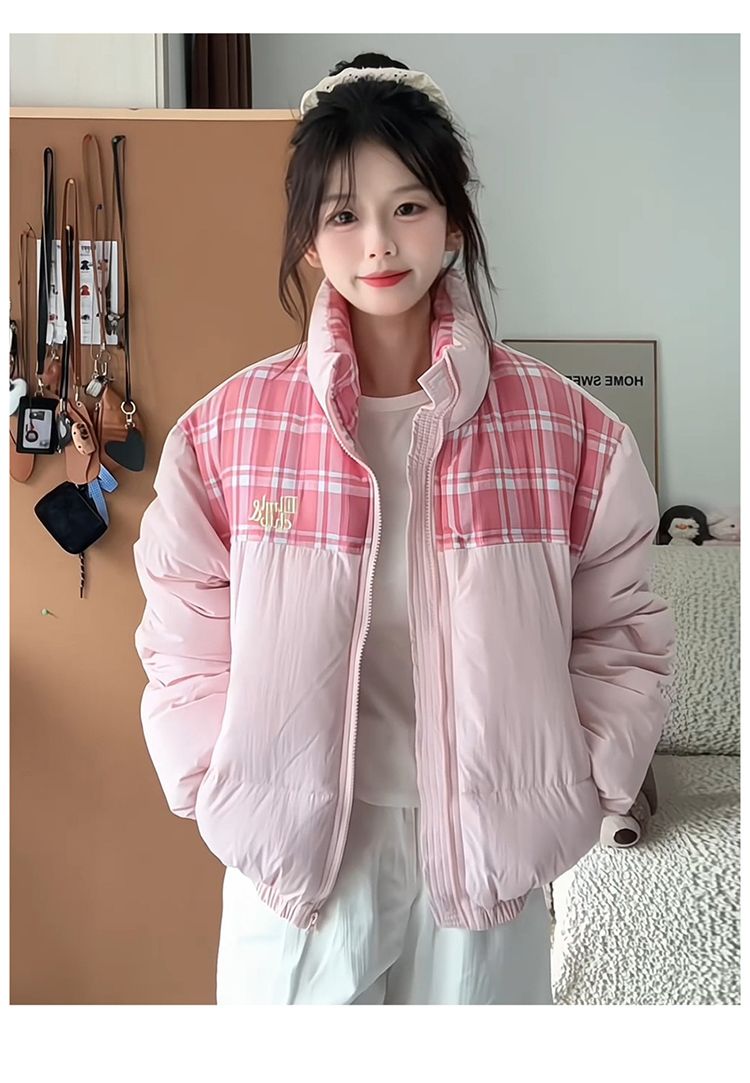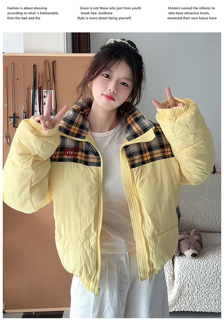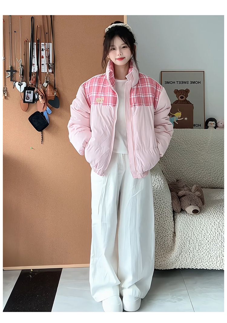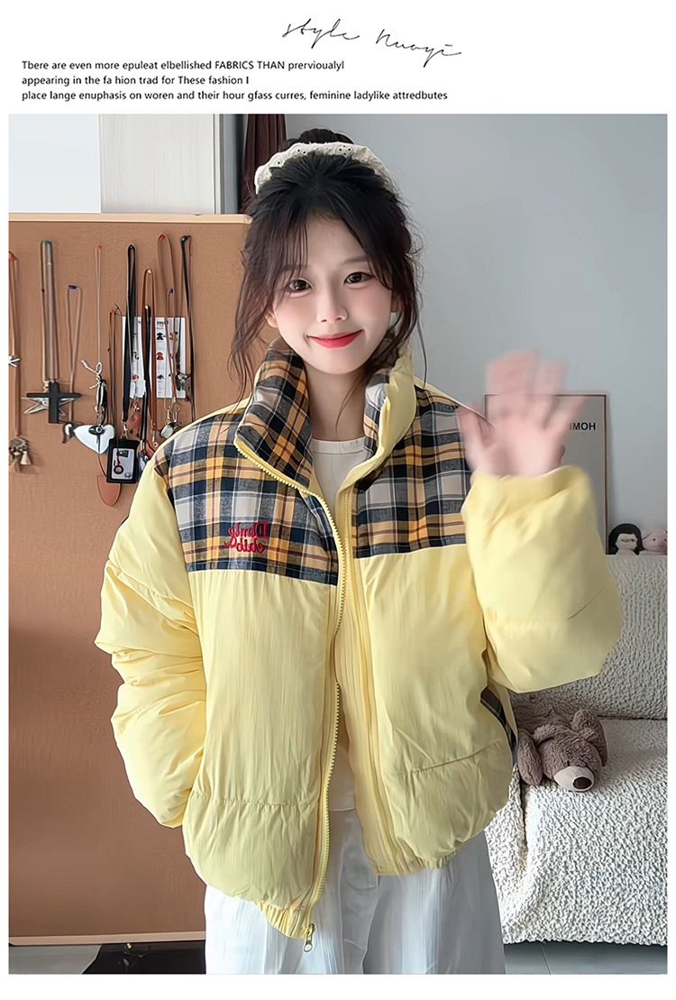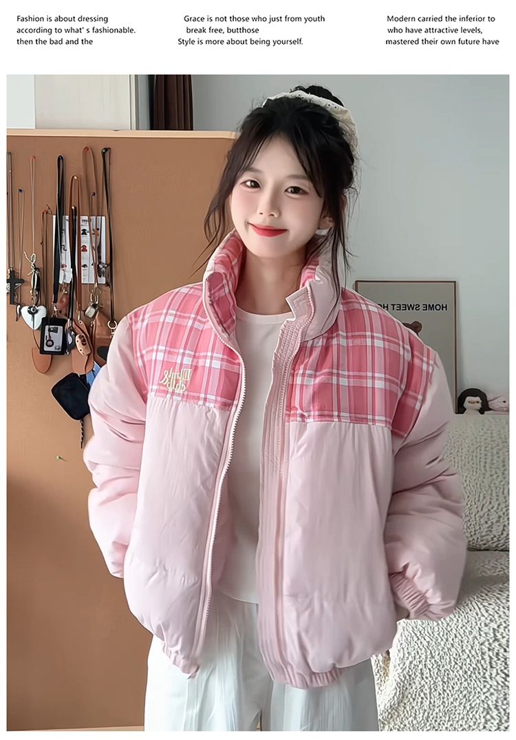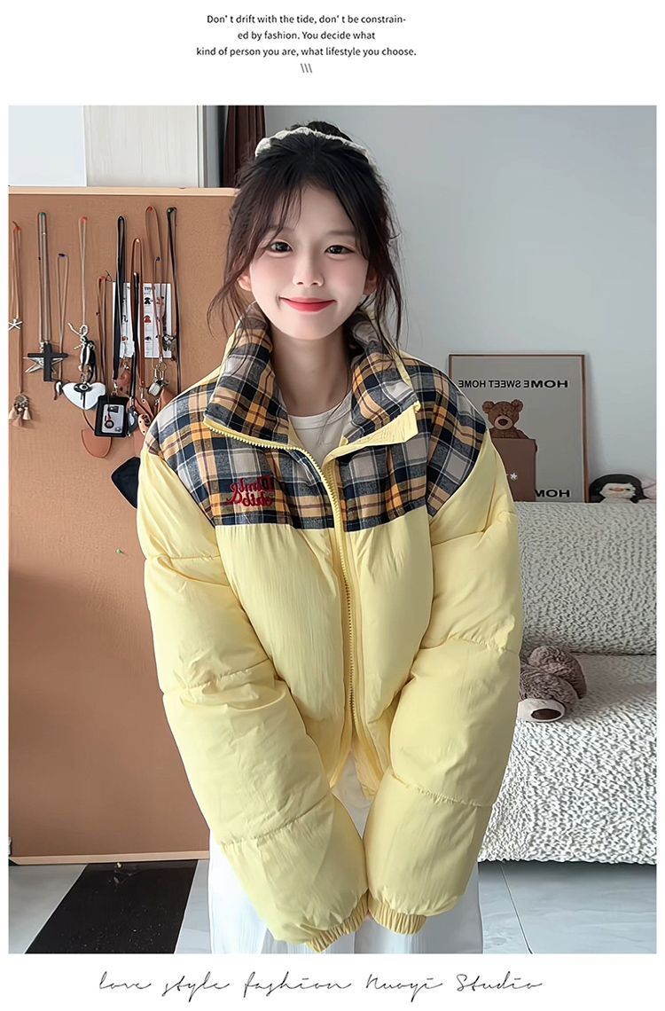MY14252# 新款韩版拼接格子立领棉服外套女个性百搭休闲棉衣女女裝貨源服裝批發