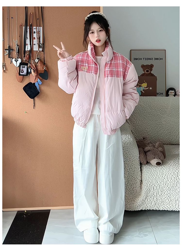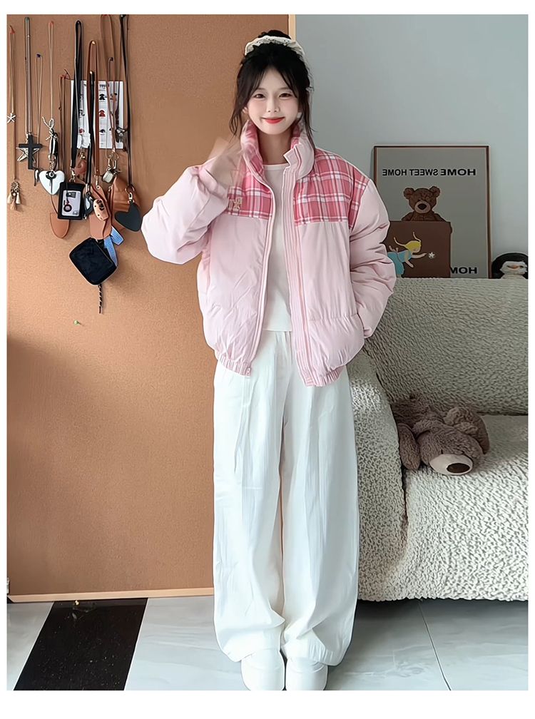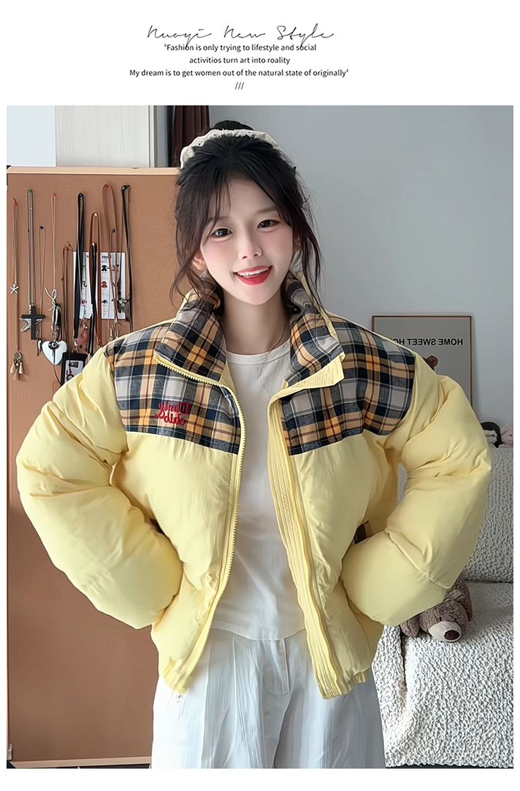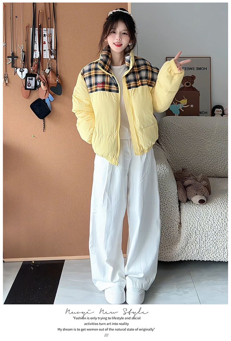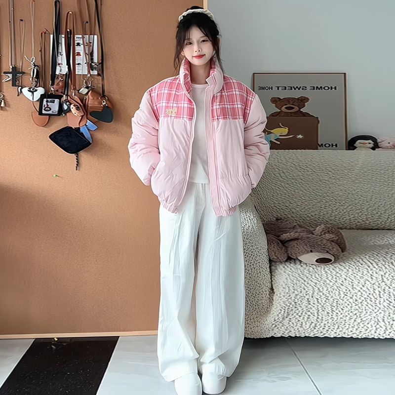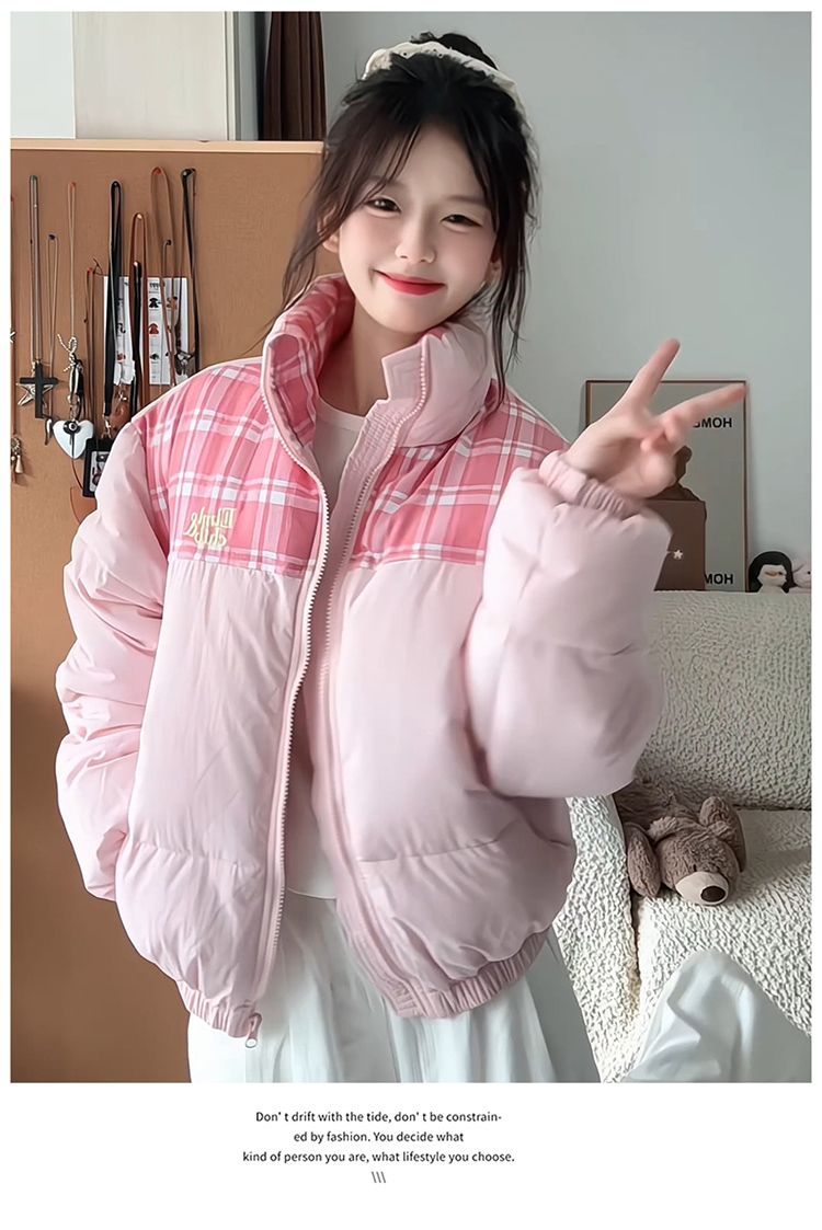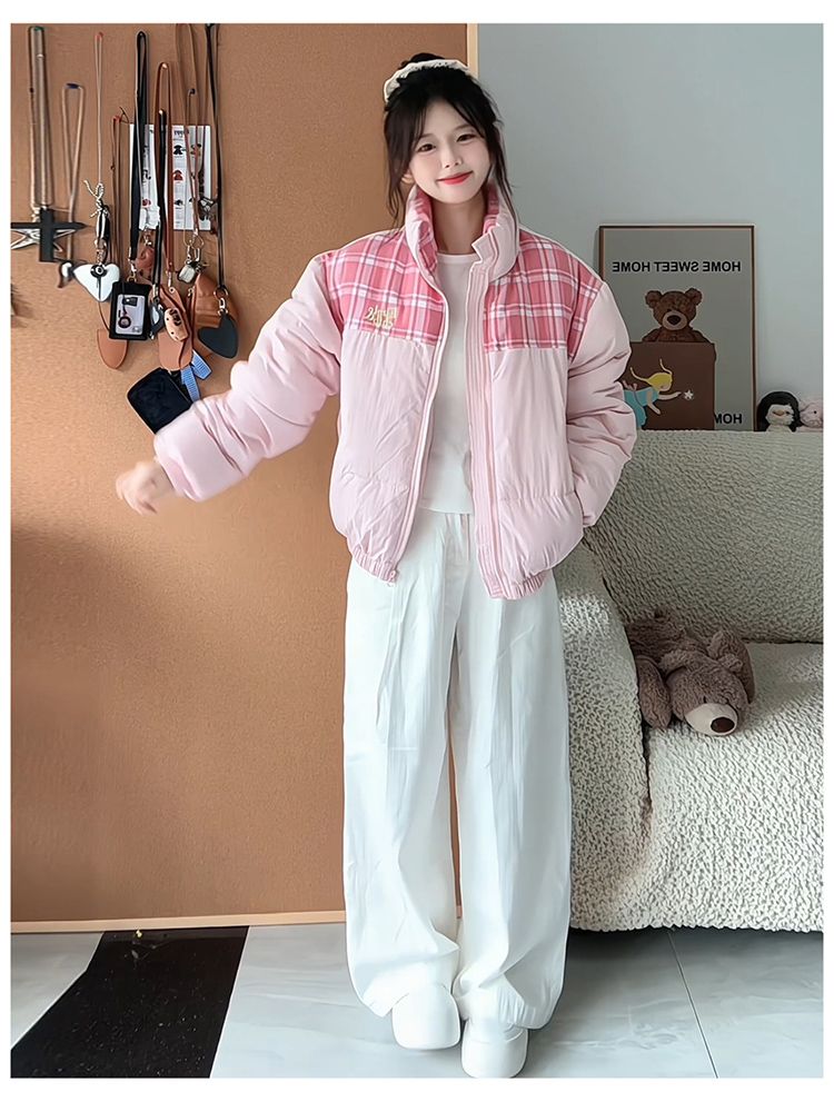 MY14252# 新款韩版拼接格子立领棉服外套女个性百搭休闲棉衣女女裝貨源服裝批發