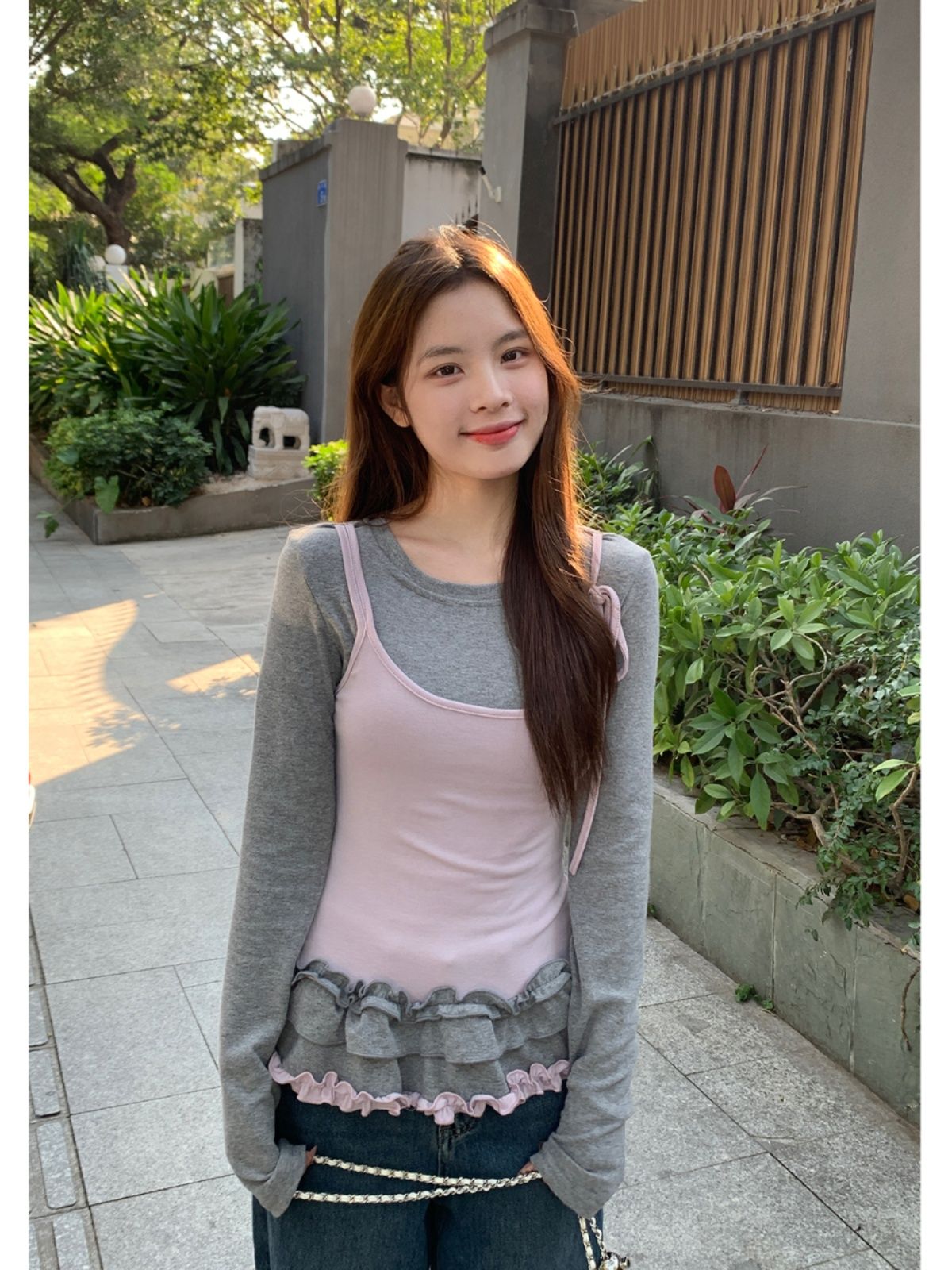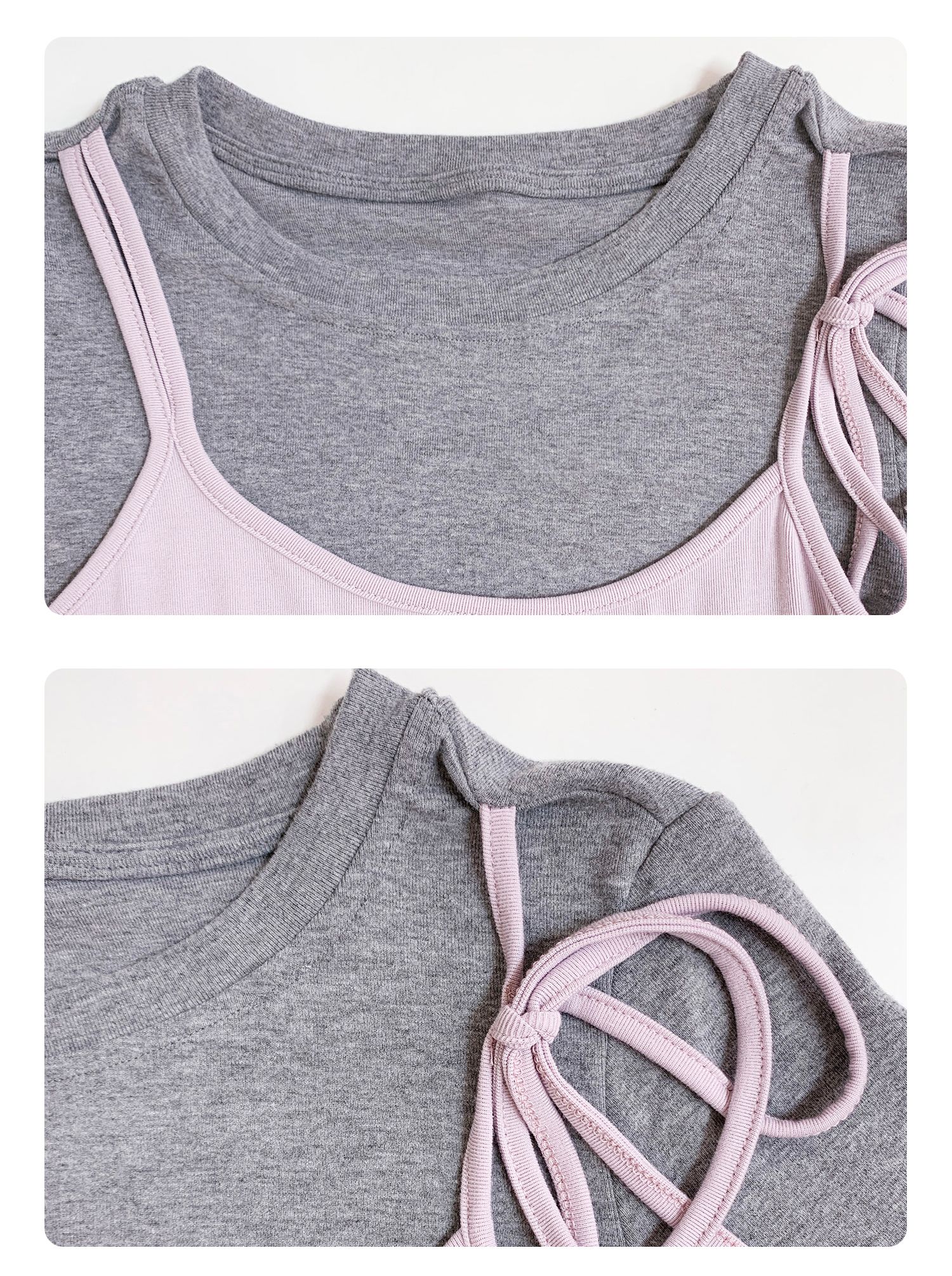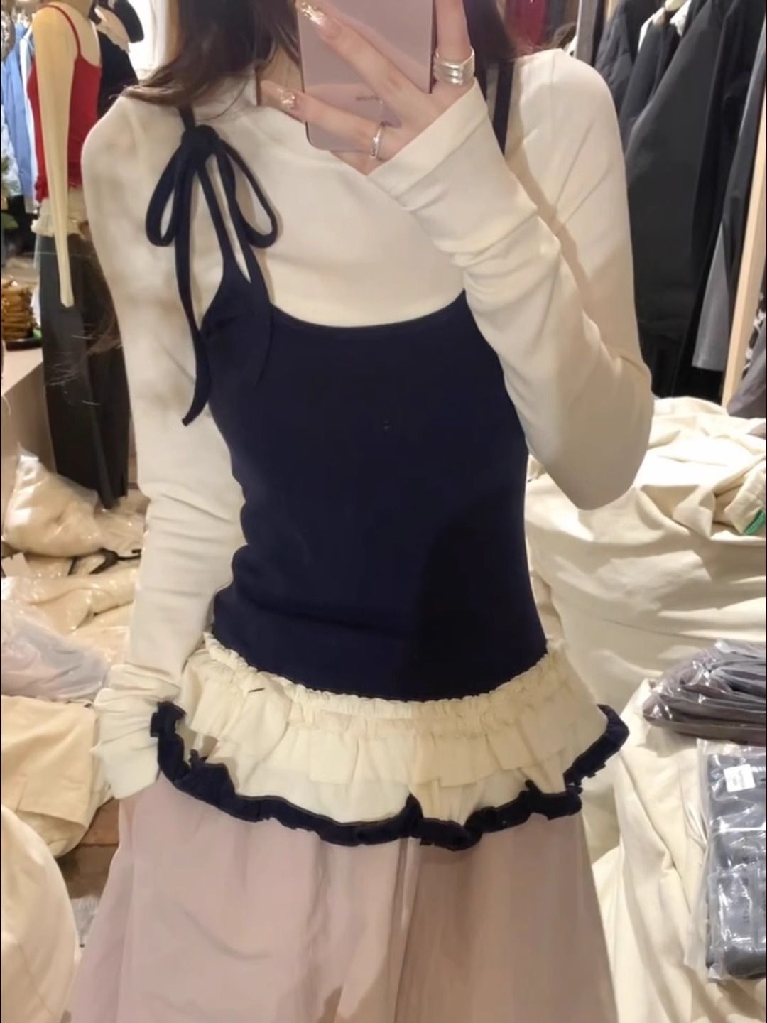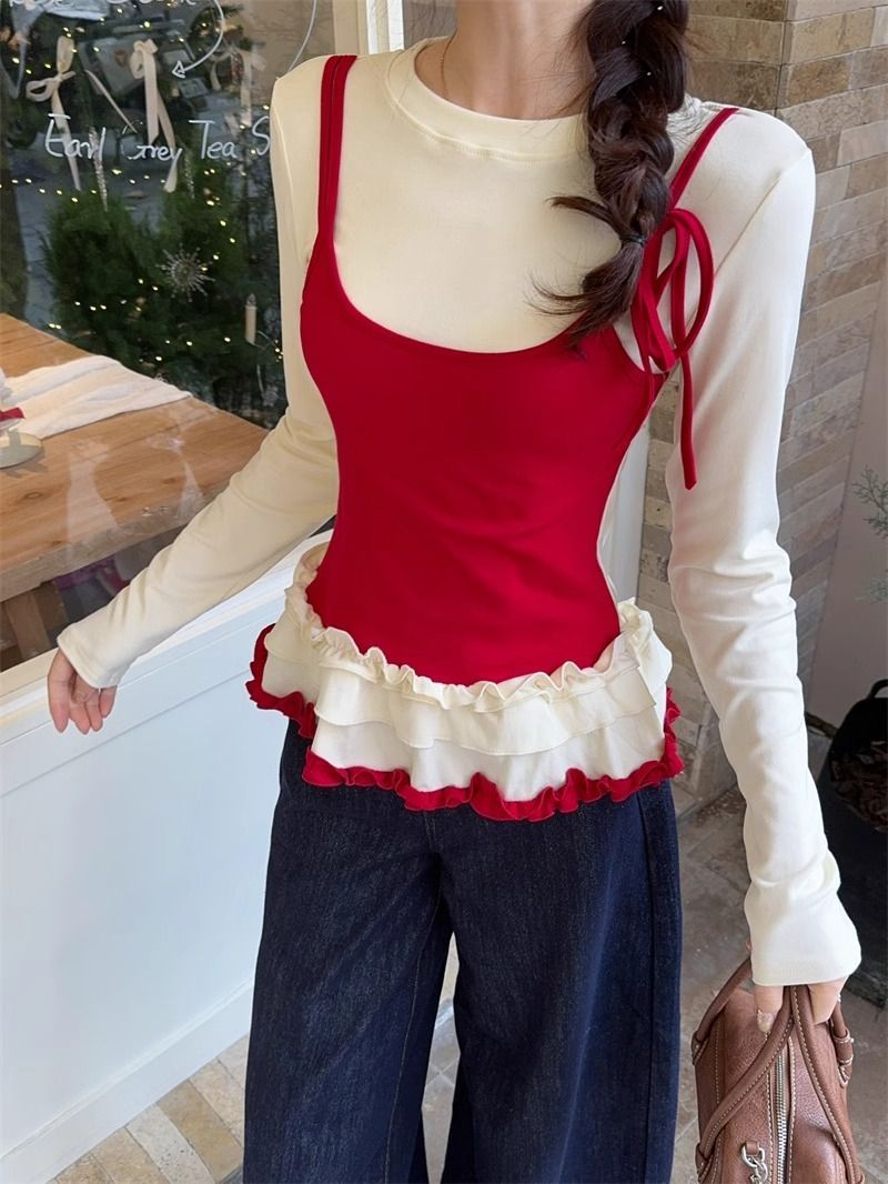 MY14315# 别致撞色假两件拼接长袖T恤女设计感收腰内搭小个子上衣女裝貨源服裝批發
