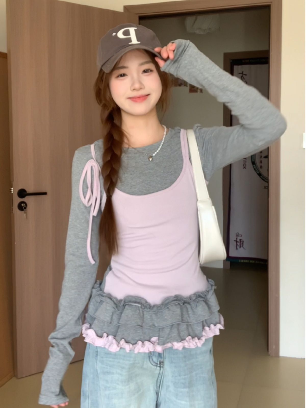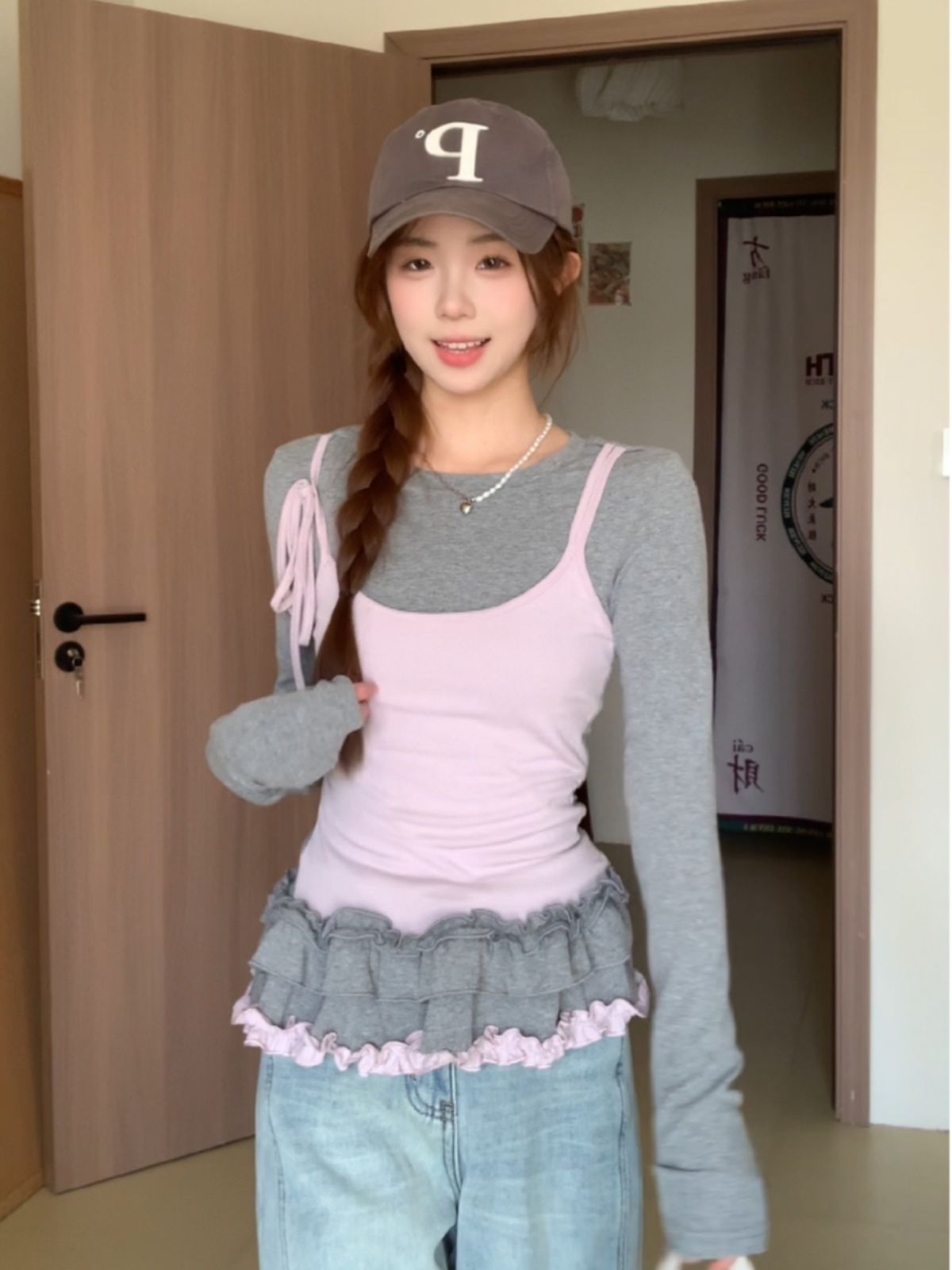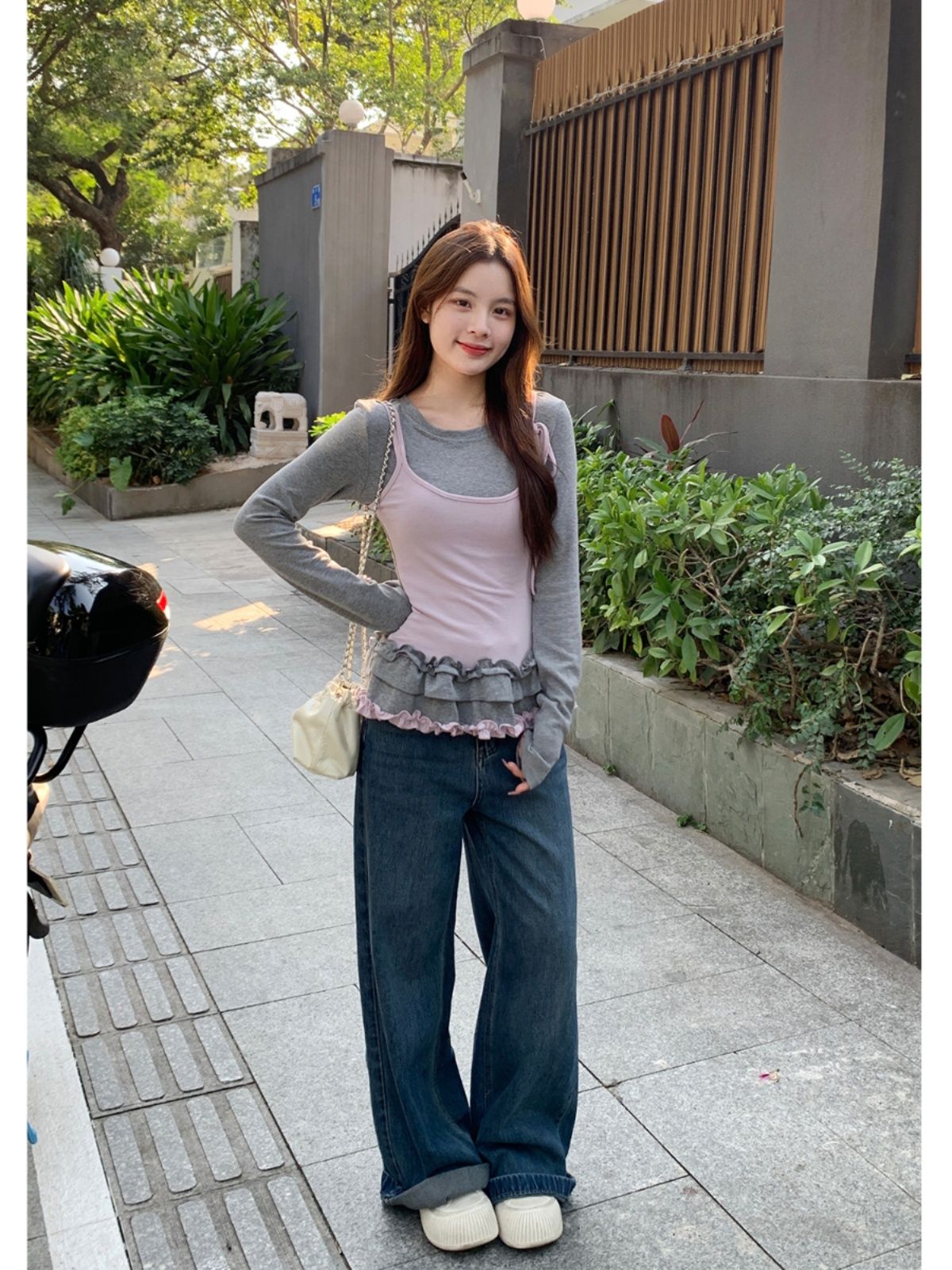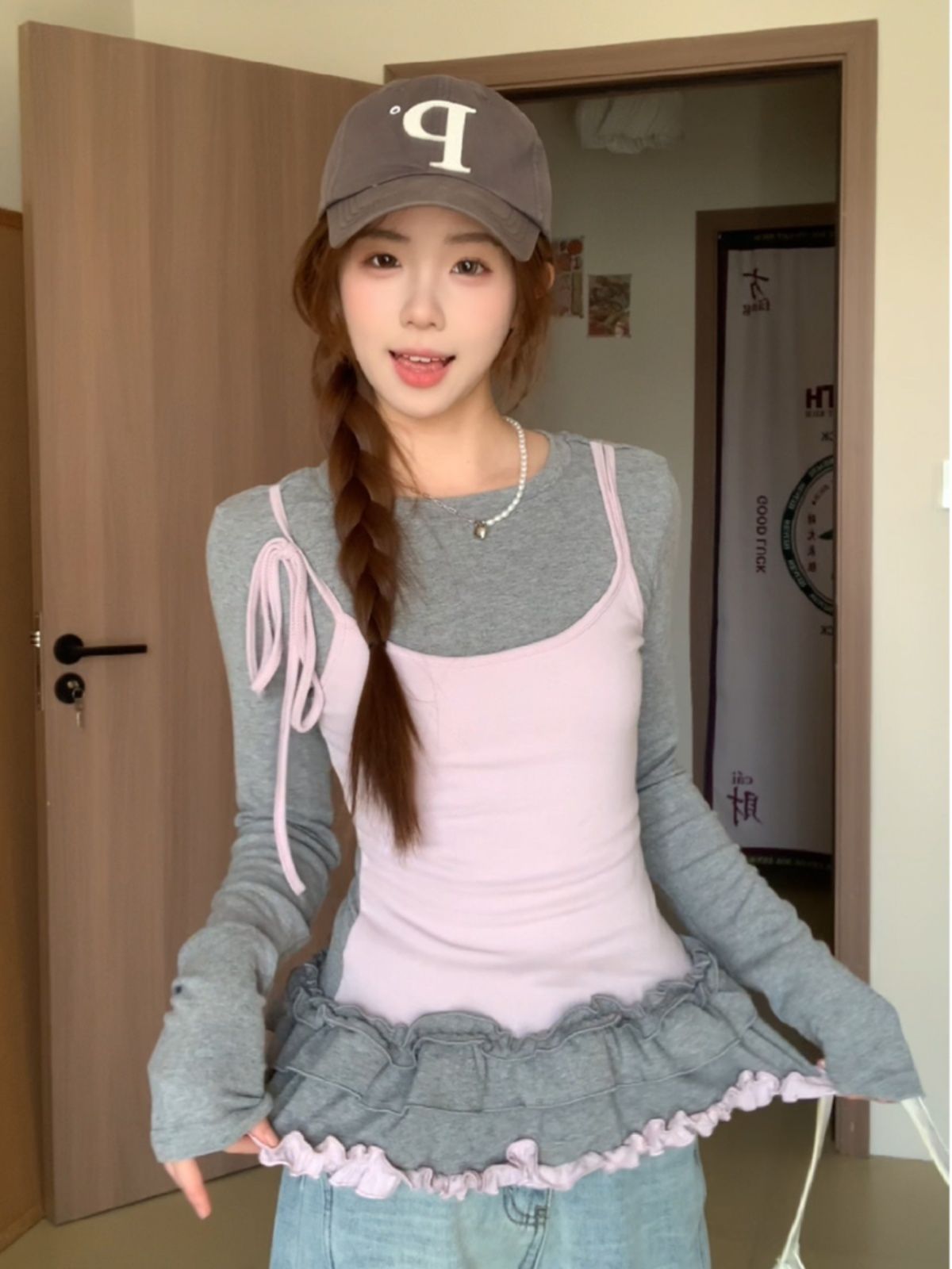 MY14315# 别致撞色假两件拼接长袖T恤女设计感收腰内搭小个子上衣女裝貨源服裝批發