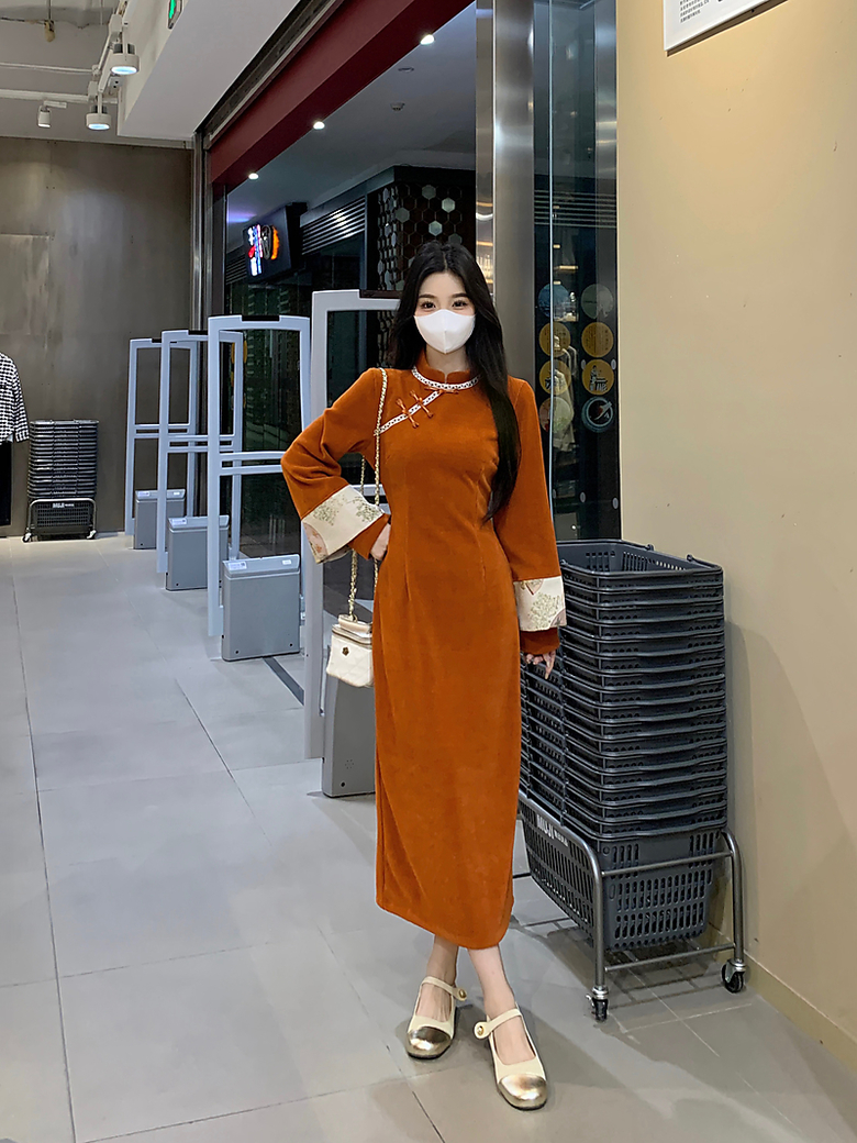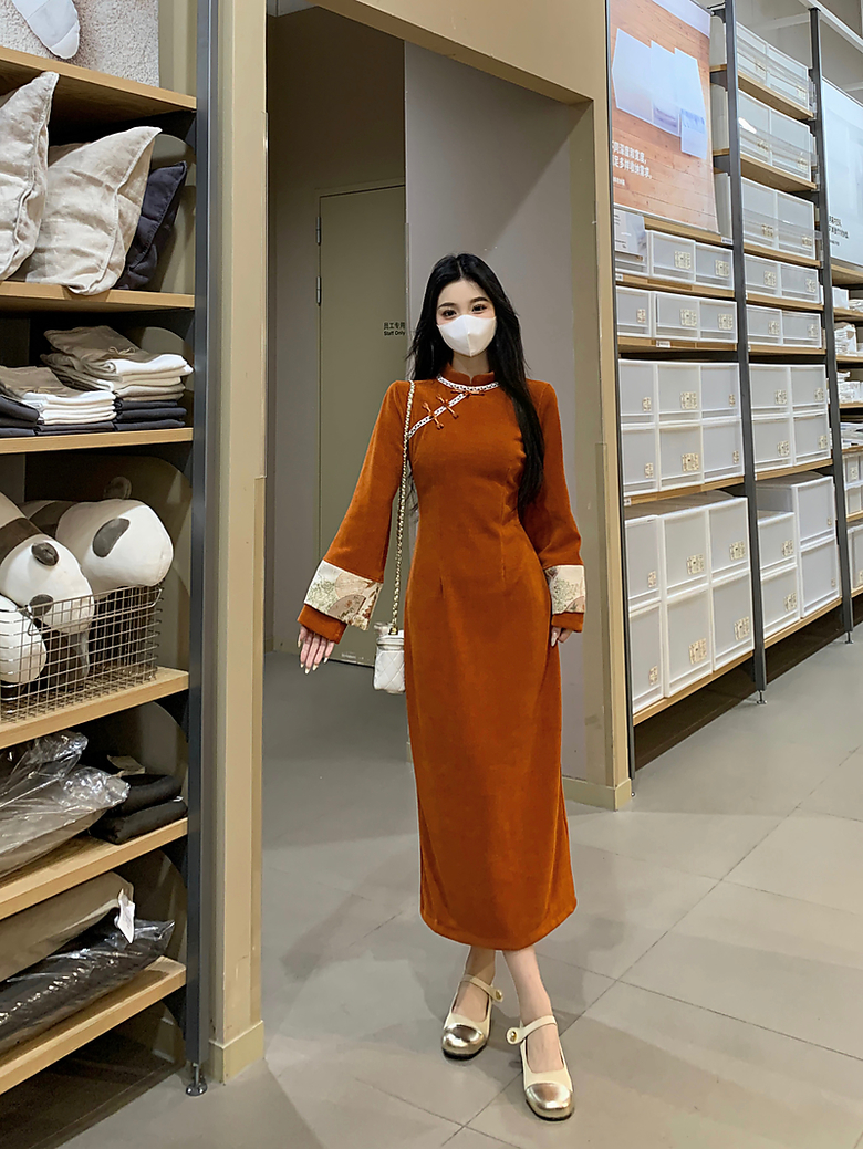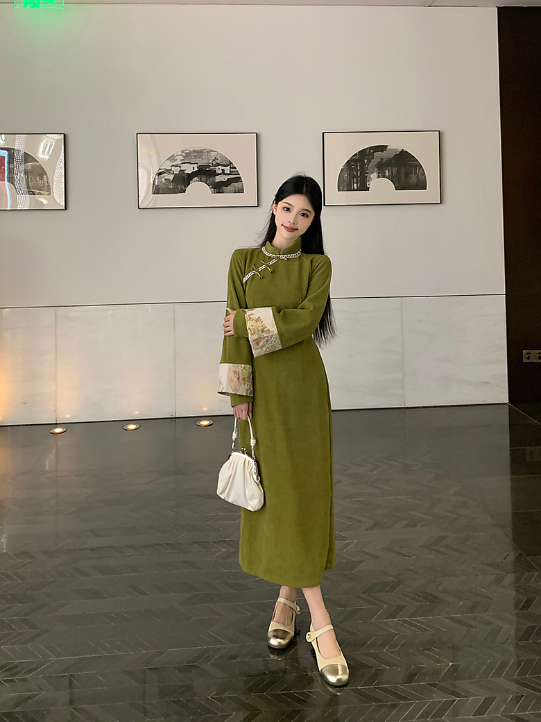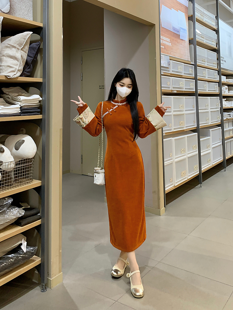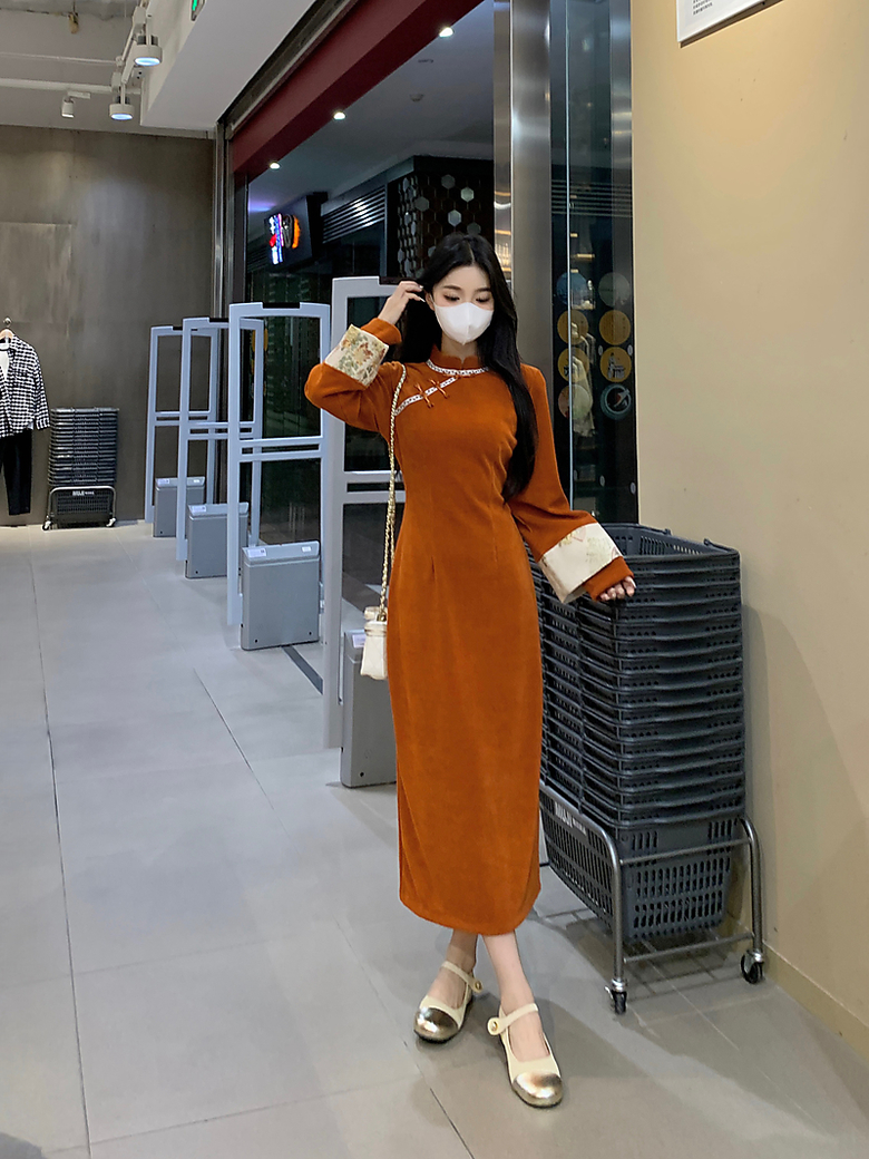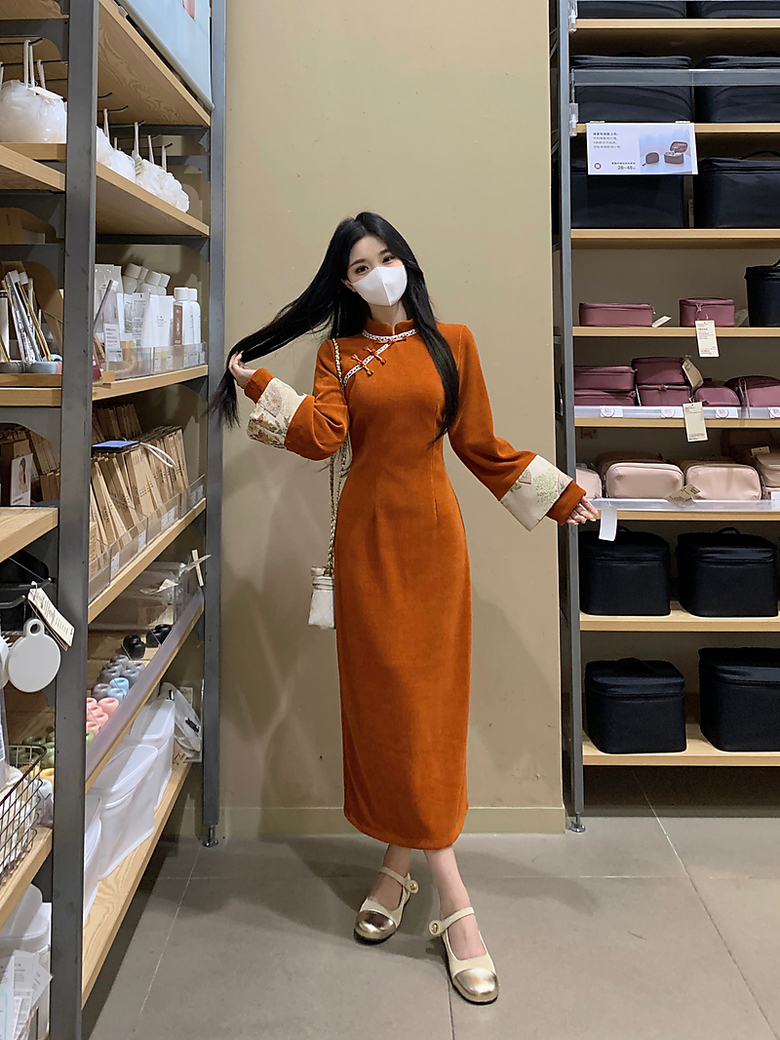 MY14329# 新中式国风一川枫叶复古改良旗袍女秋冬气质长袖连衣裙女裝貨源服裝批發