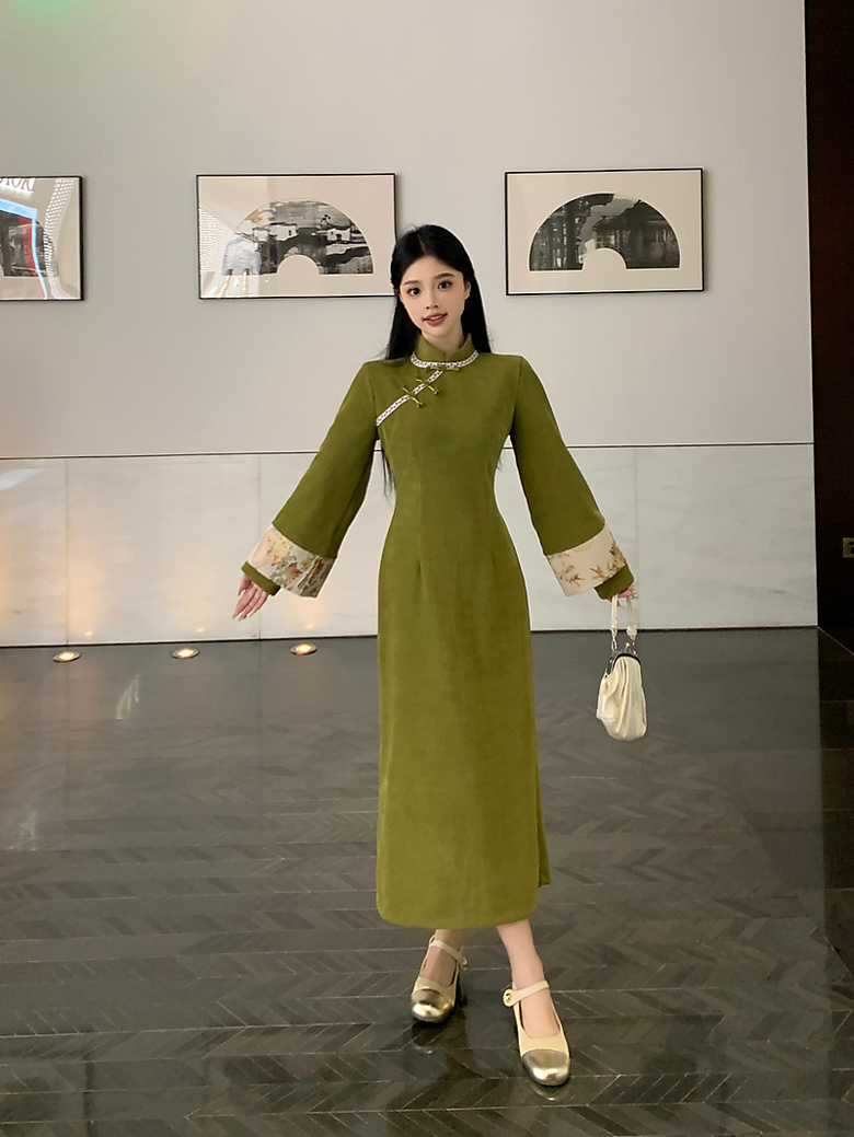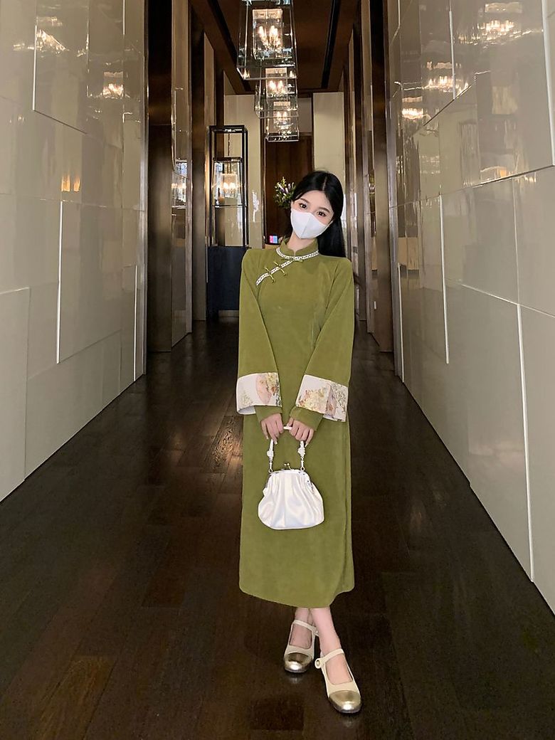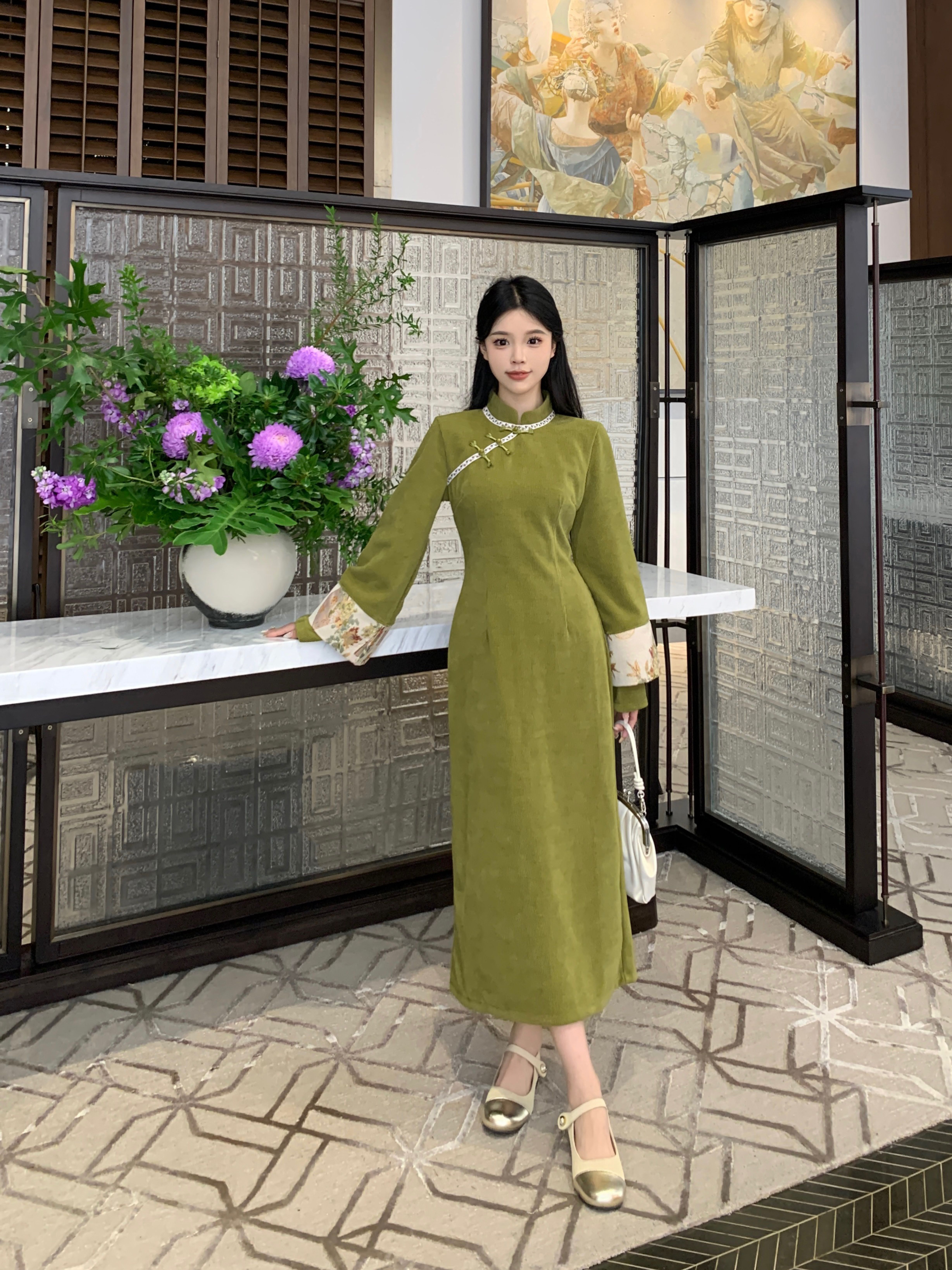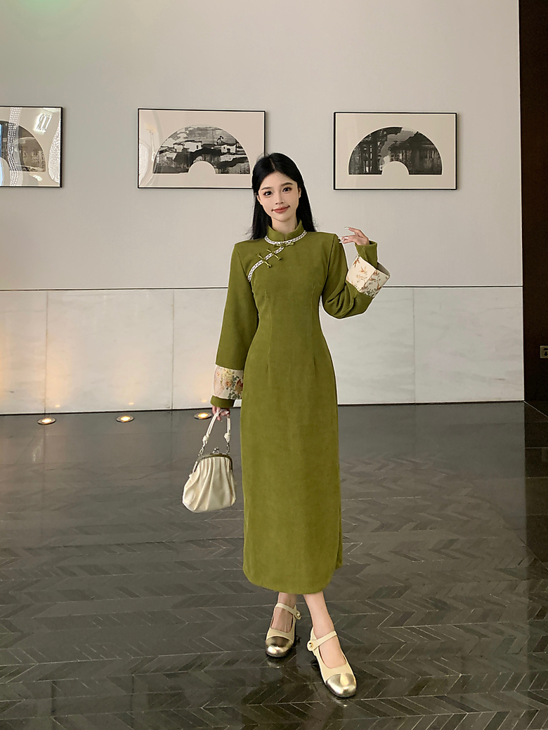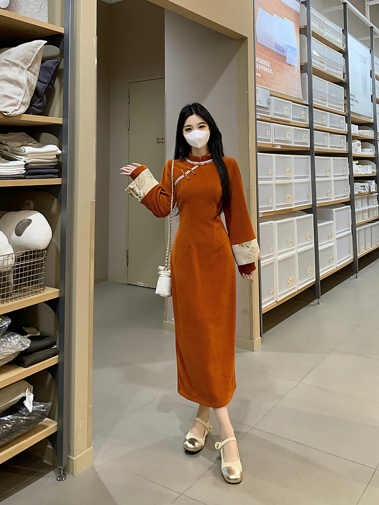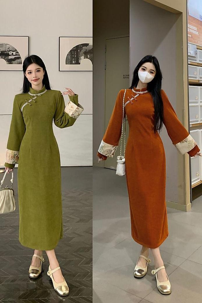 MY14329# 新中式国风一川枫叶复古改良旗袍女秋冬气质长袖连衣裙女裝貨源服裝批發