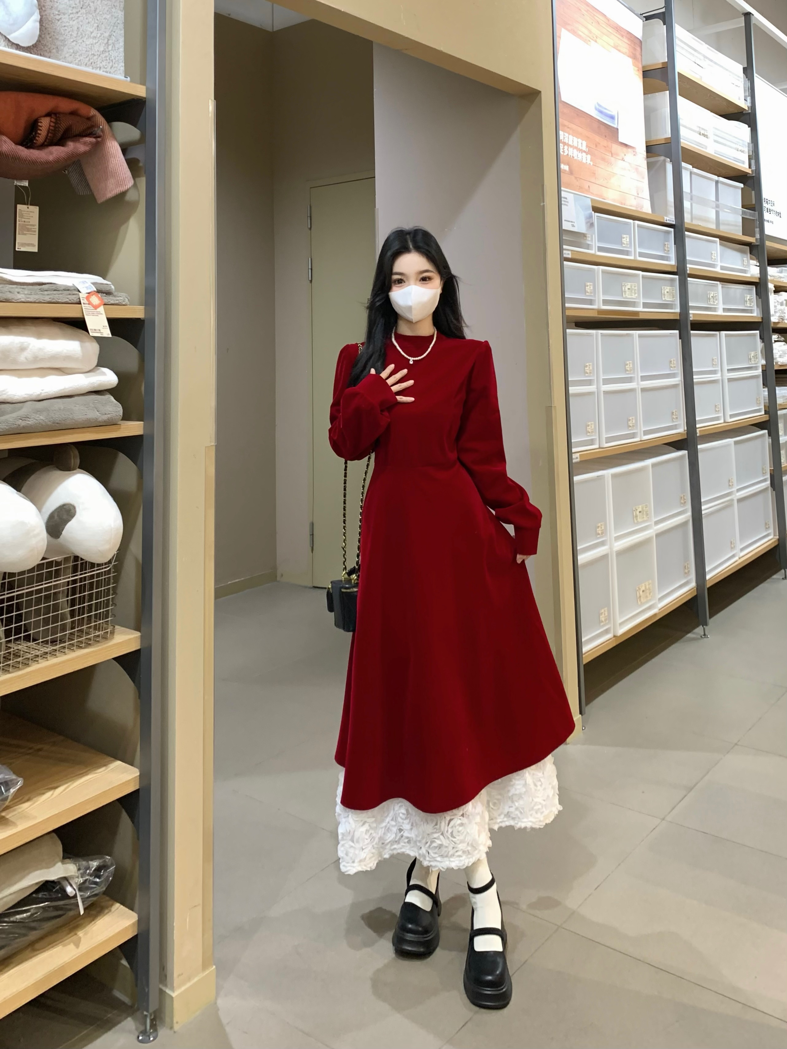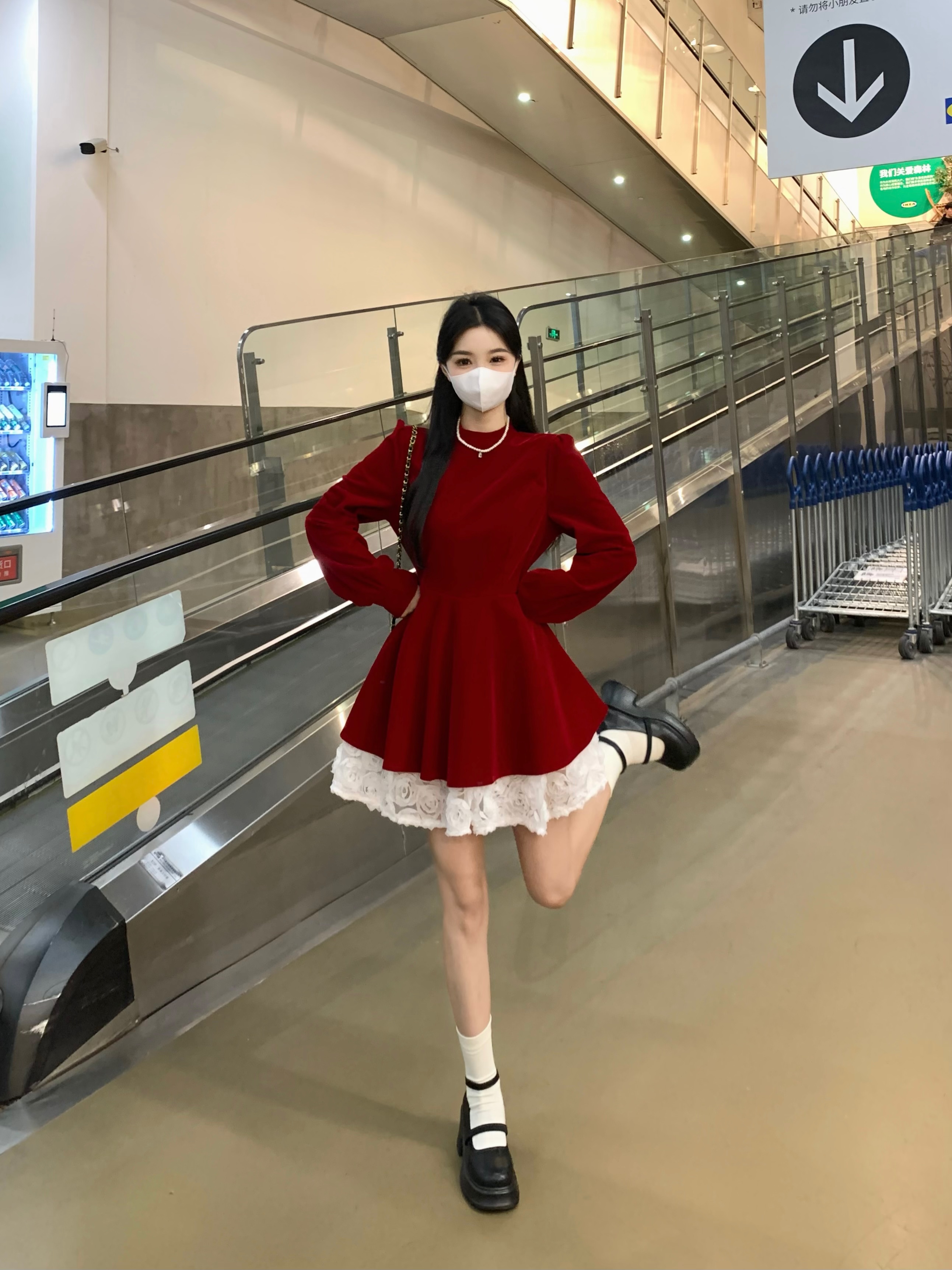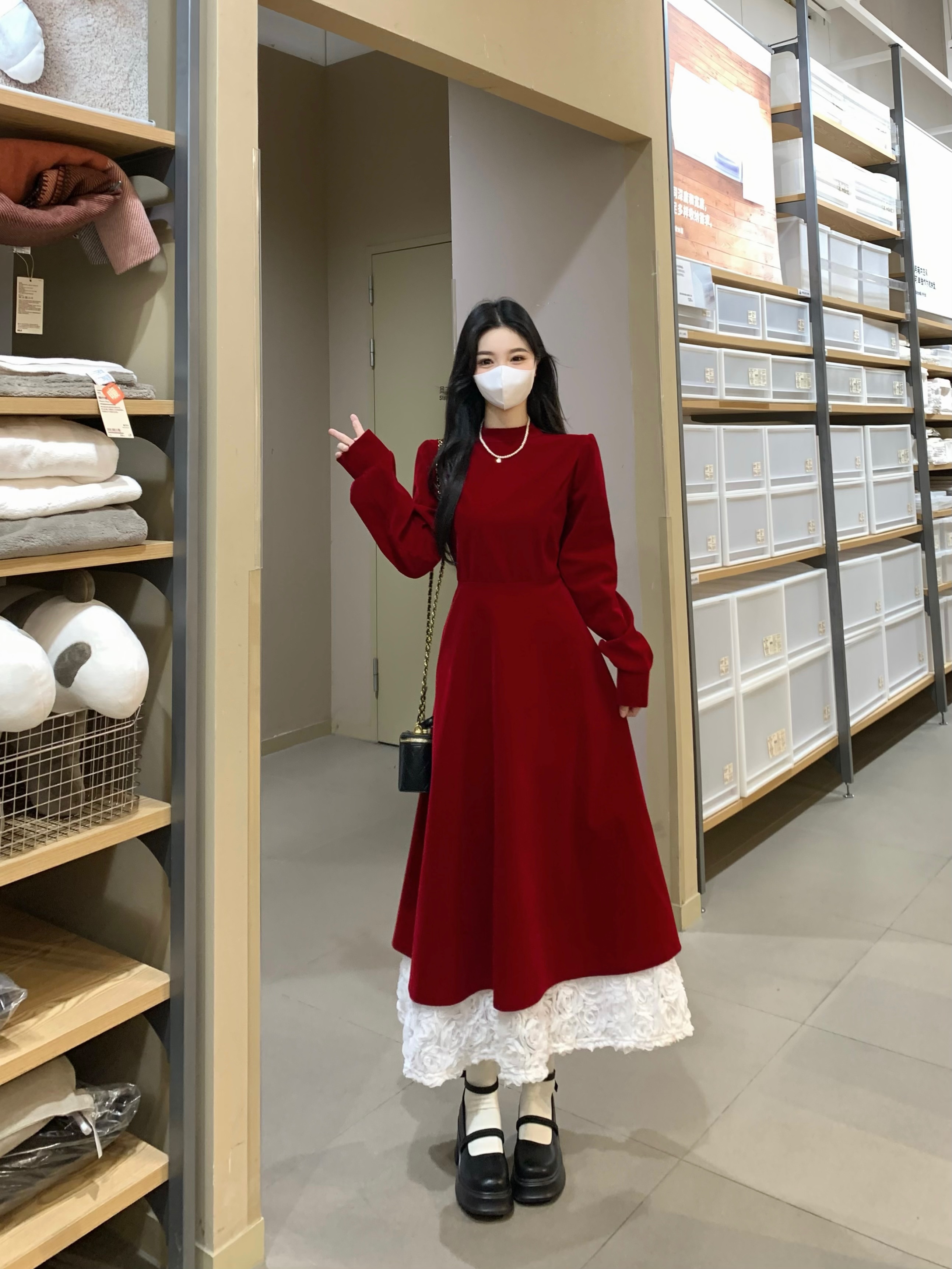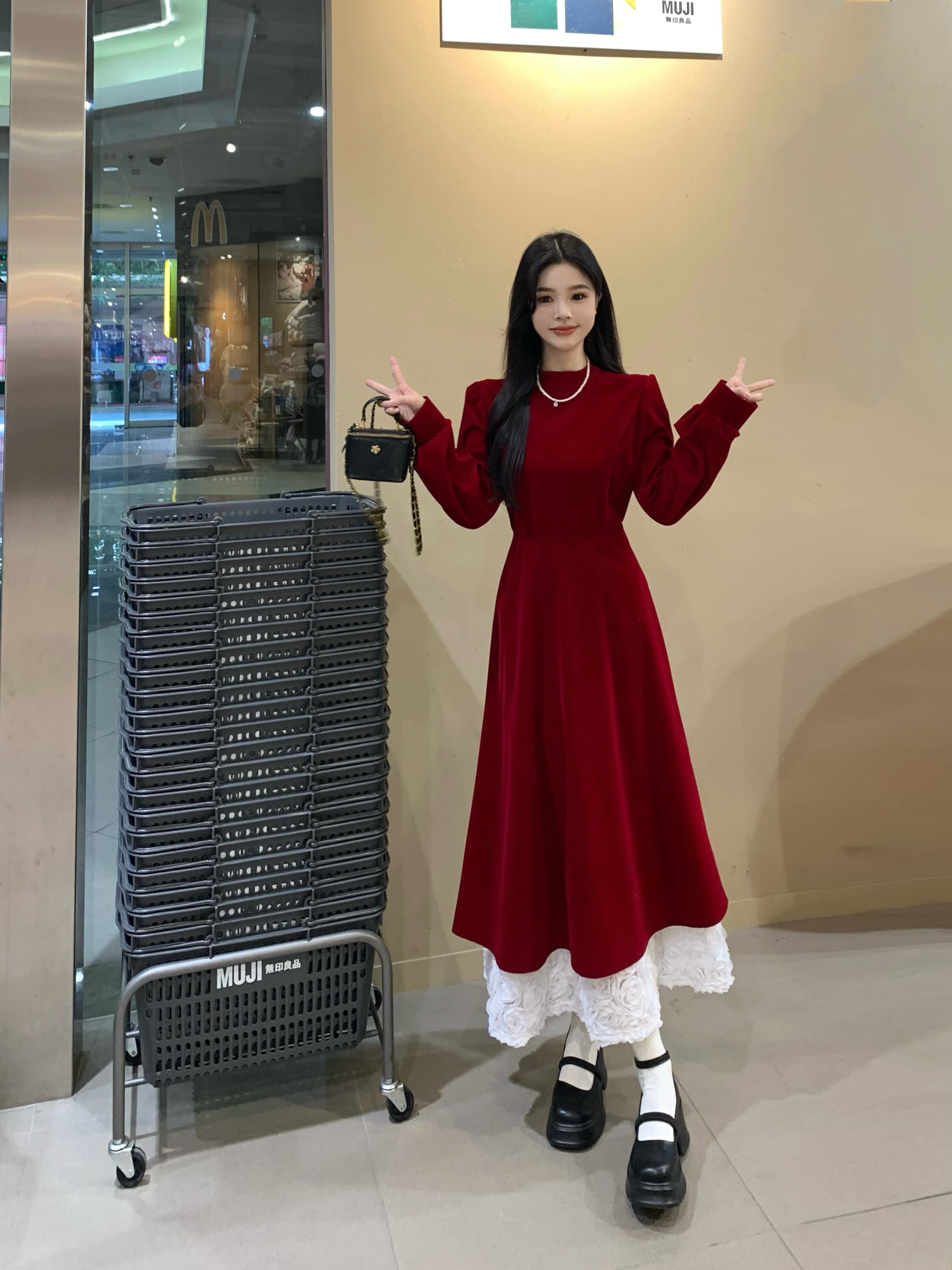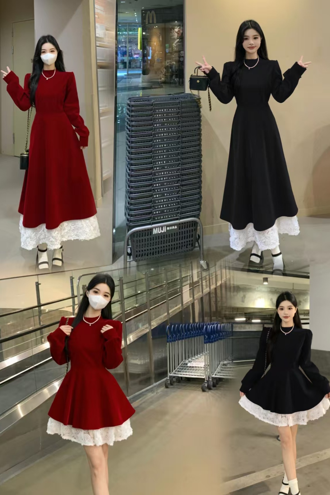 MY14332# 大码 玫瑰丝绒拼接连衣裙固色处理冬季收腰显瘦长短款A字裙女裝貨源服裝批發