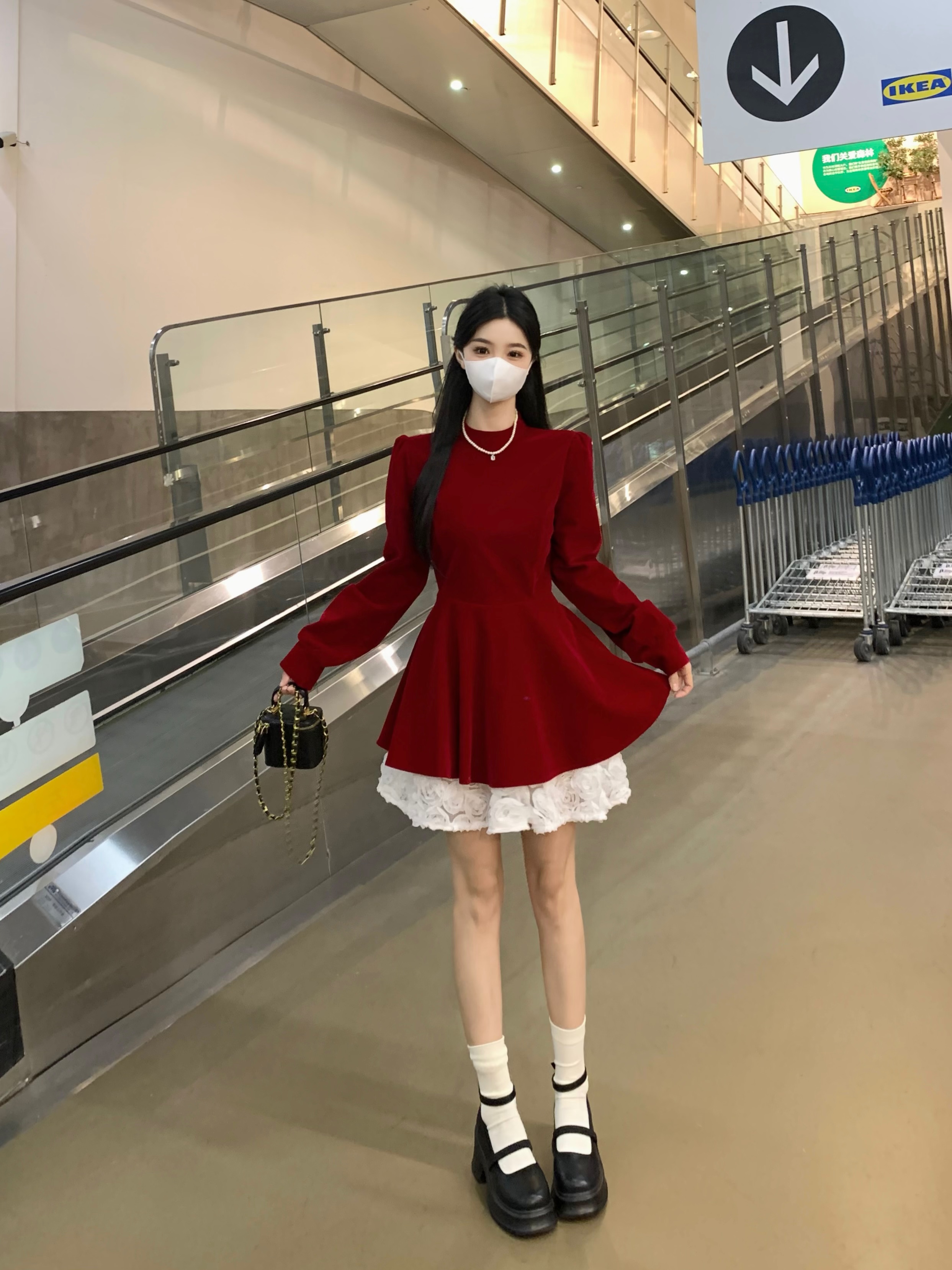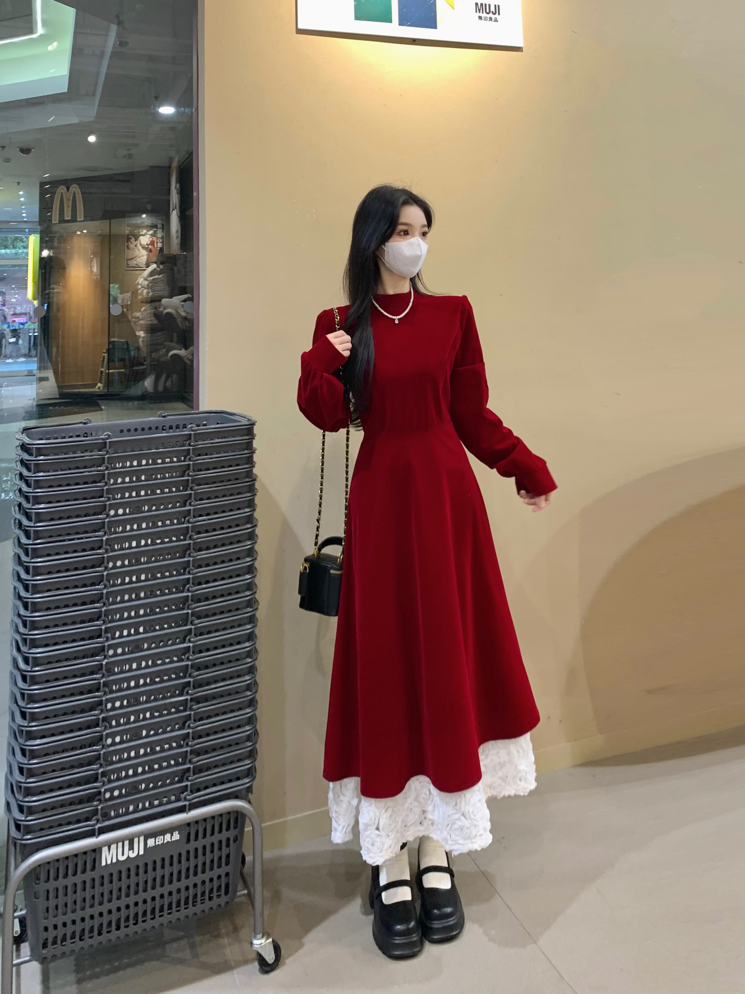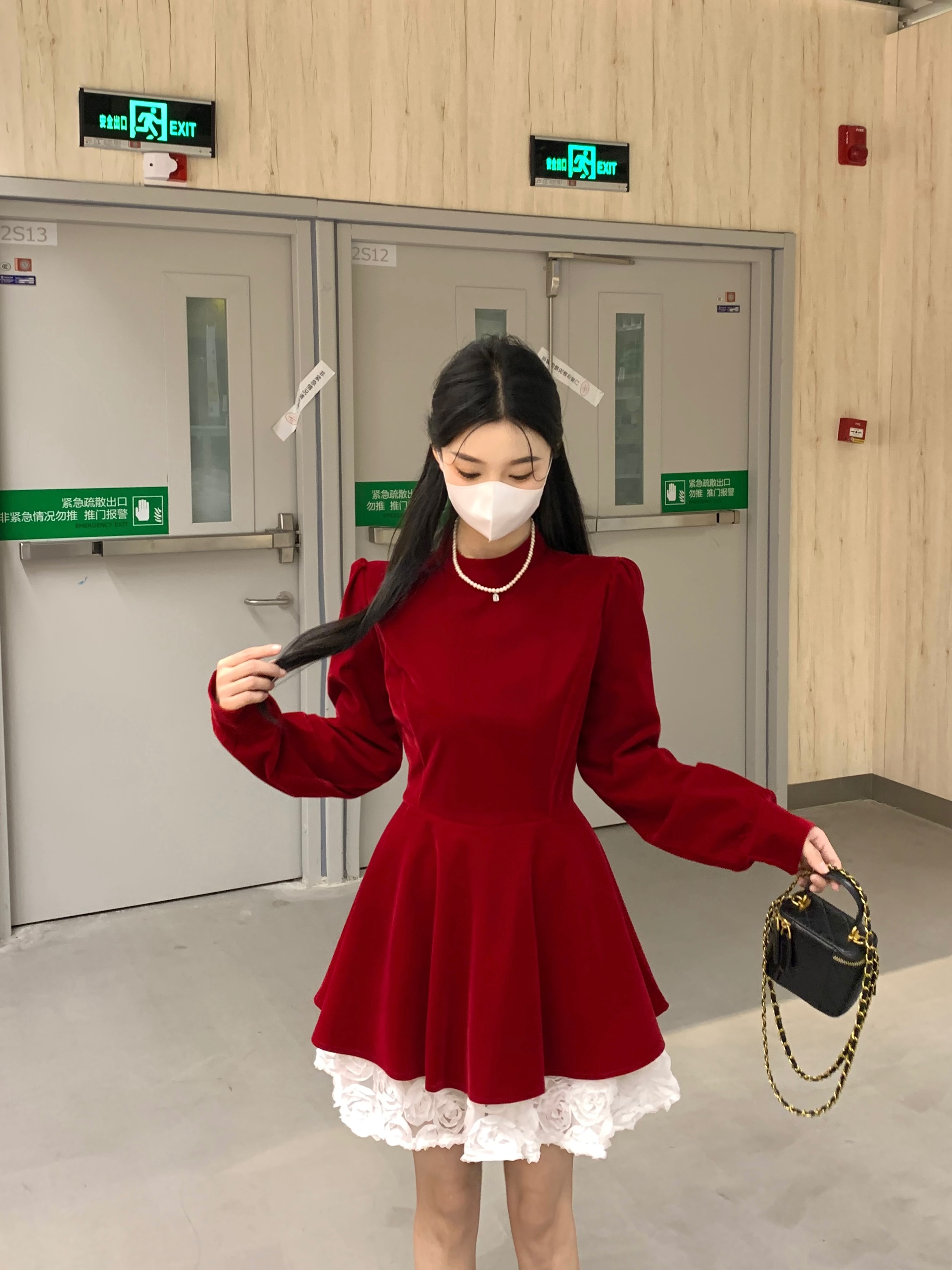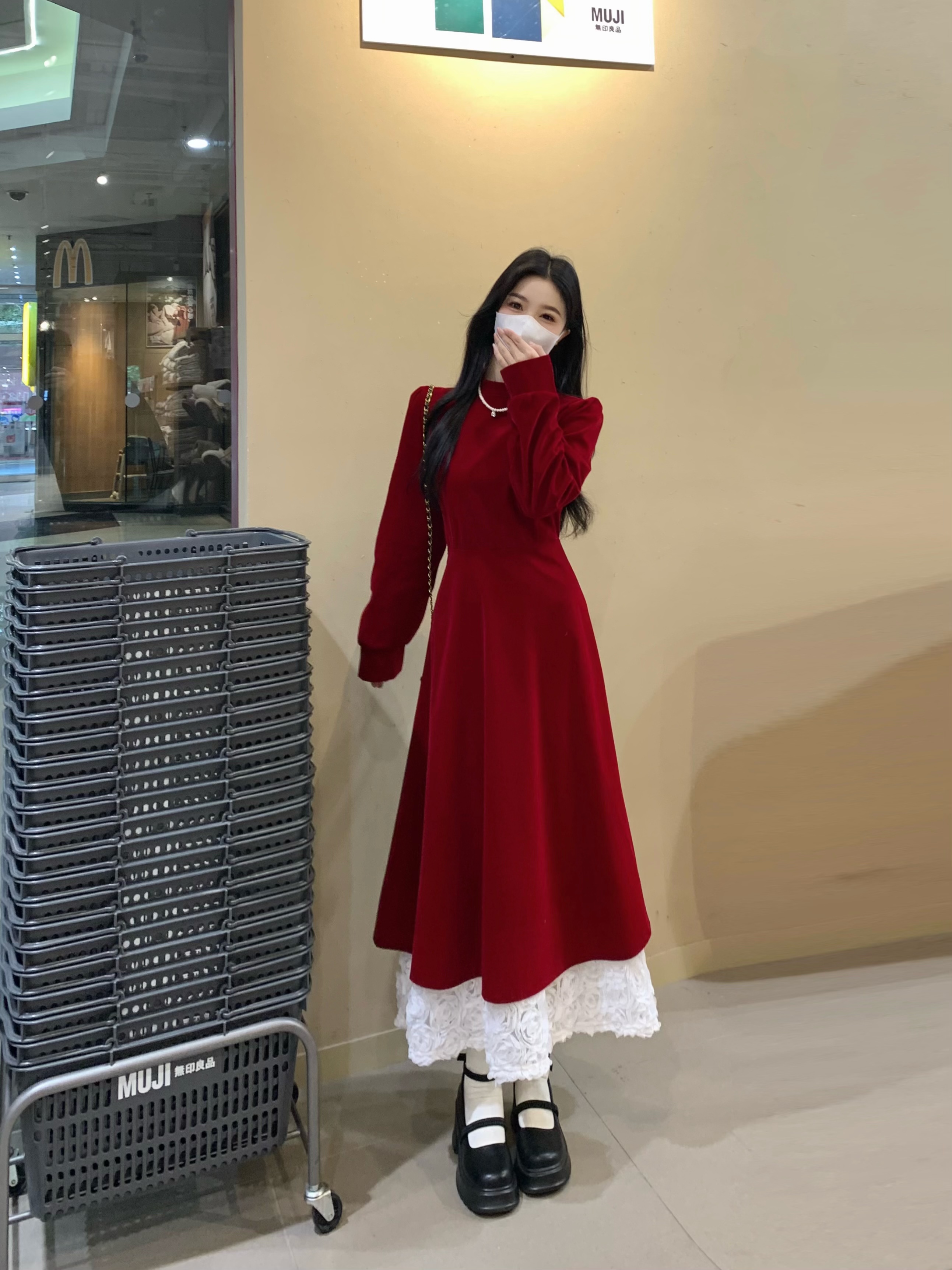 MY14332# 大码 玫瑰丝绒拼接连衣裙固色处理冬季收腰显瘦长短款A字裙女裝貨源服裝批發