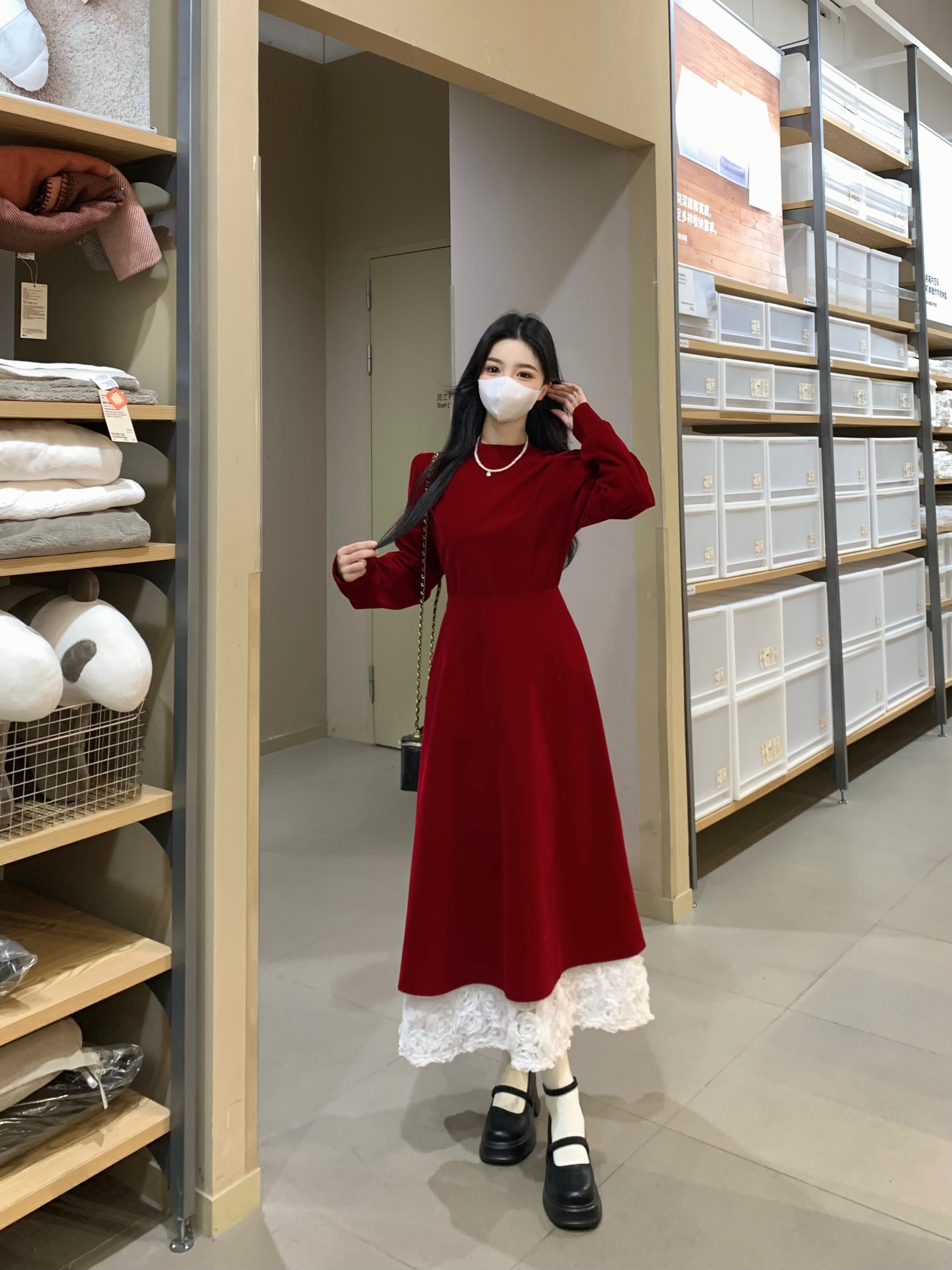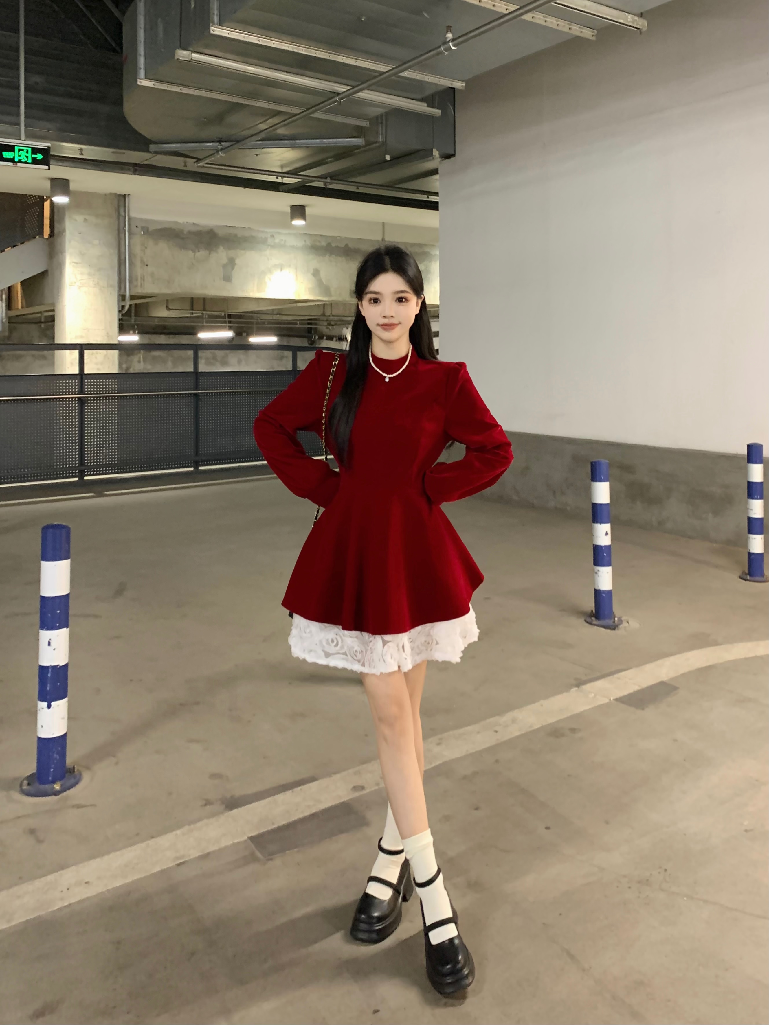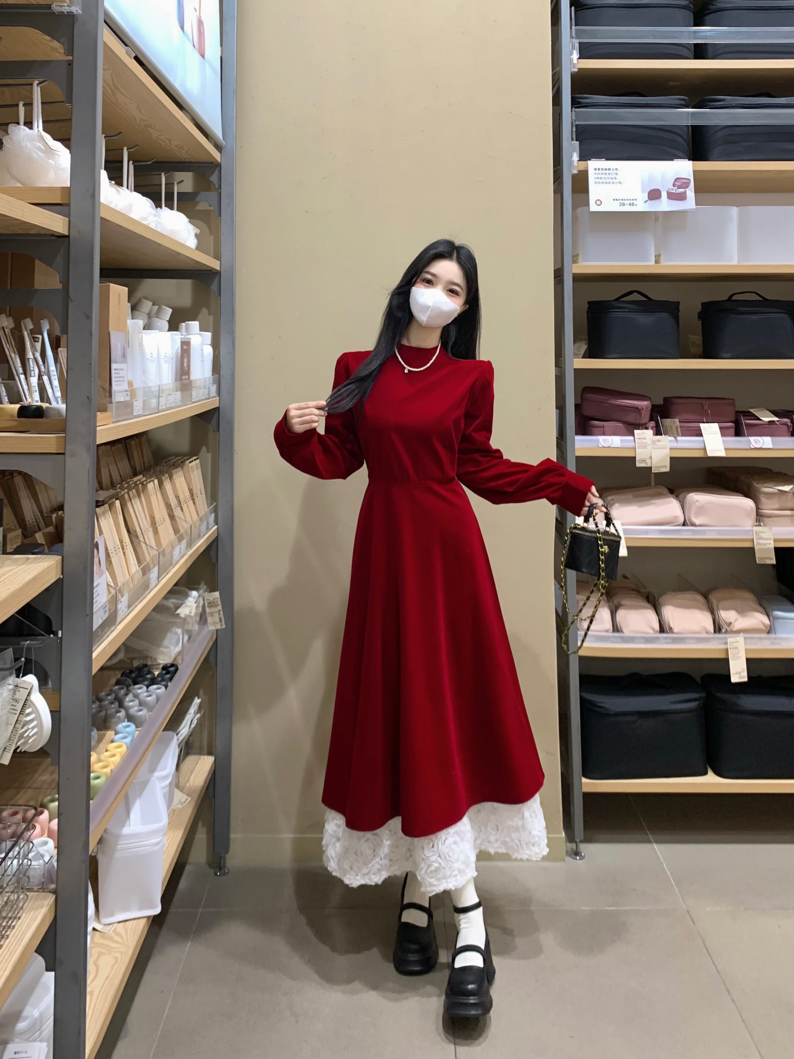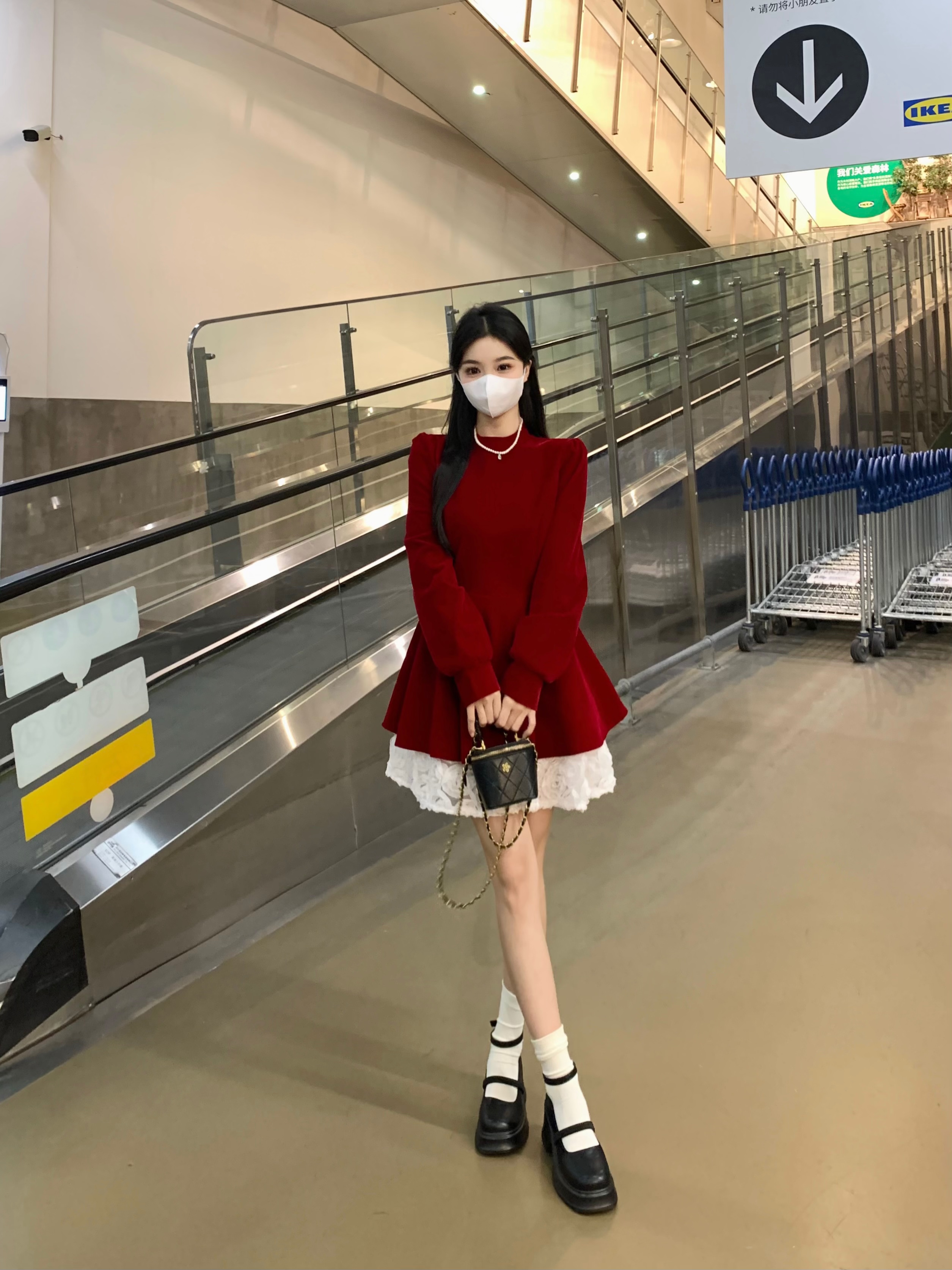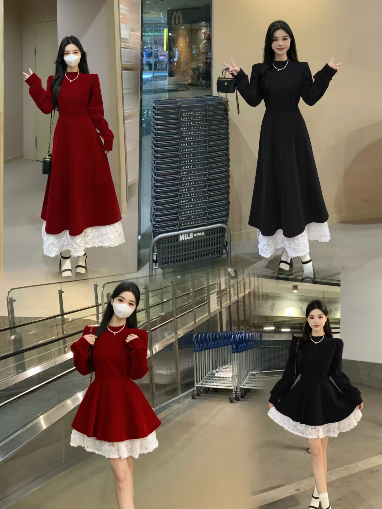 MY14332# 大码 玫瑰丝绒拼接连衣裙固色处理冬季收腰显瘦长短款A字裙女裝貨源服裝批發