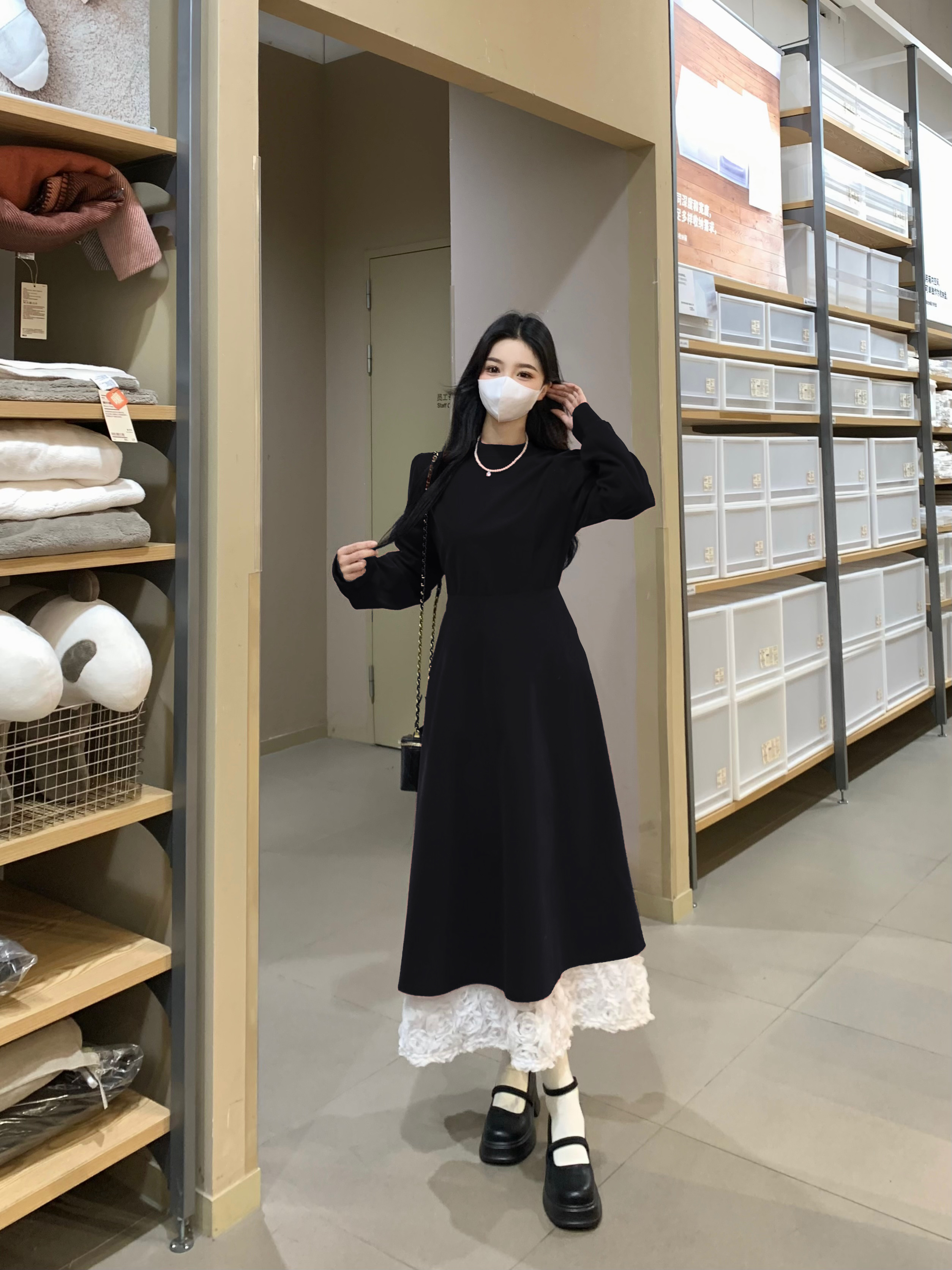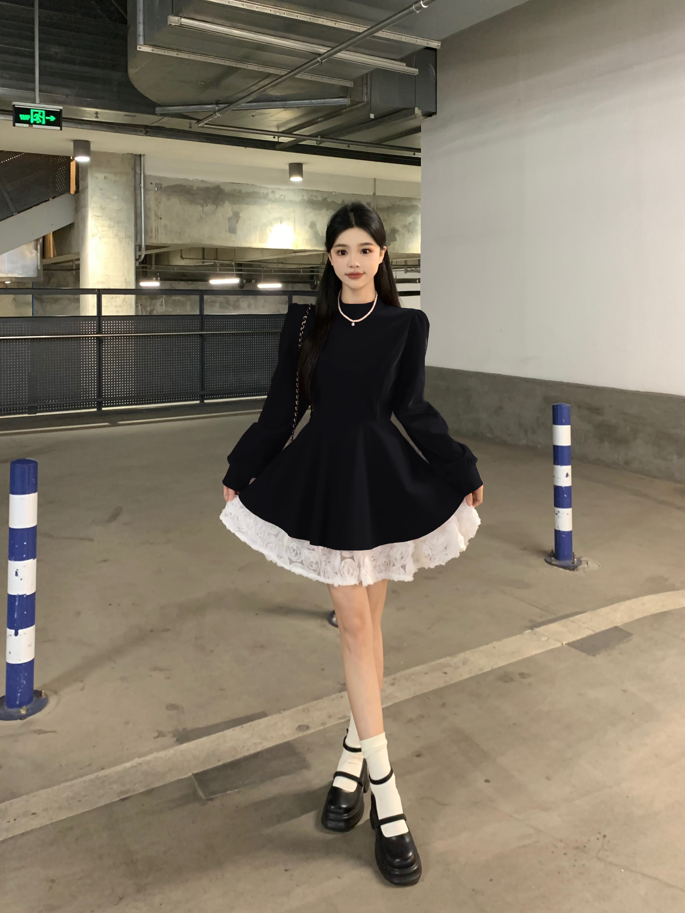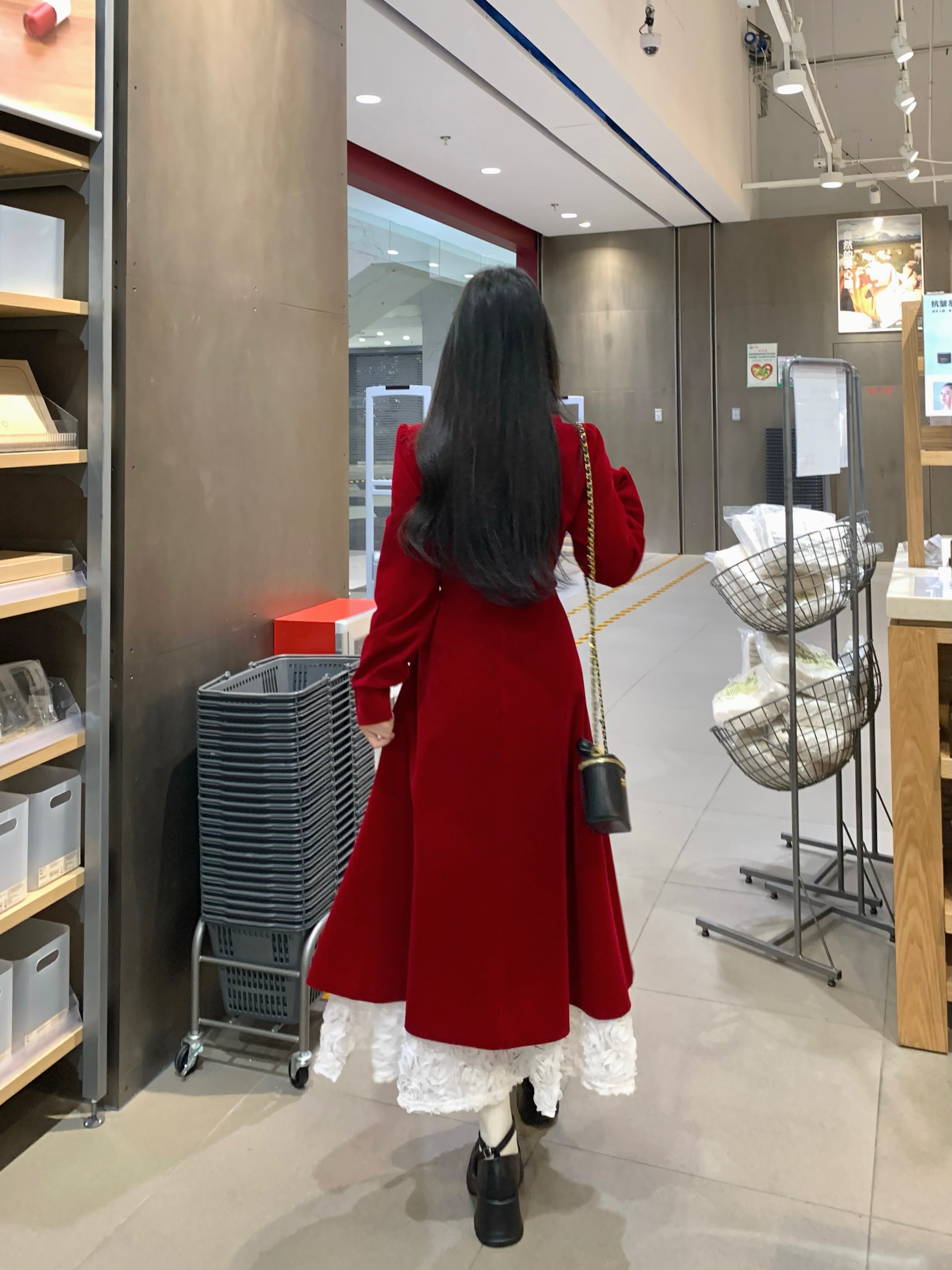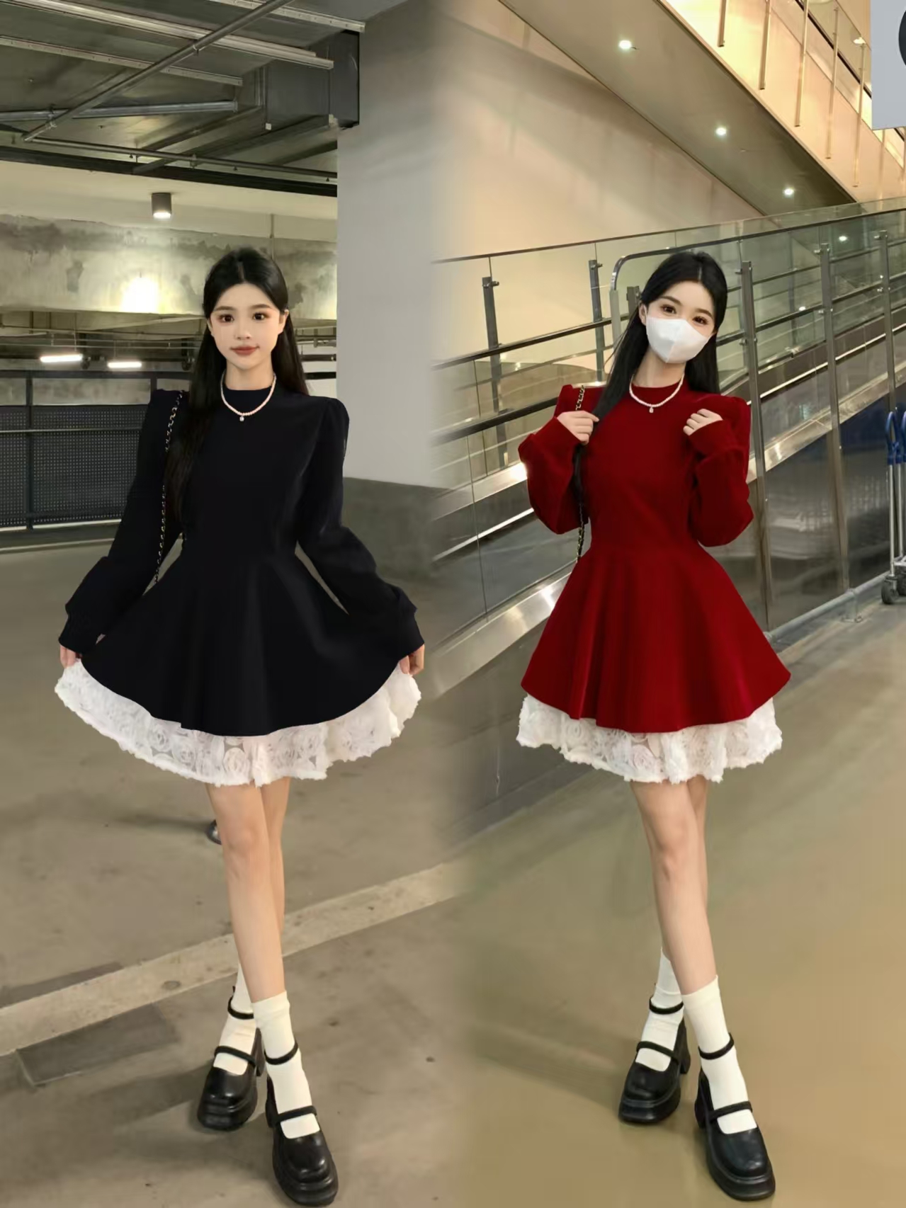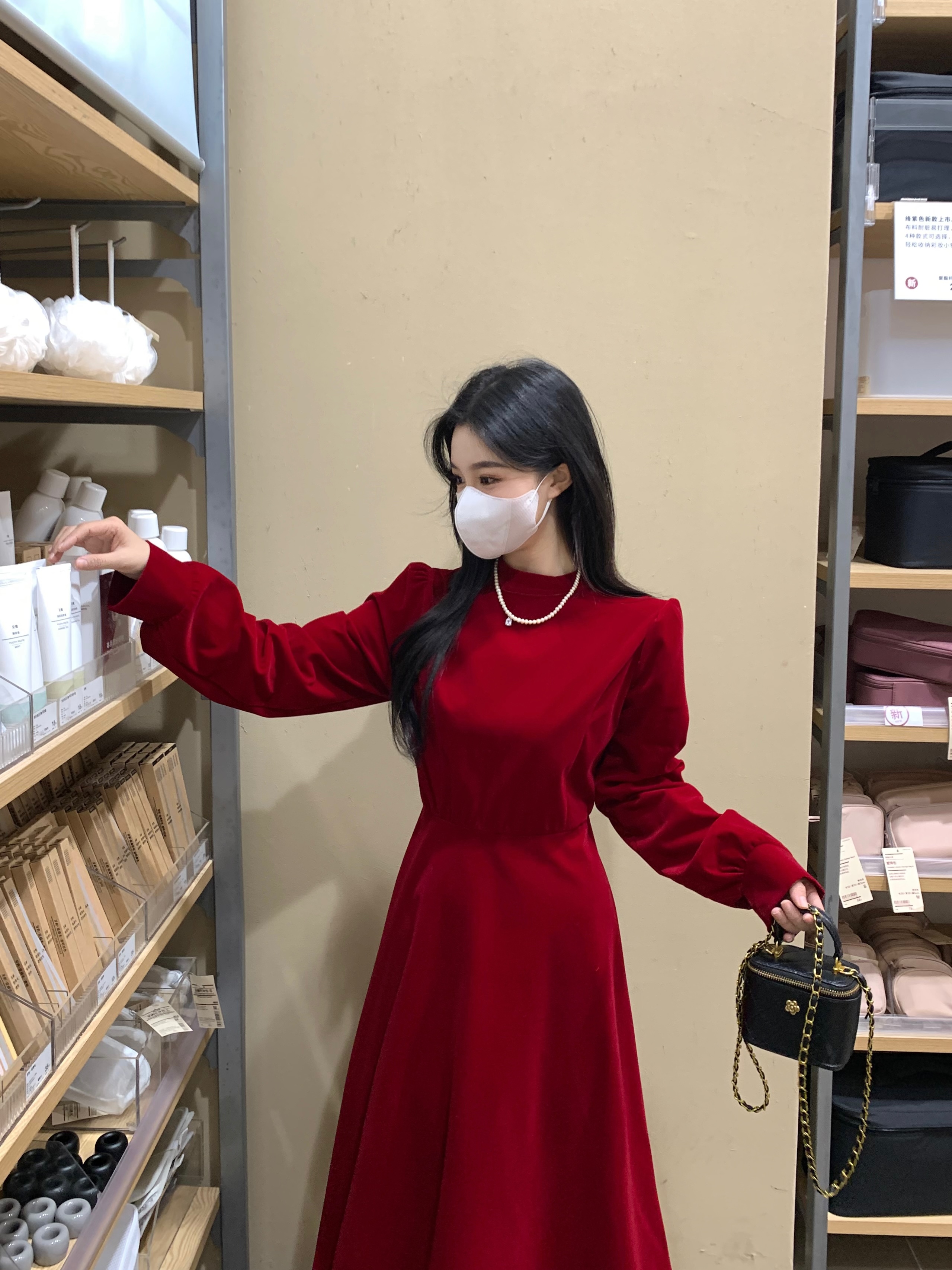 MY14332# 大码 玫瑰丝绒拼接连衣裙固色处理冬季收腰显瘦长短款A字裙女裝貨源服裝批發