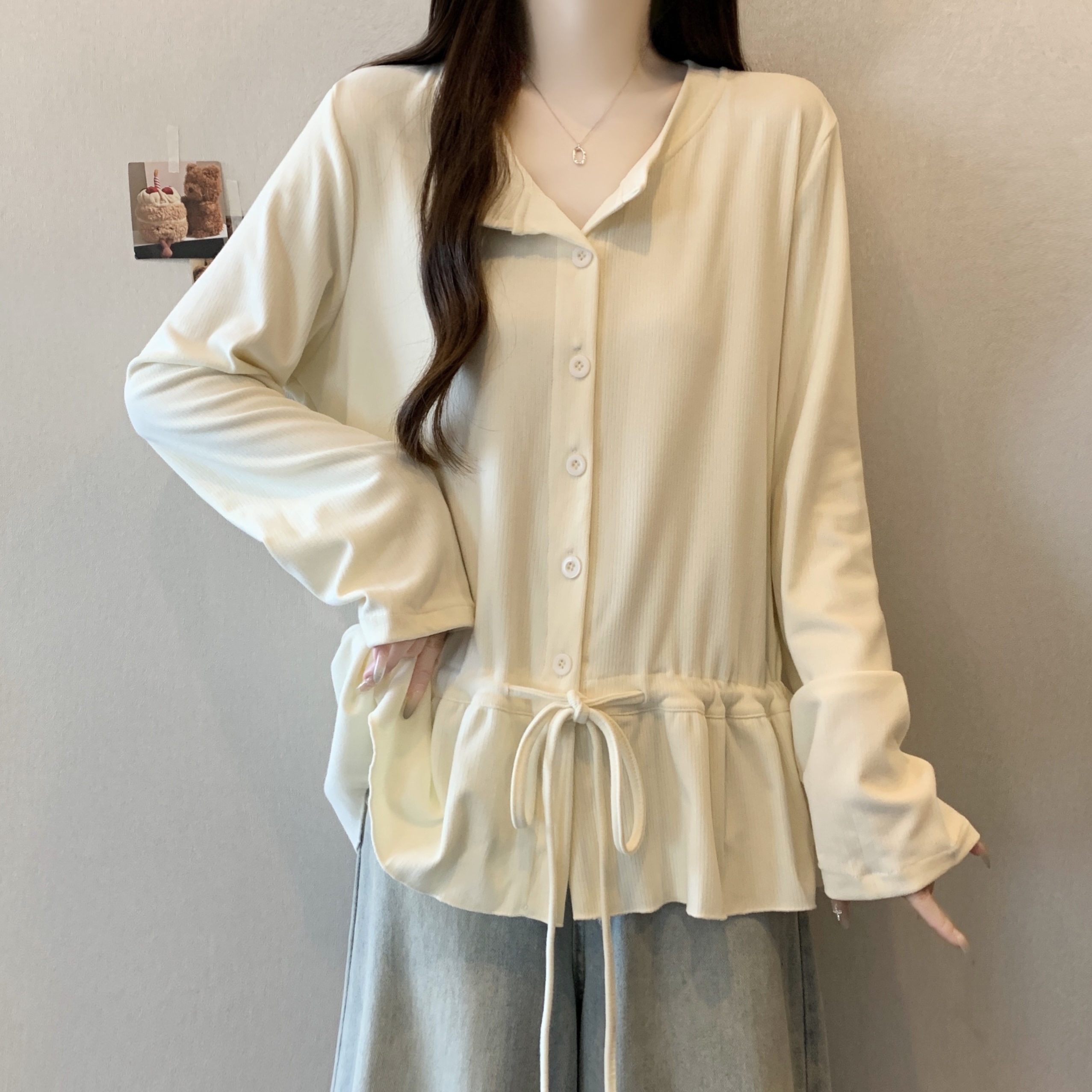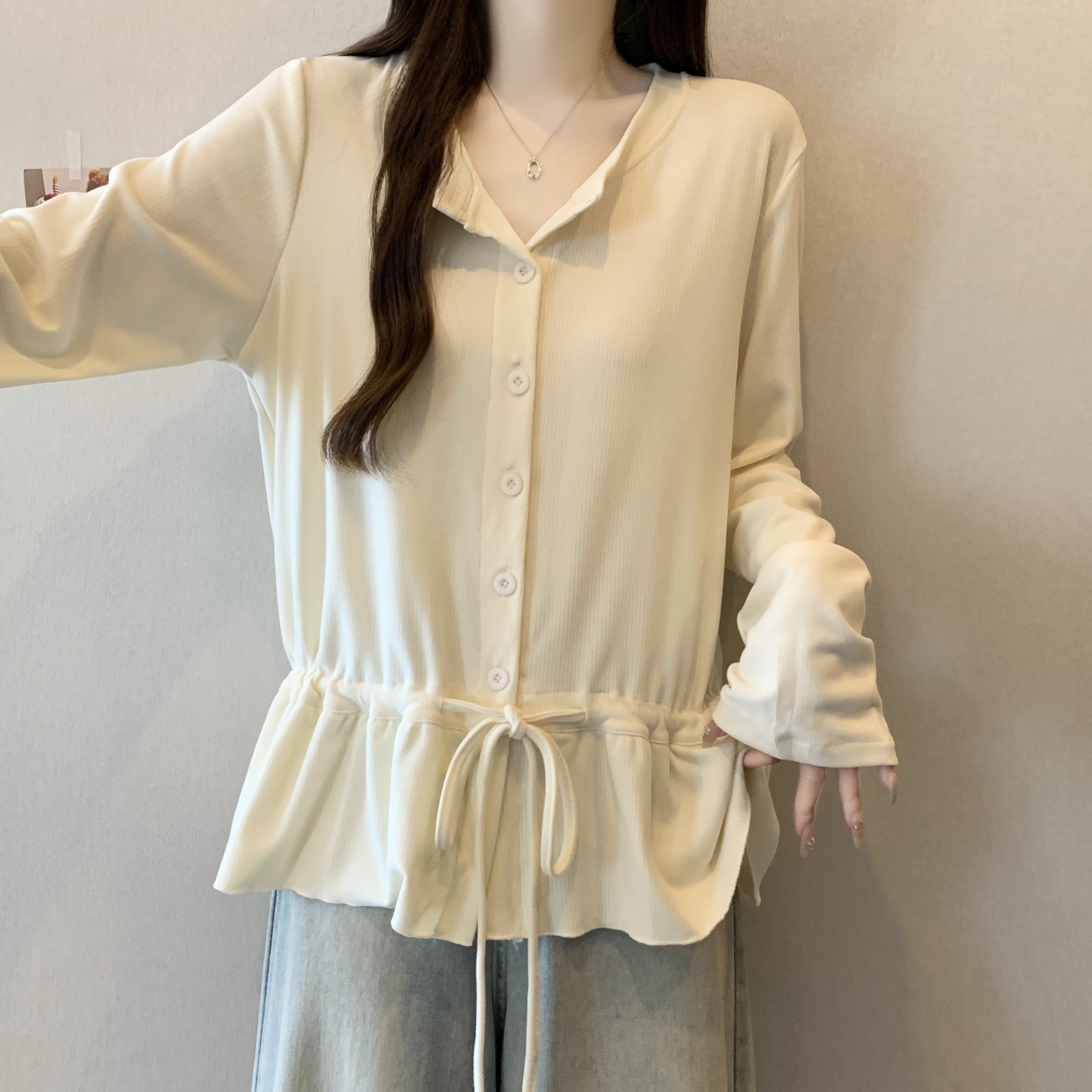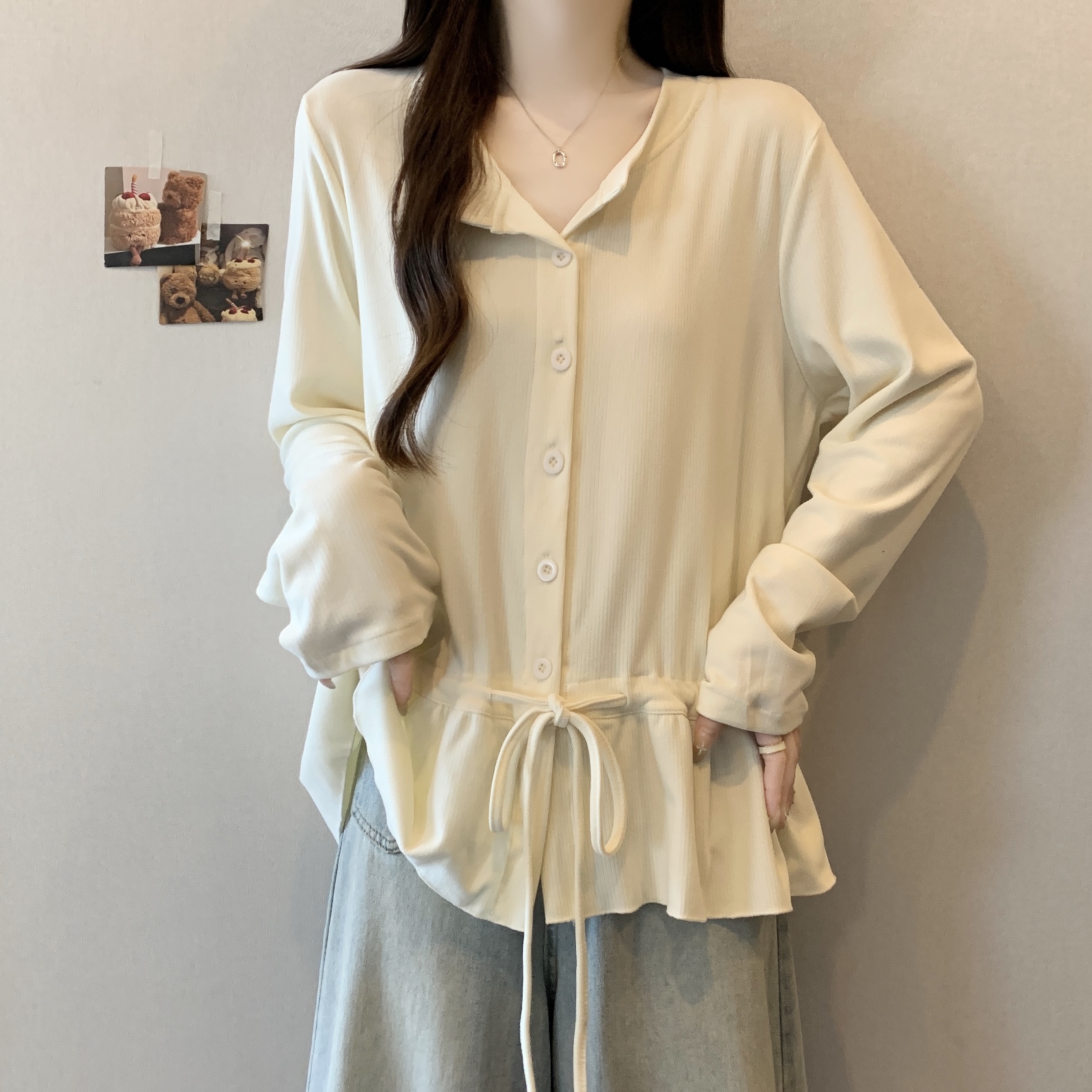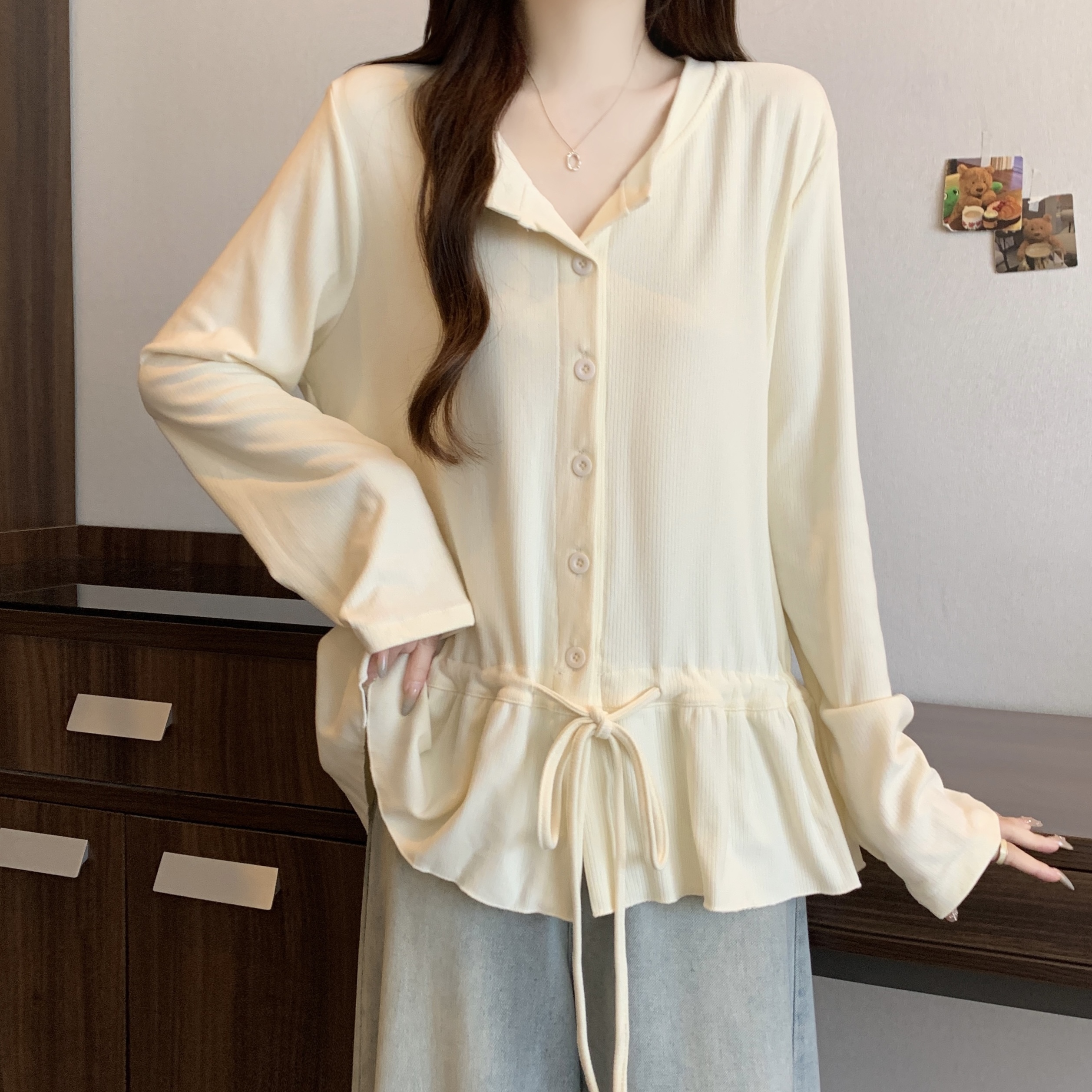 MY14350# 大码荷叶边下摆抽绳V领长袖针织衫新款显瘦内搭打底上衣女裝貨源服裝批發