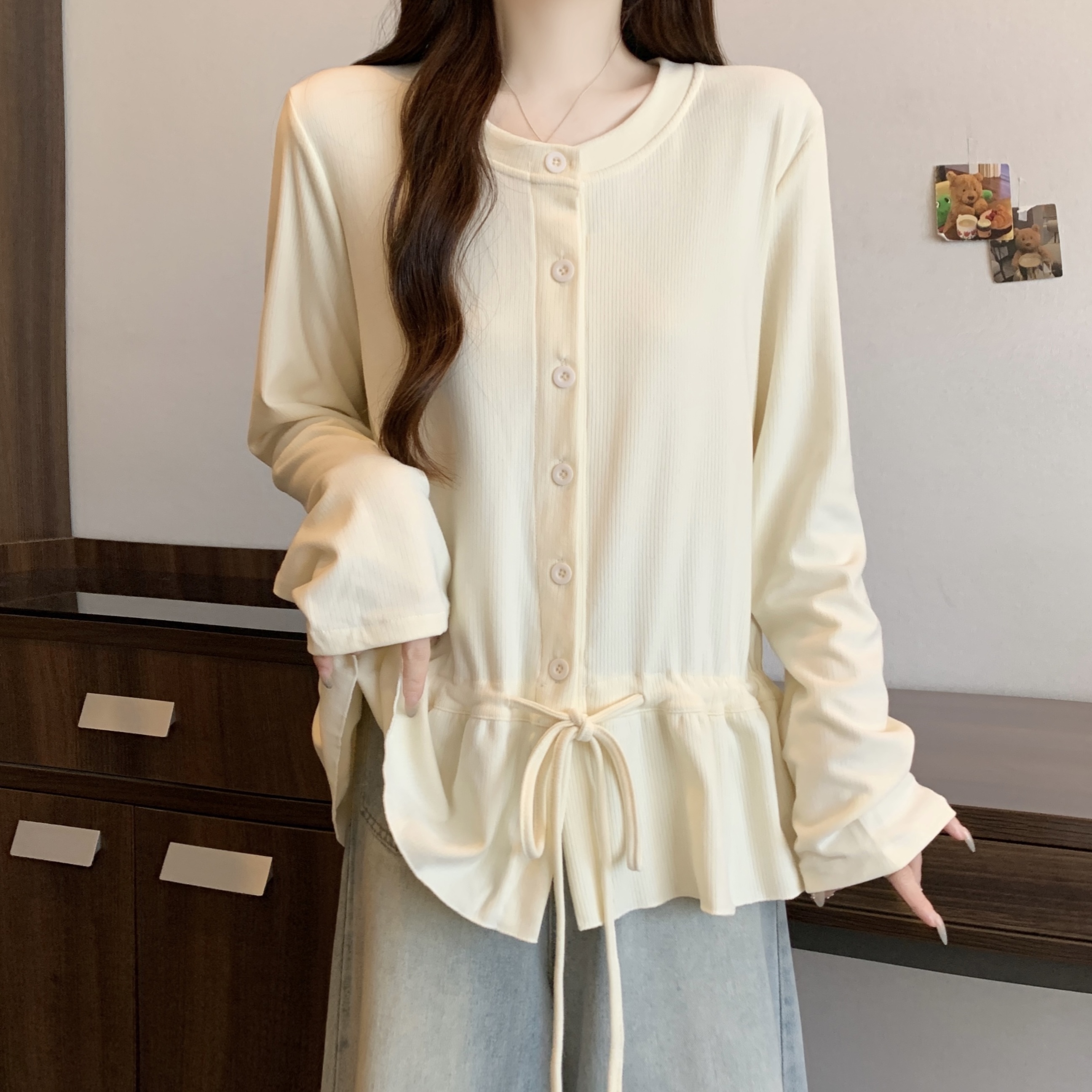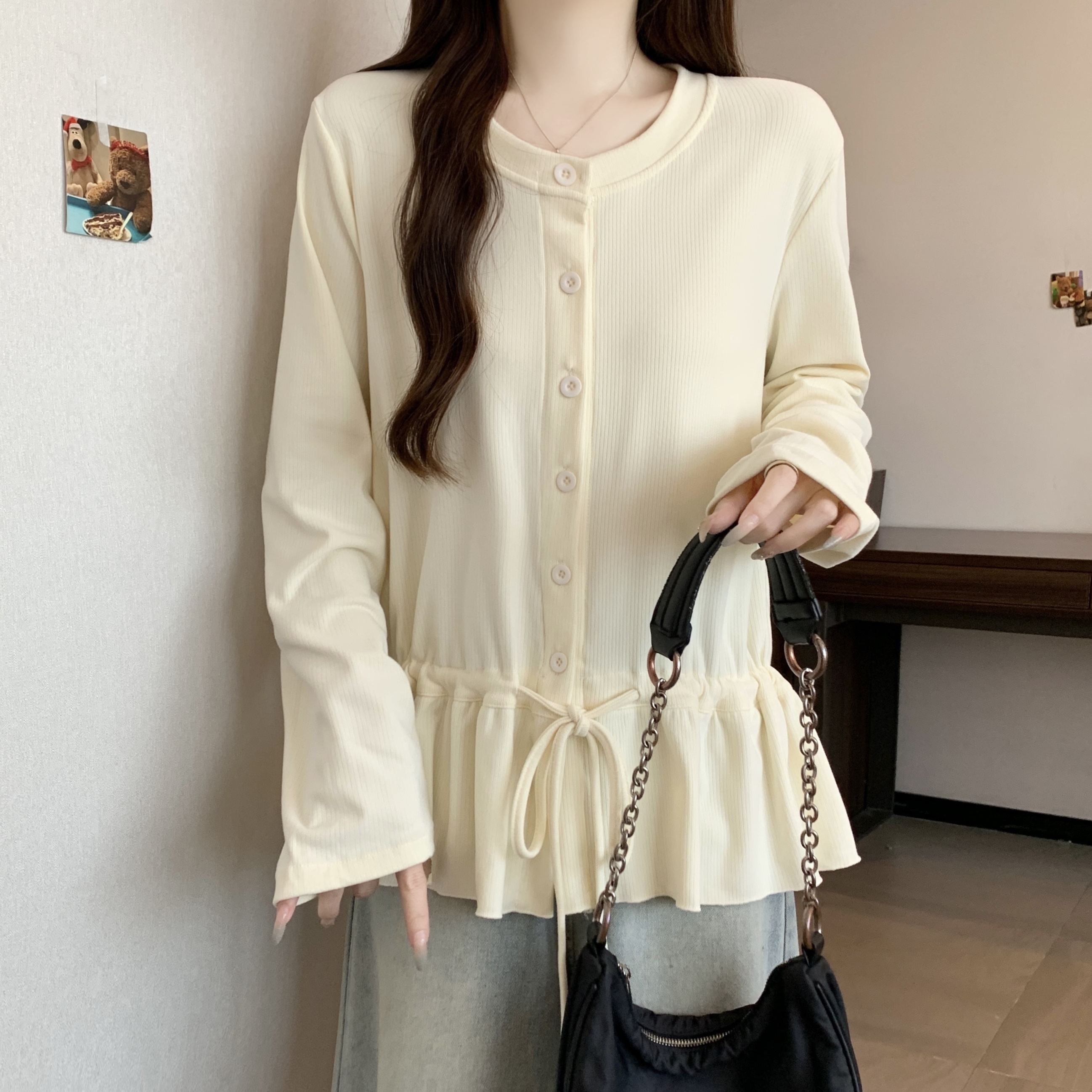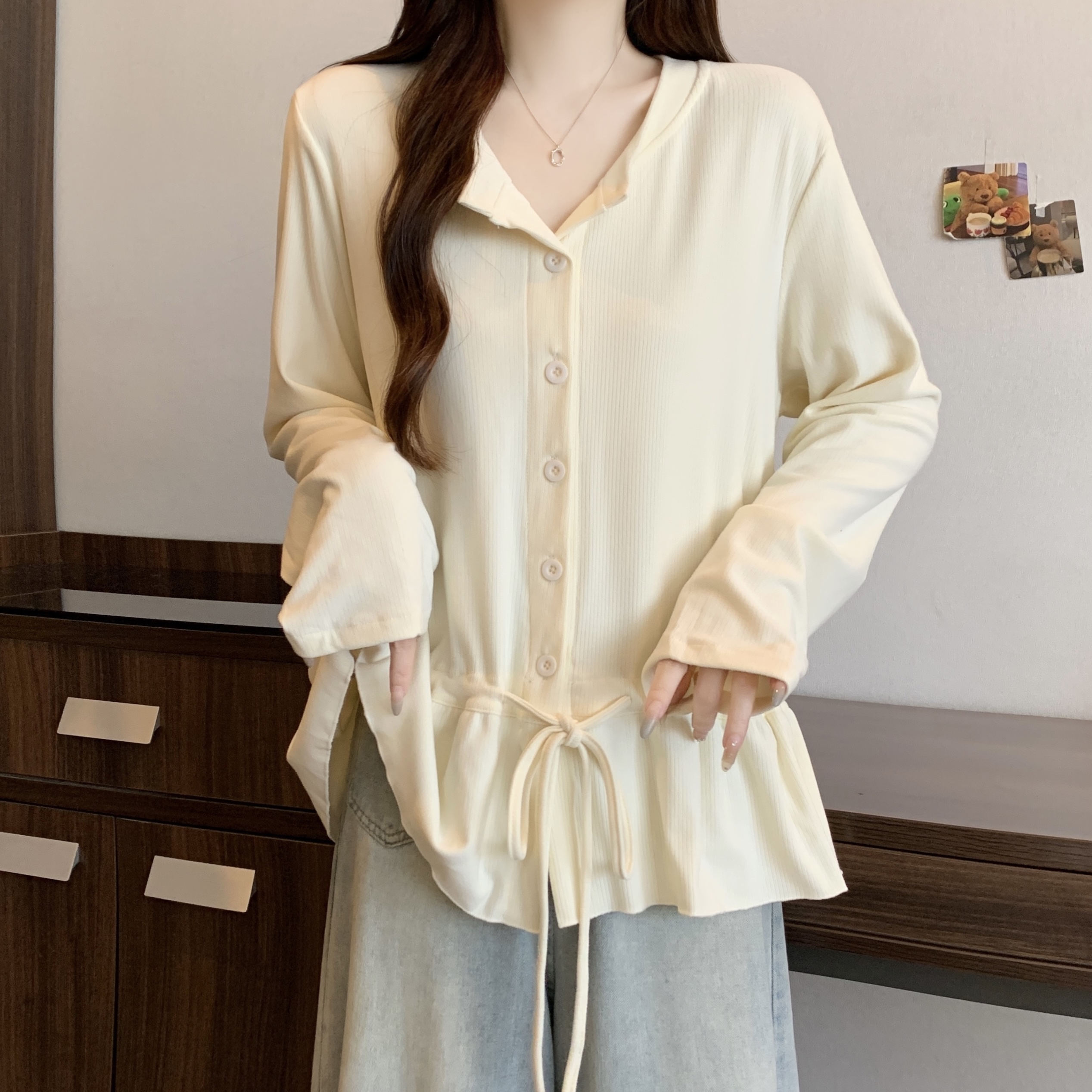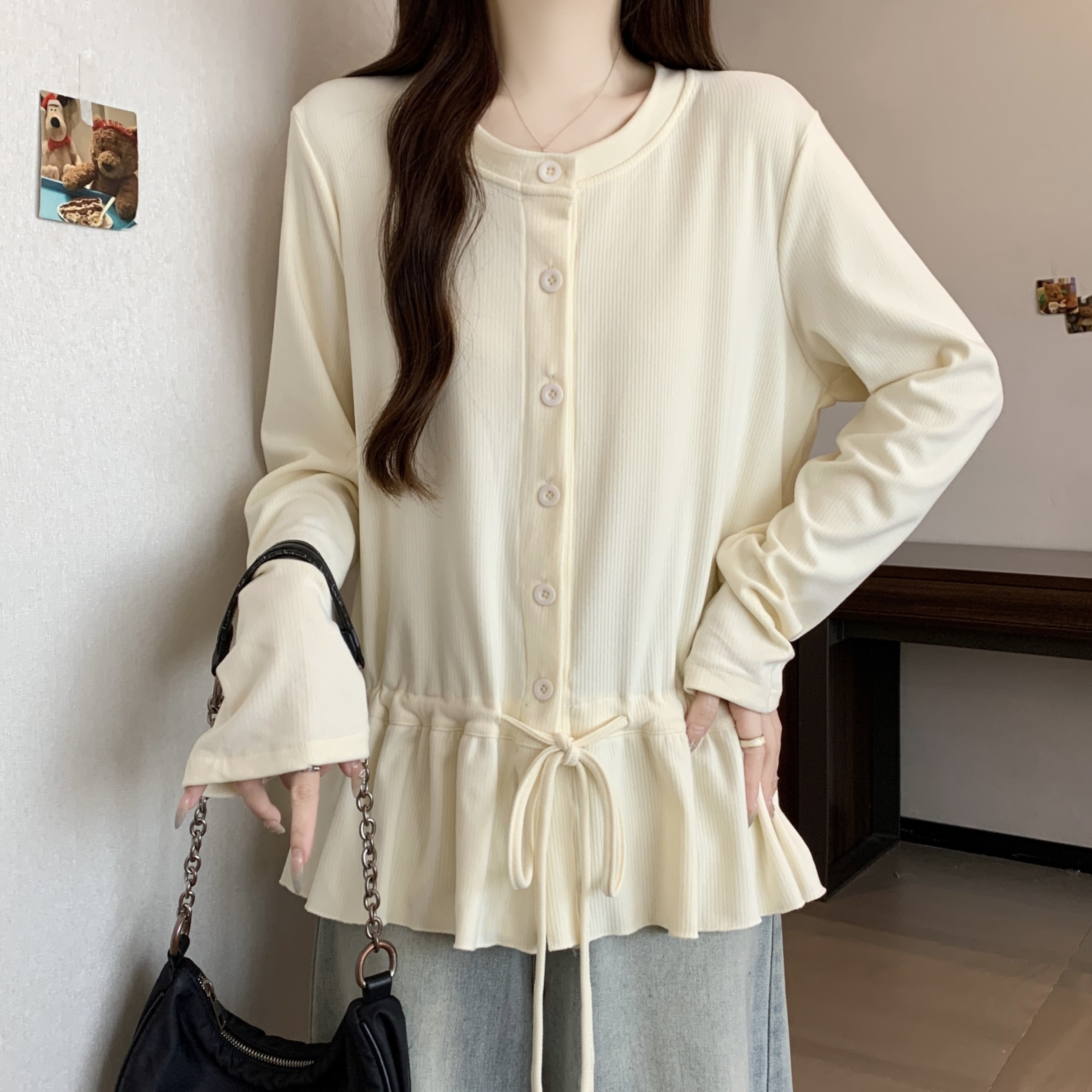 MY14350# 大码荷叶边下摆抽绳V领长袖针织衫新款显瘦内搭打底上衣女裝貨源服裝批發