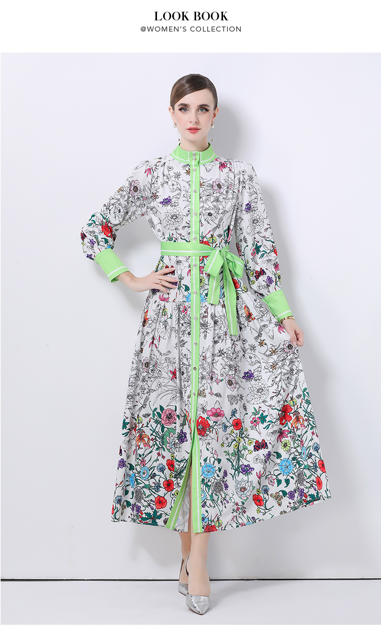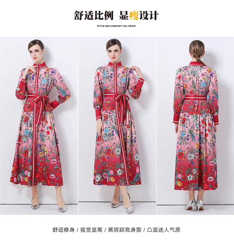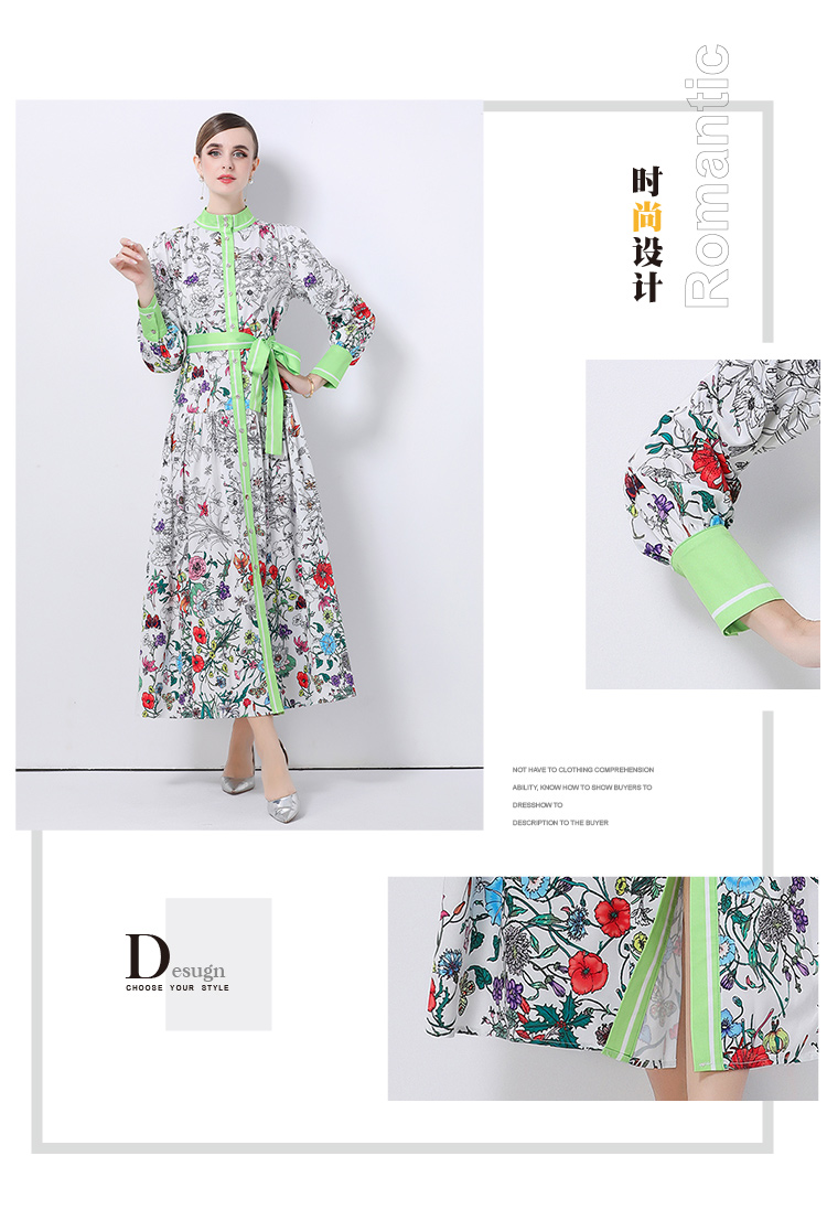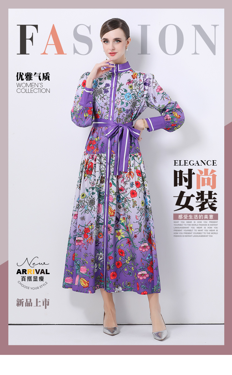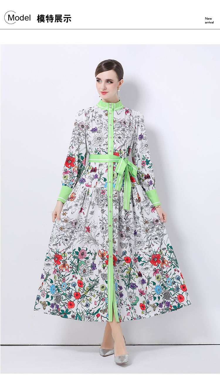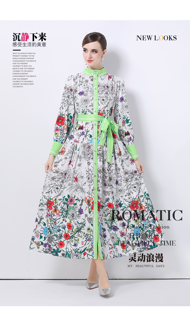 MY14894# 欧美时尚宫廷风立领单排扣印花连衣裙女裝貨源服裝批發