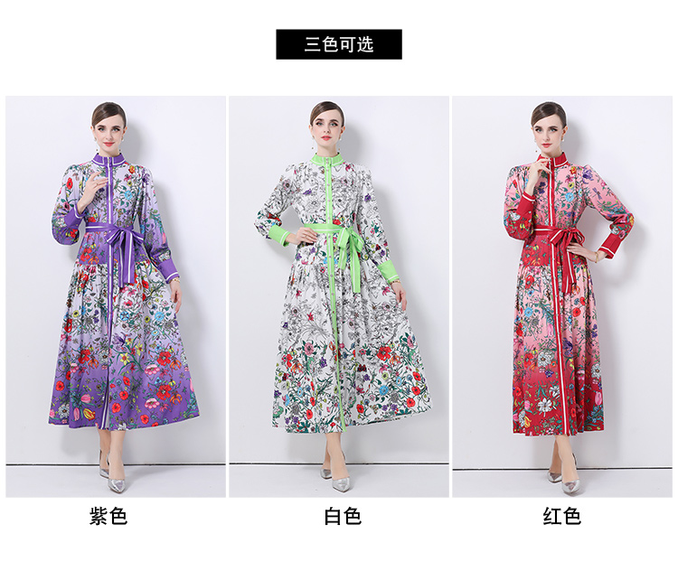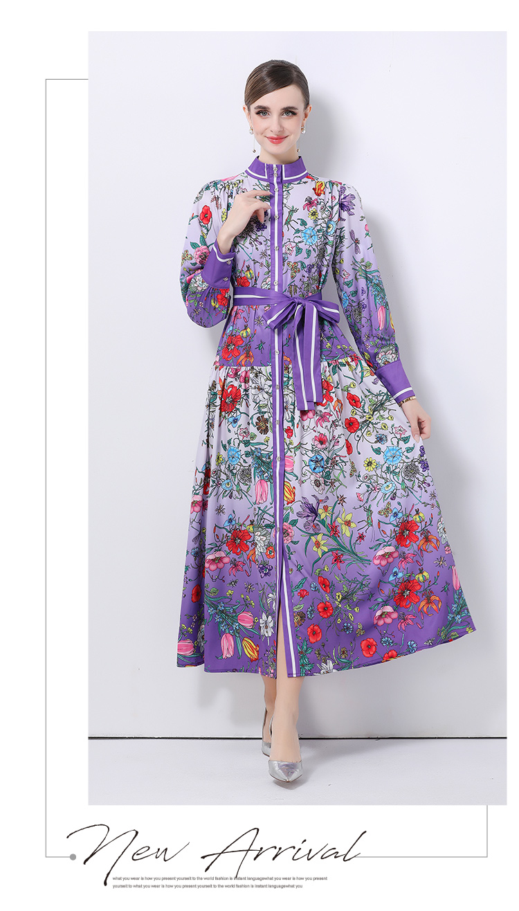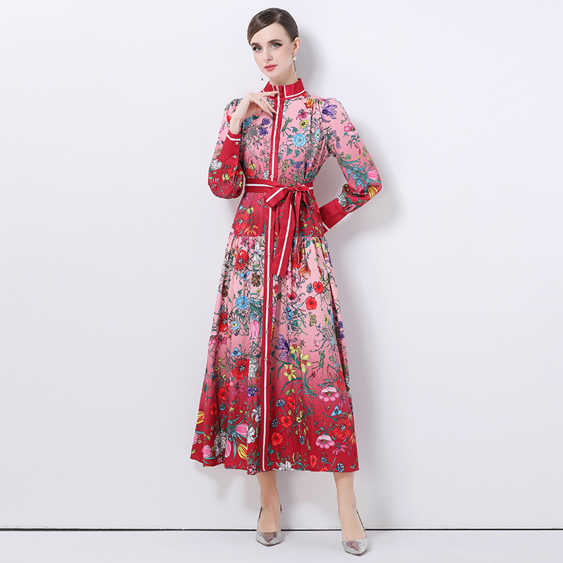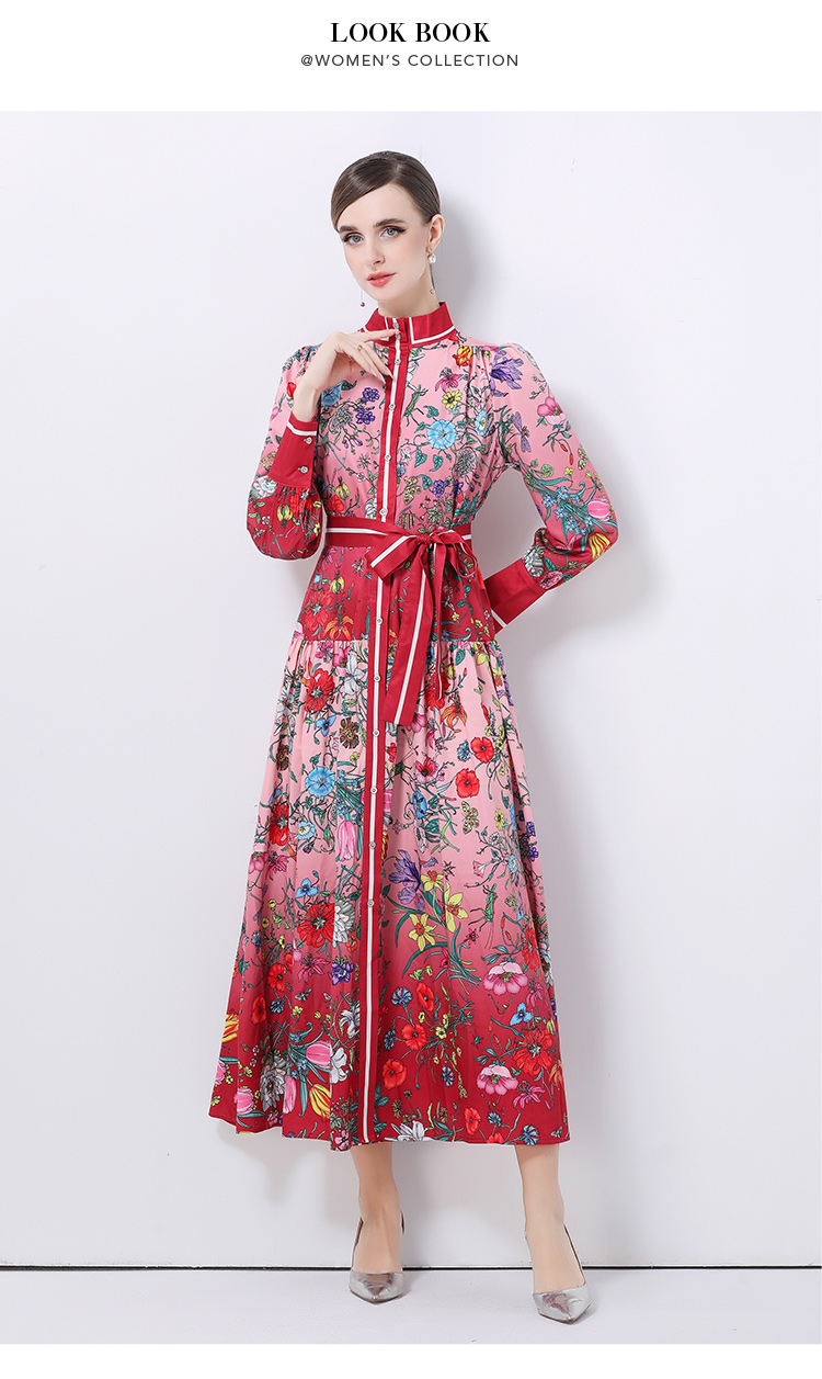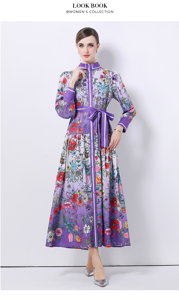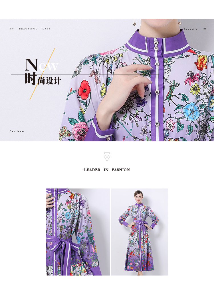 MY14894# 欧美时尚宫廷风立领单排扣印花连衣裙女裝貨源服裝批發
