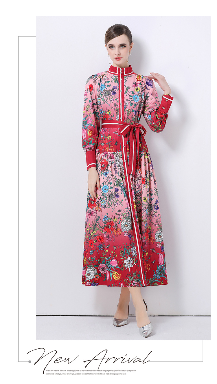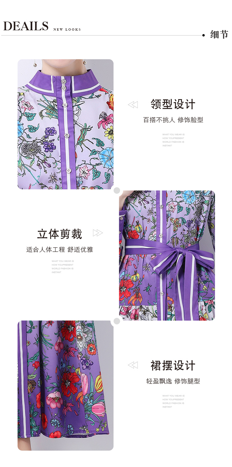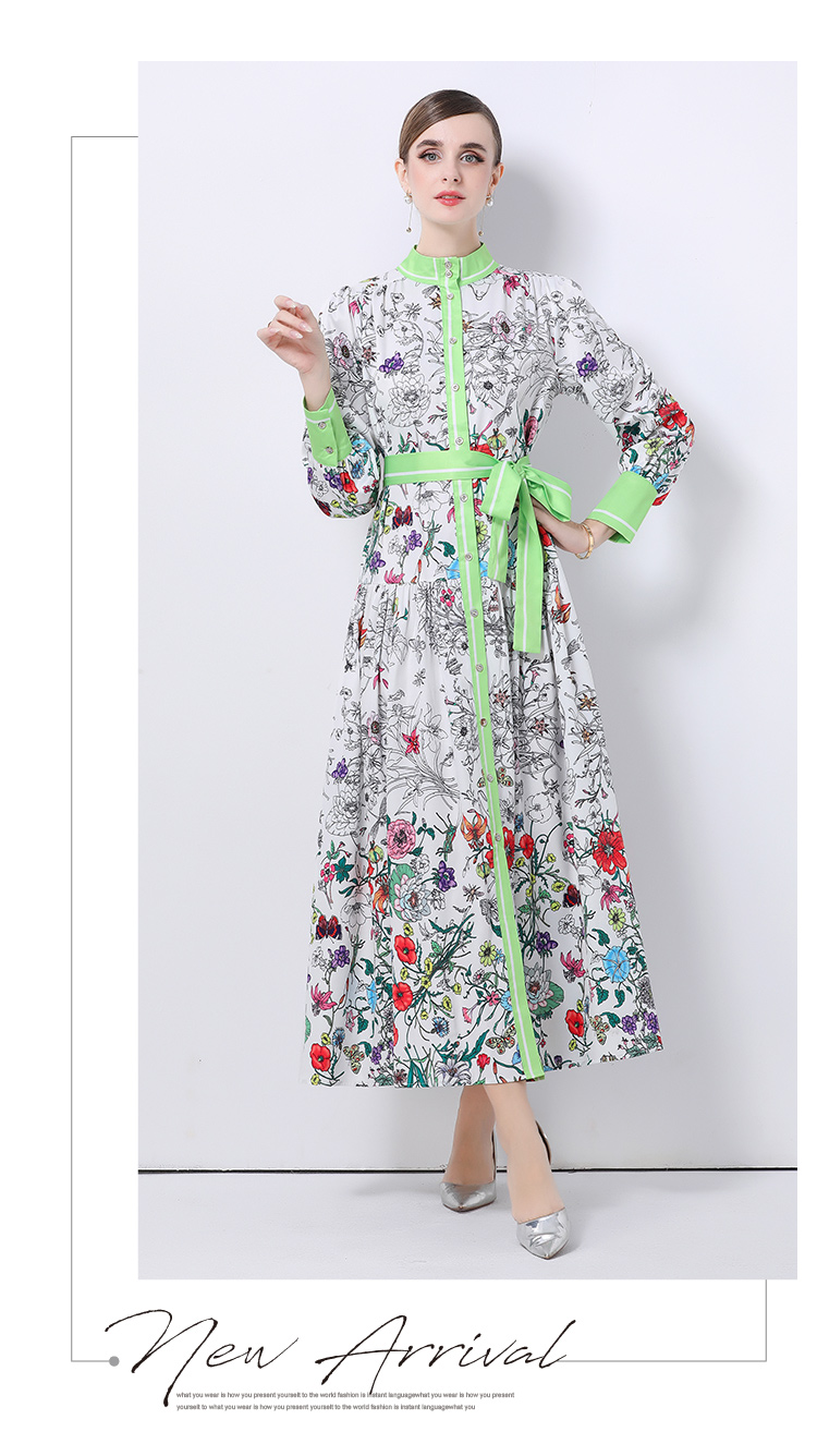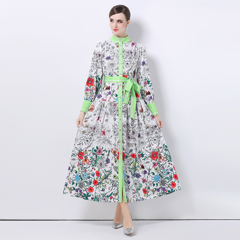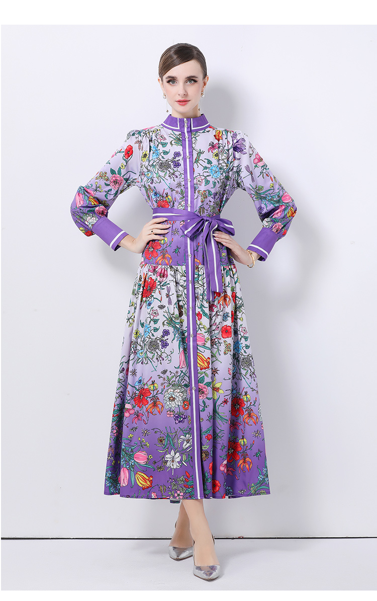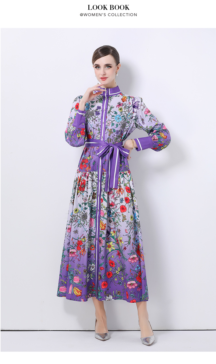 MY14894# 欧美时尚宫廷风立领单排扣印花连衣裙女裝貨源服裝批發
