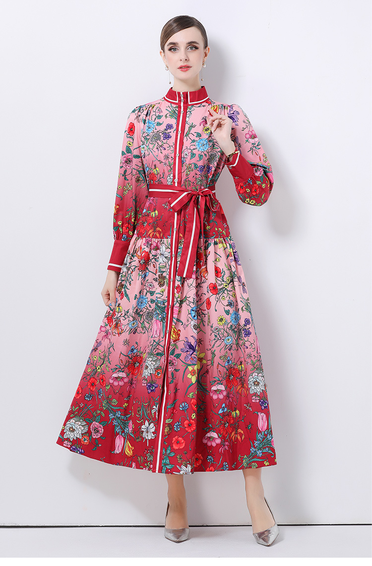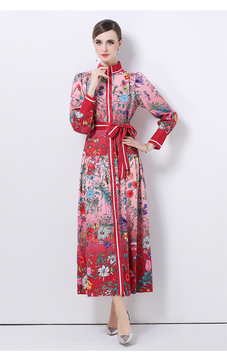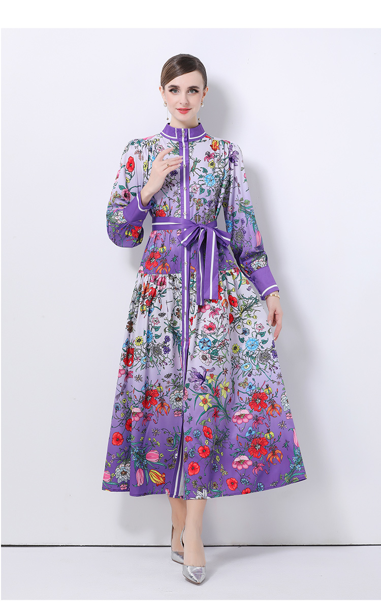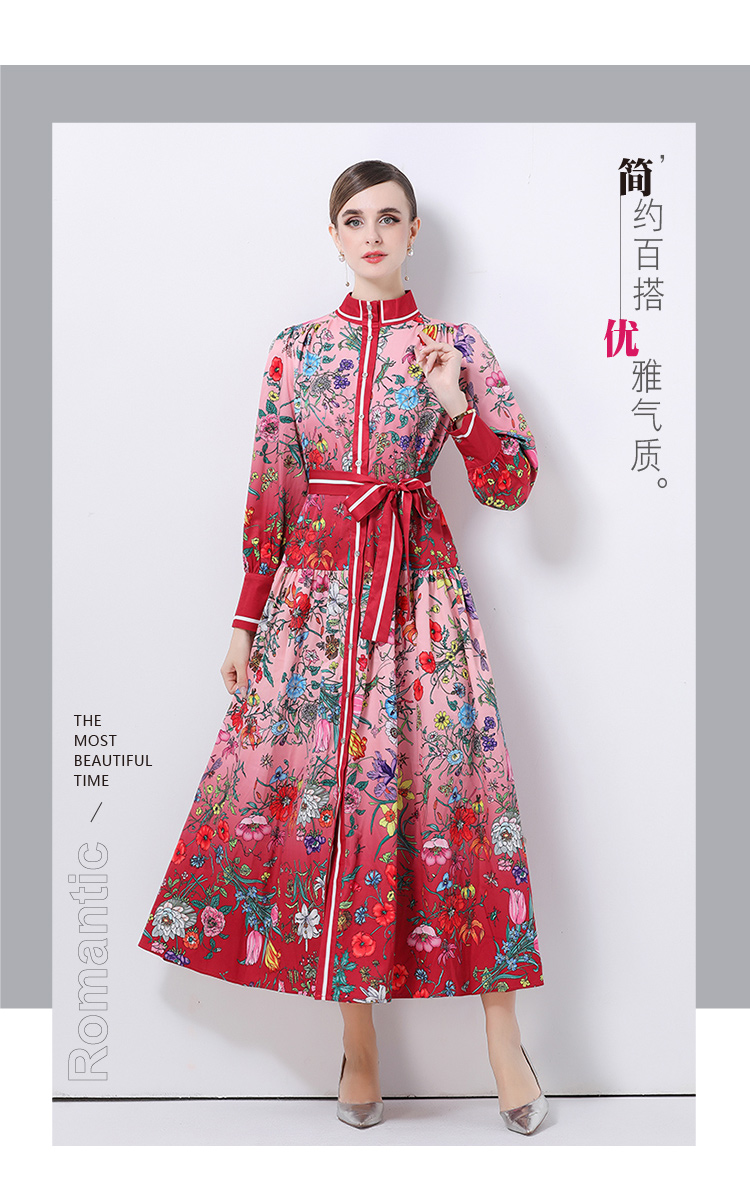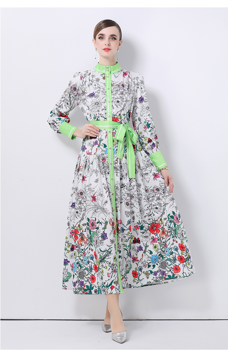 MY14894# 欧美时尚宫廷风立领单排扣印花连衣裙女裝貨源服裝批發