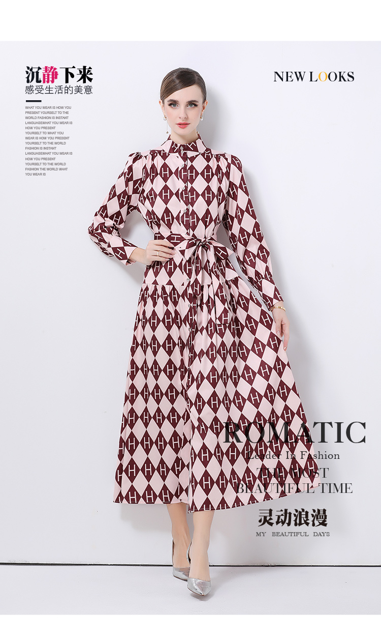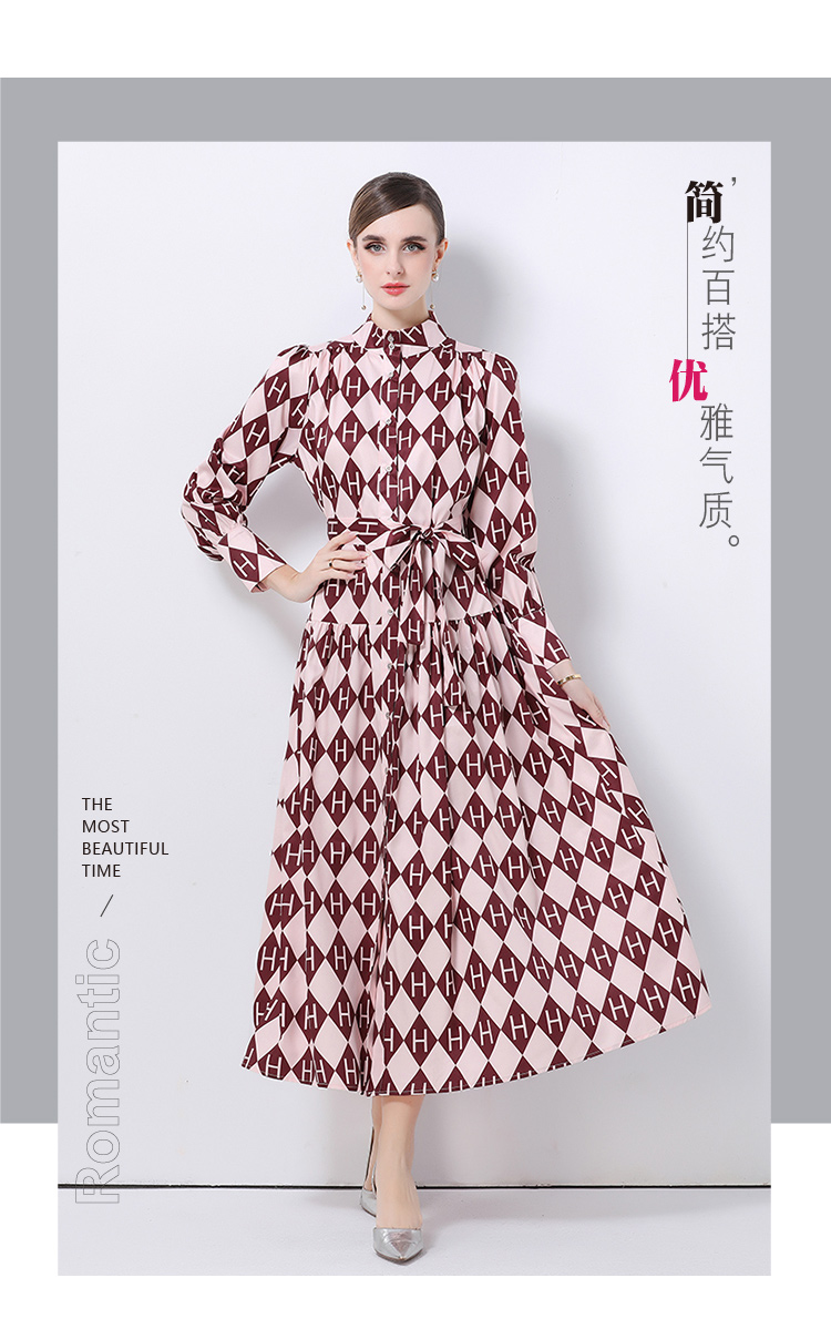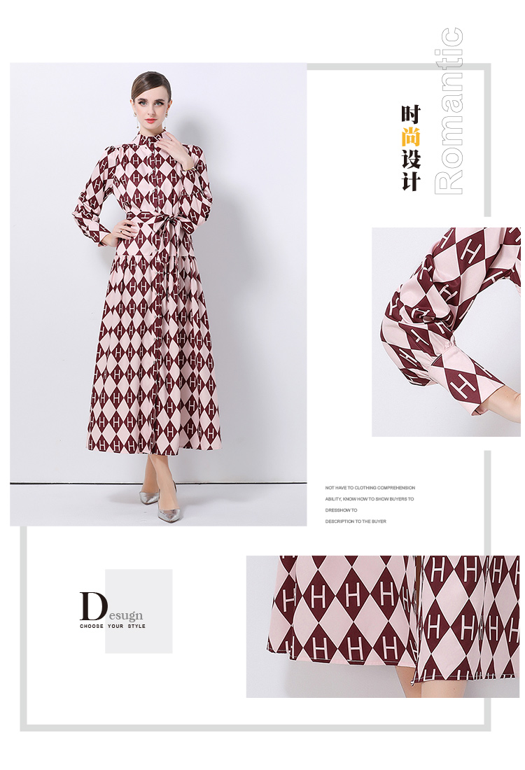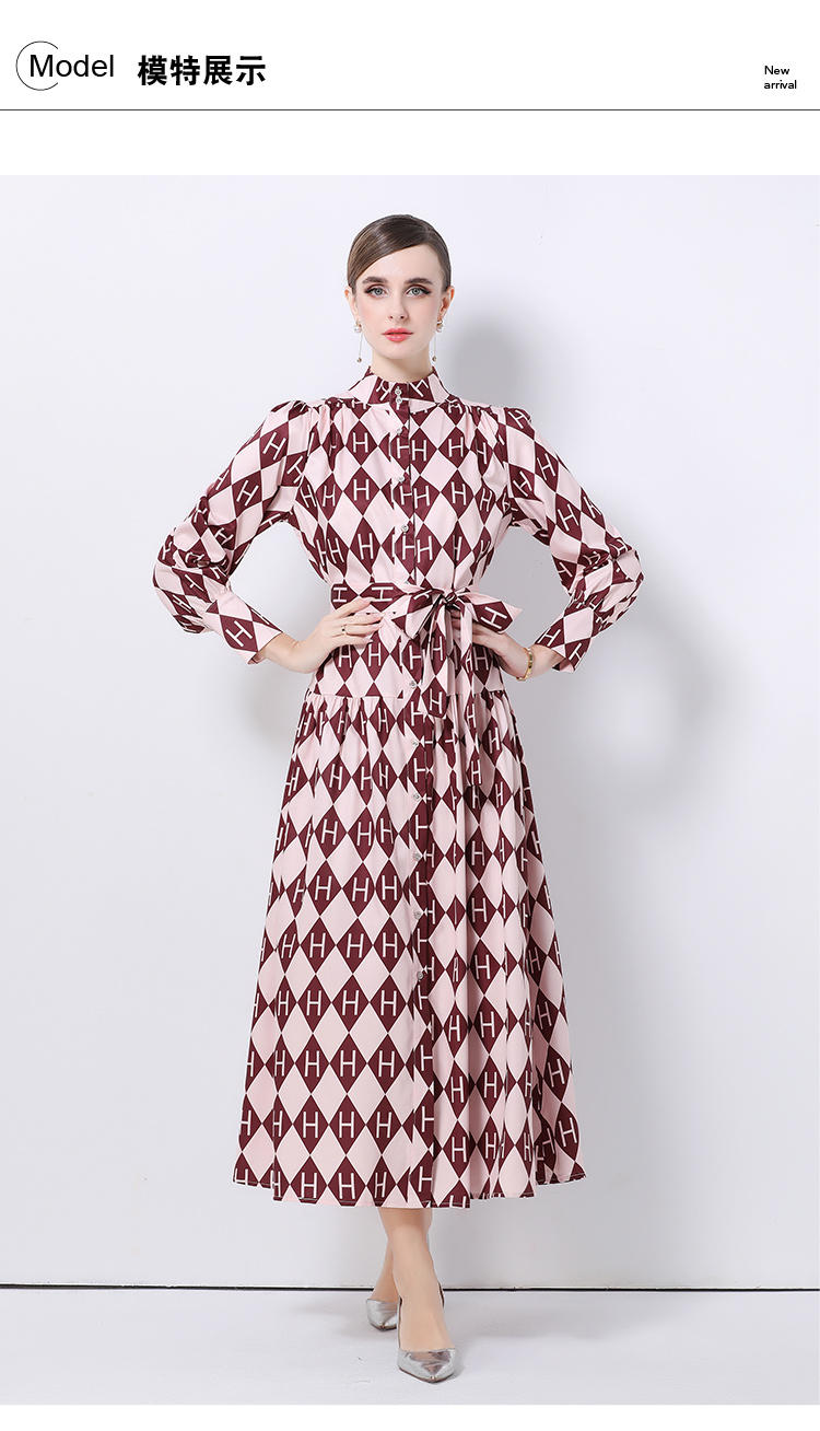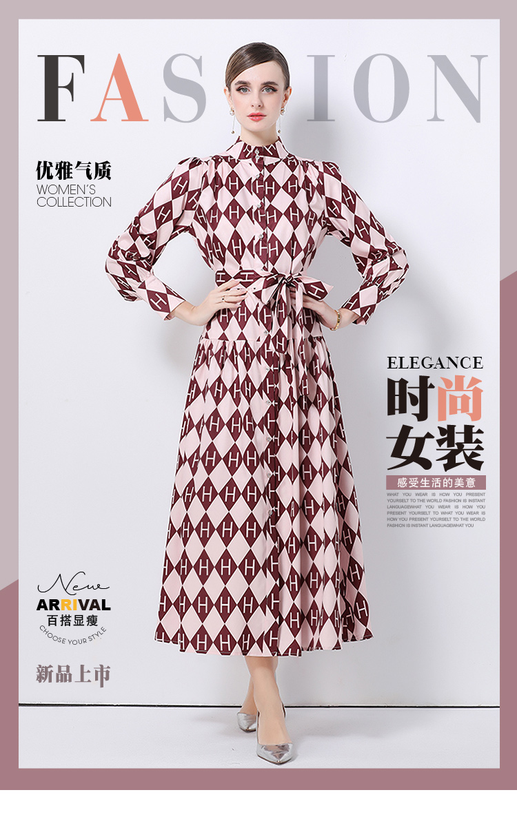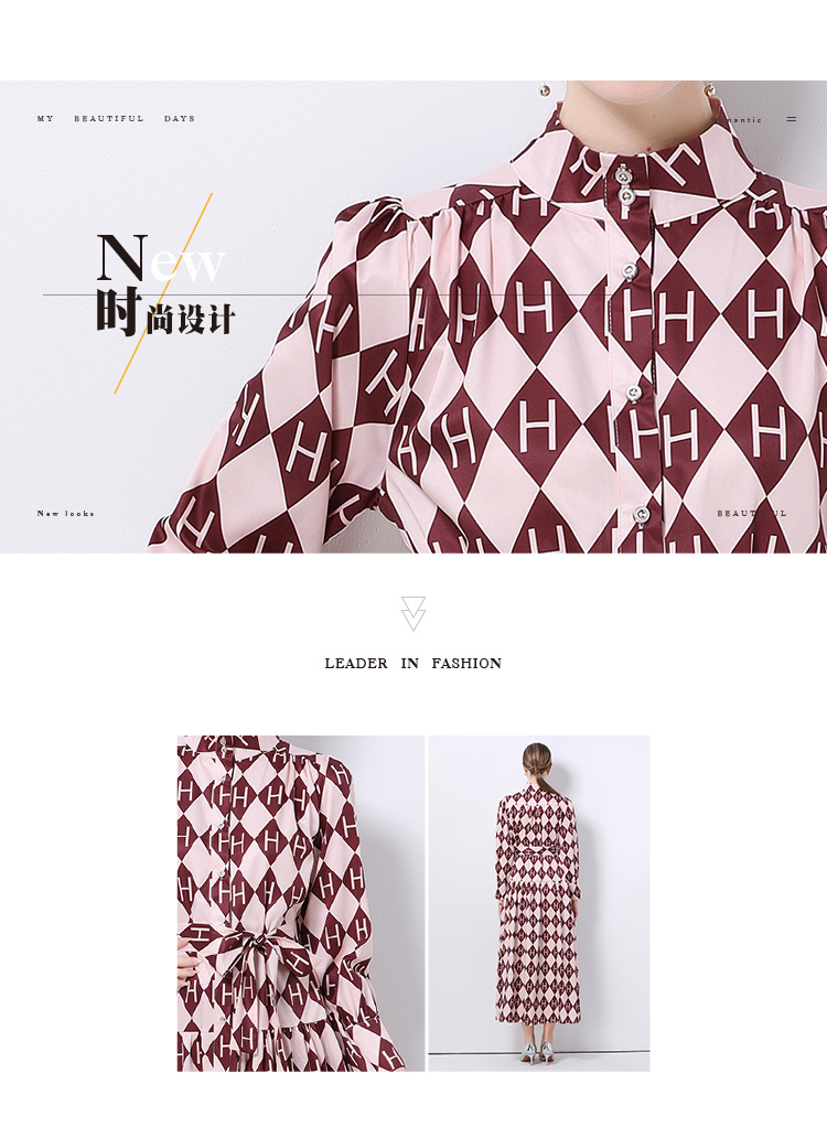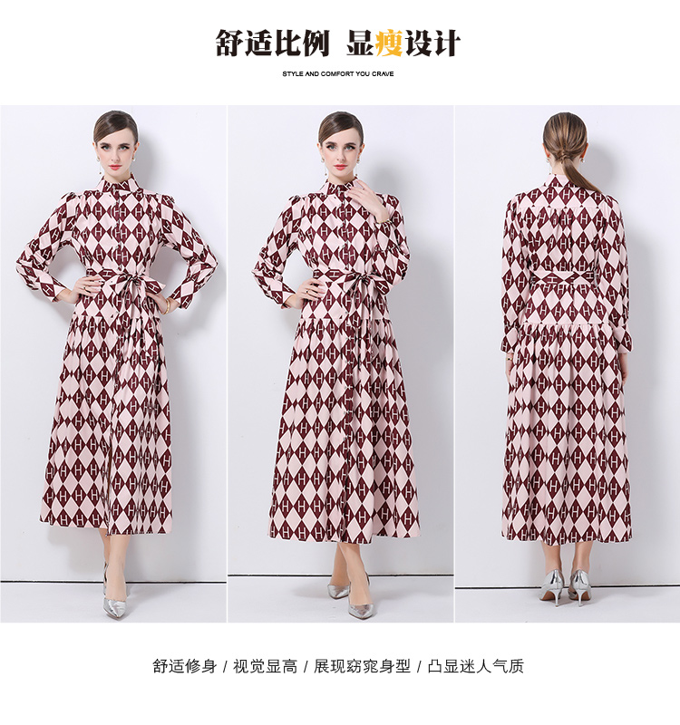 MY14895# 欧美时尚宫廷风立领单排扣印花连衣裙女裝貨源服裝批發