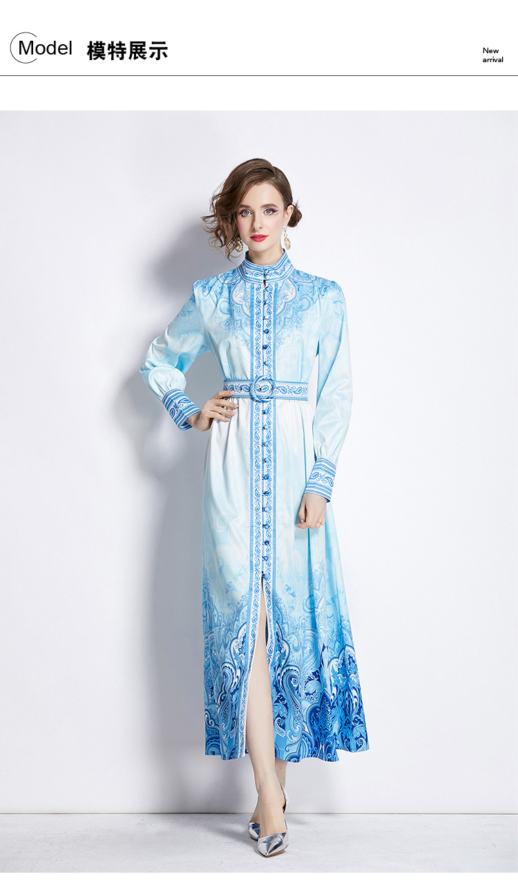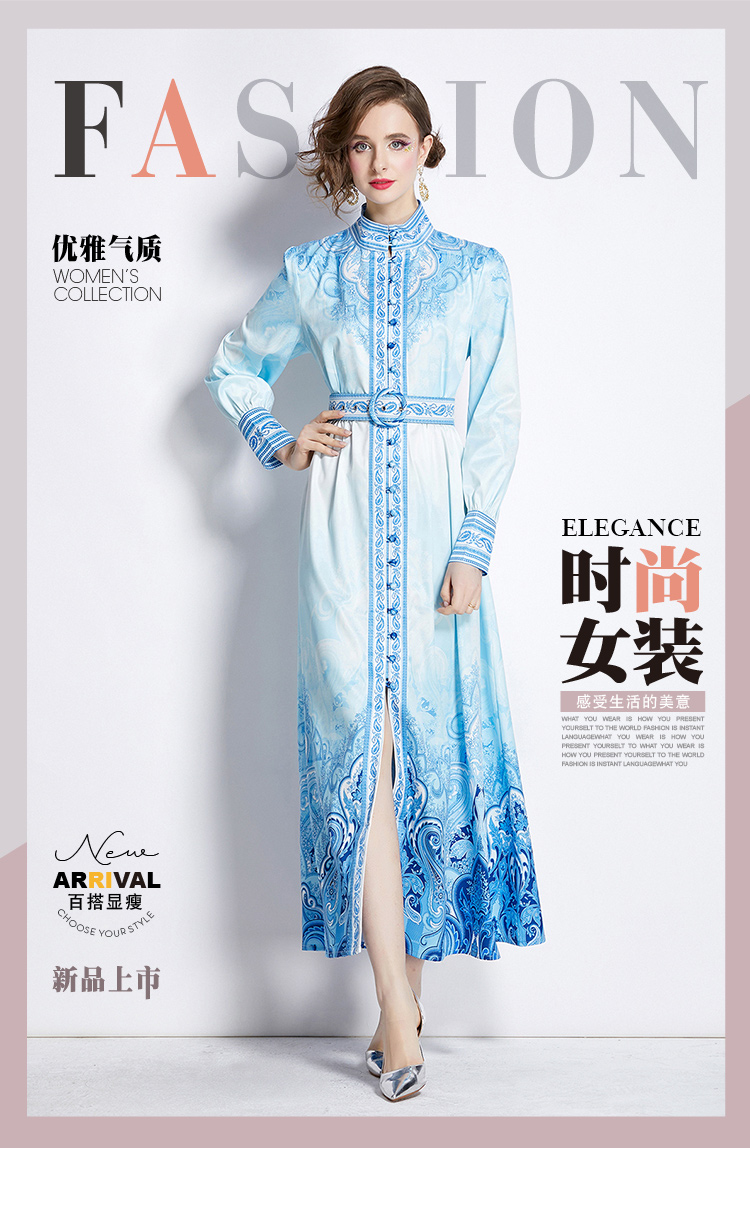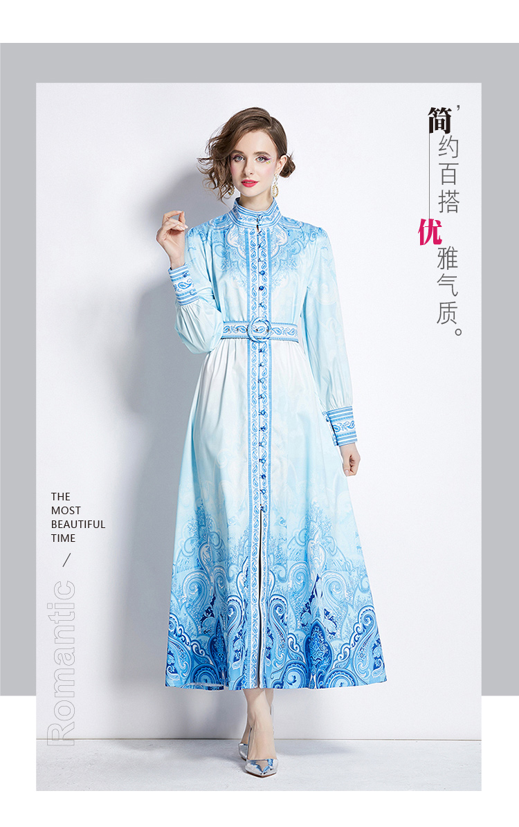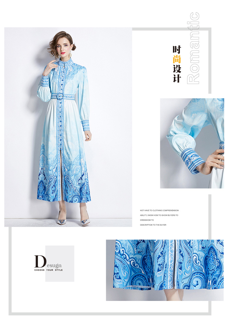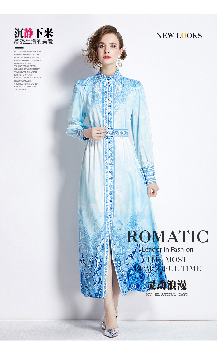 MY14906# 欧美时尚宫廷风立领单排扣印花连衣裙女裝貨源服裝批發