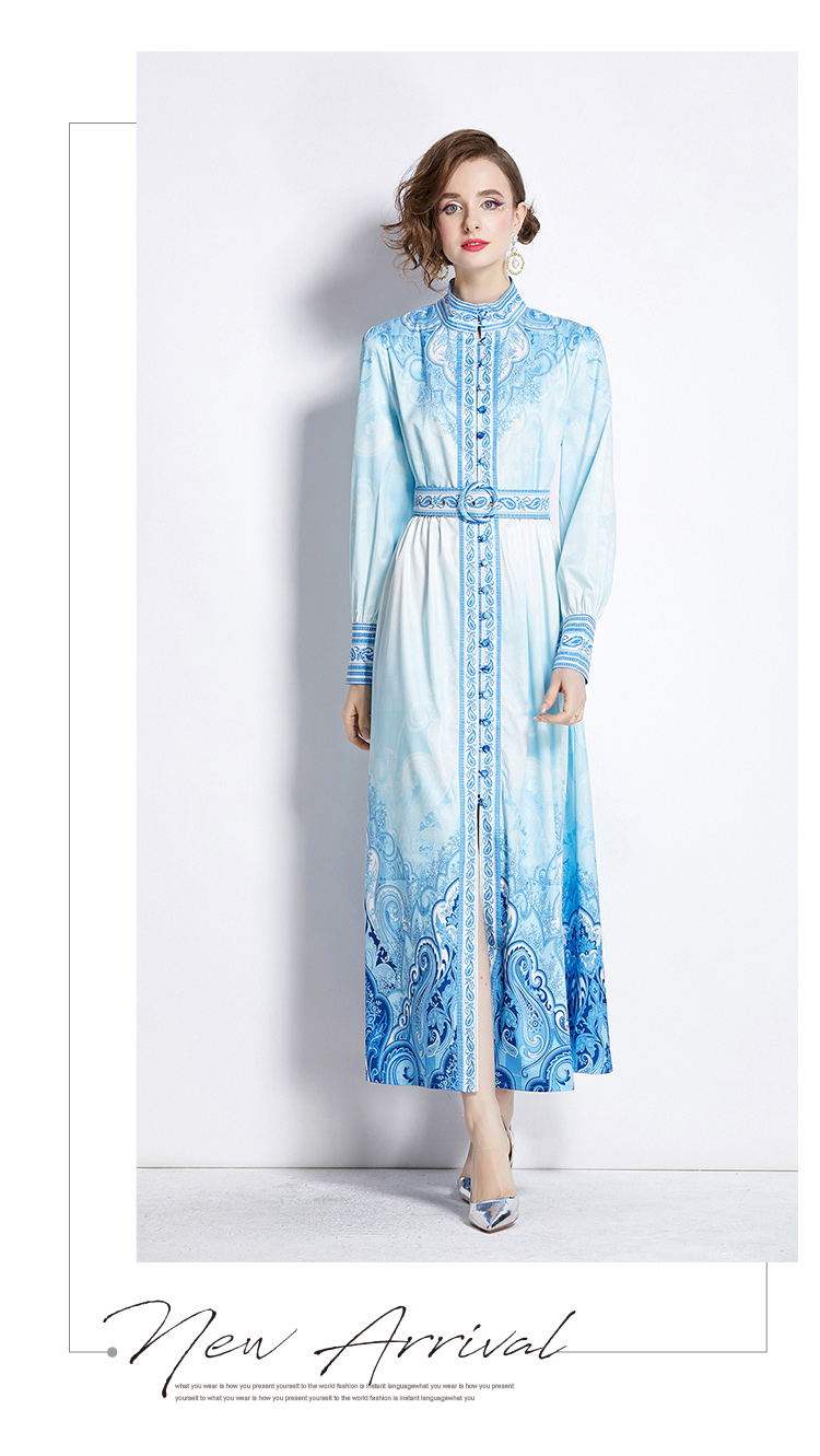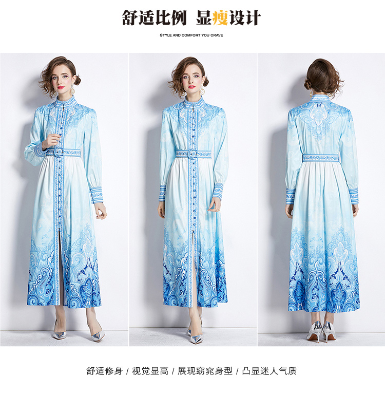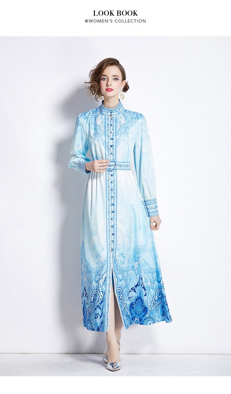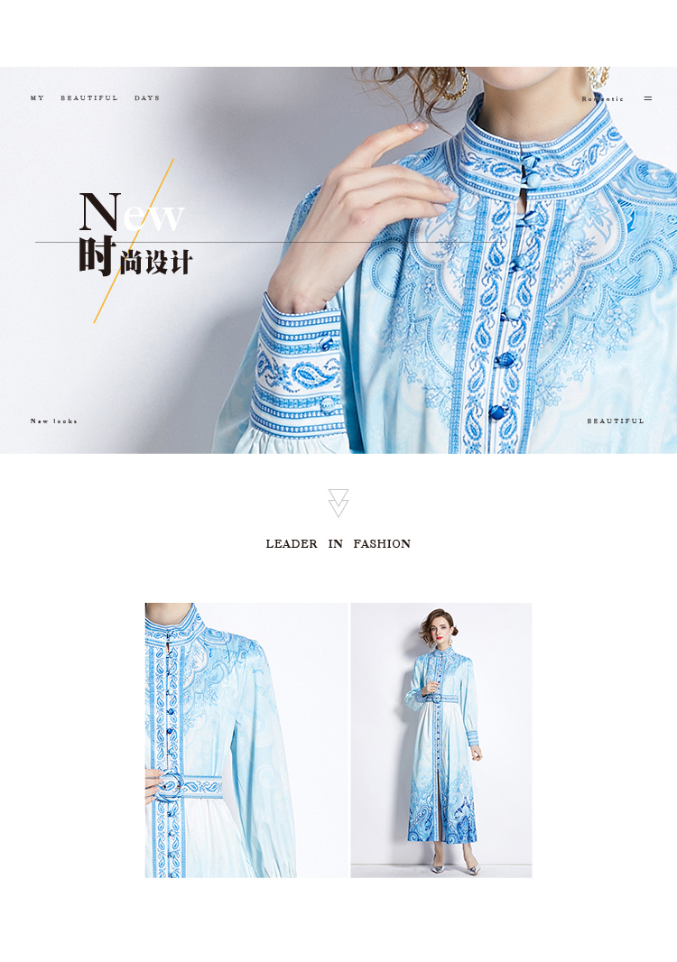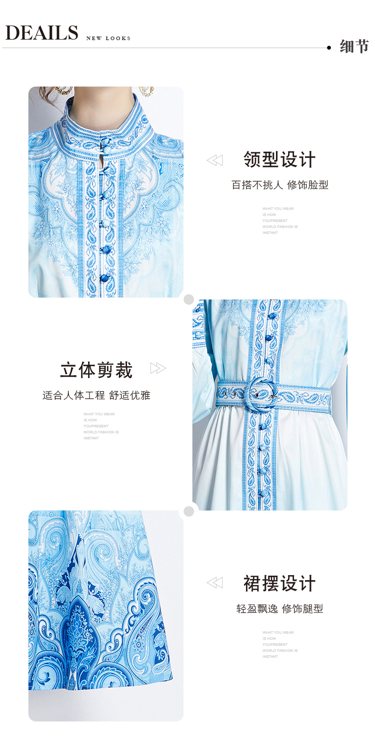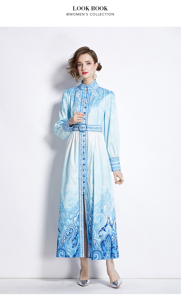MY14906# 欧美时尚宫廷风立领单排扣印花连衣裙女裝貨源服裝批發