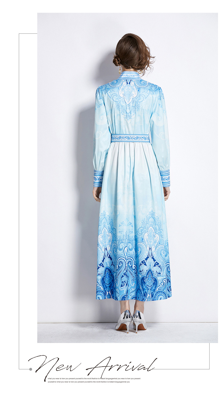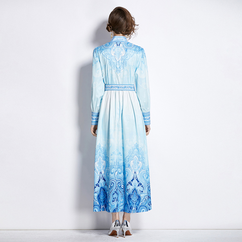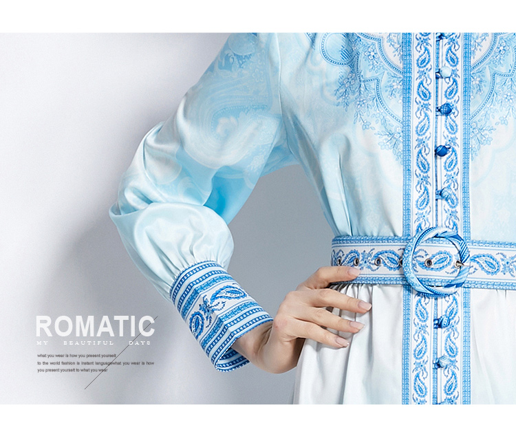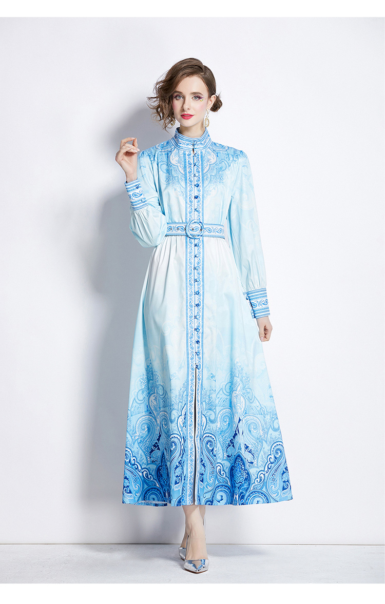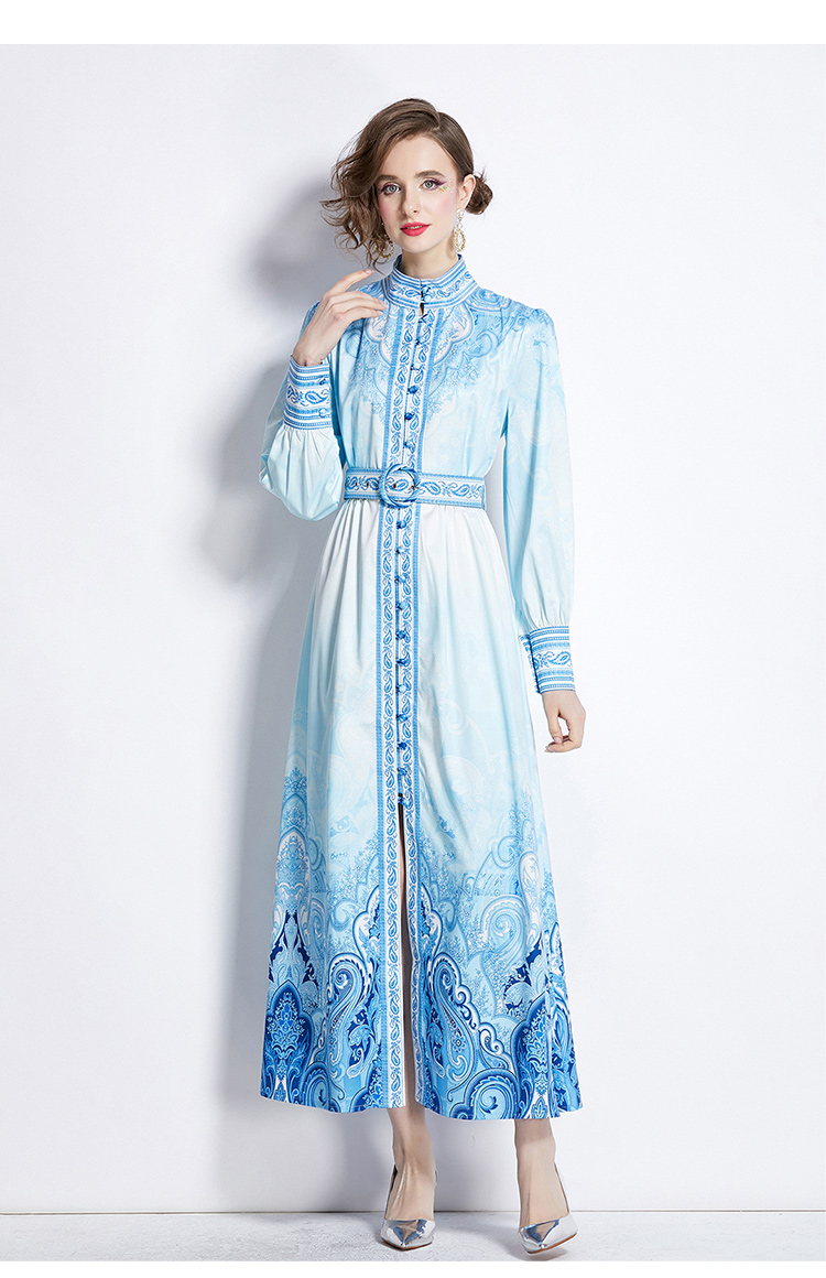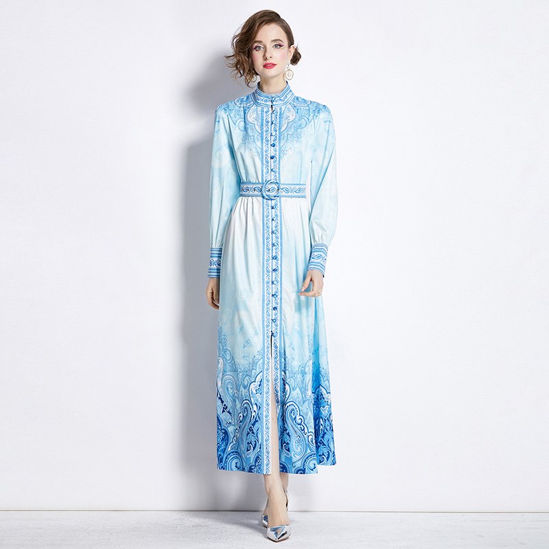 MY14906# 欧美时尚宫廷风立领单排扣印花连衣裙女裝貨源服裝批發
