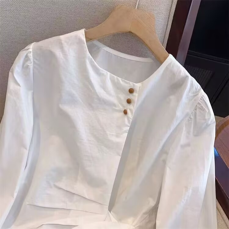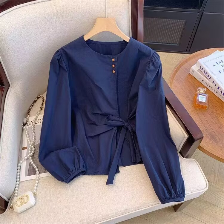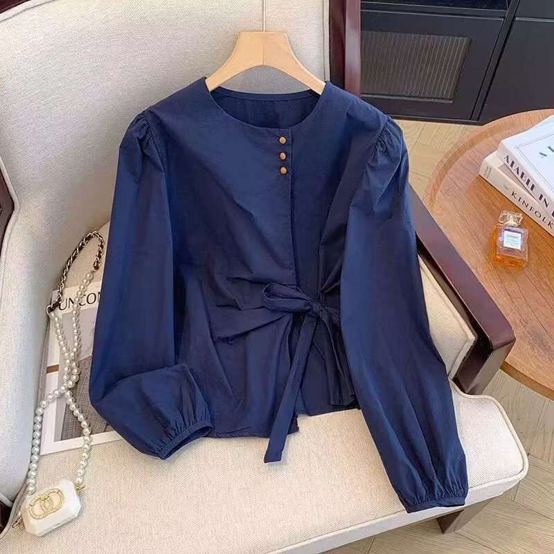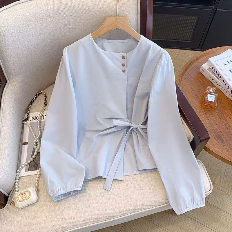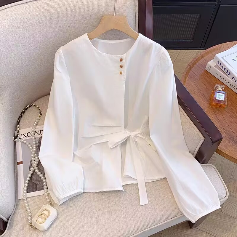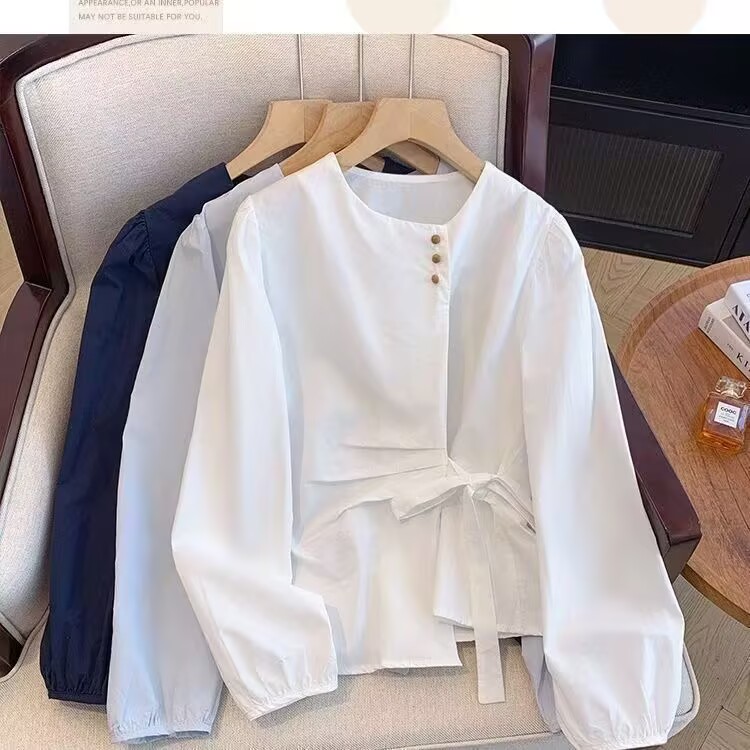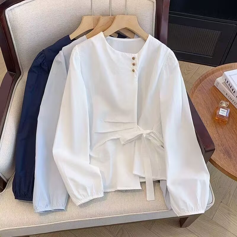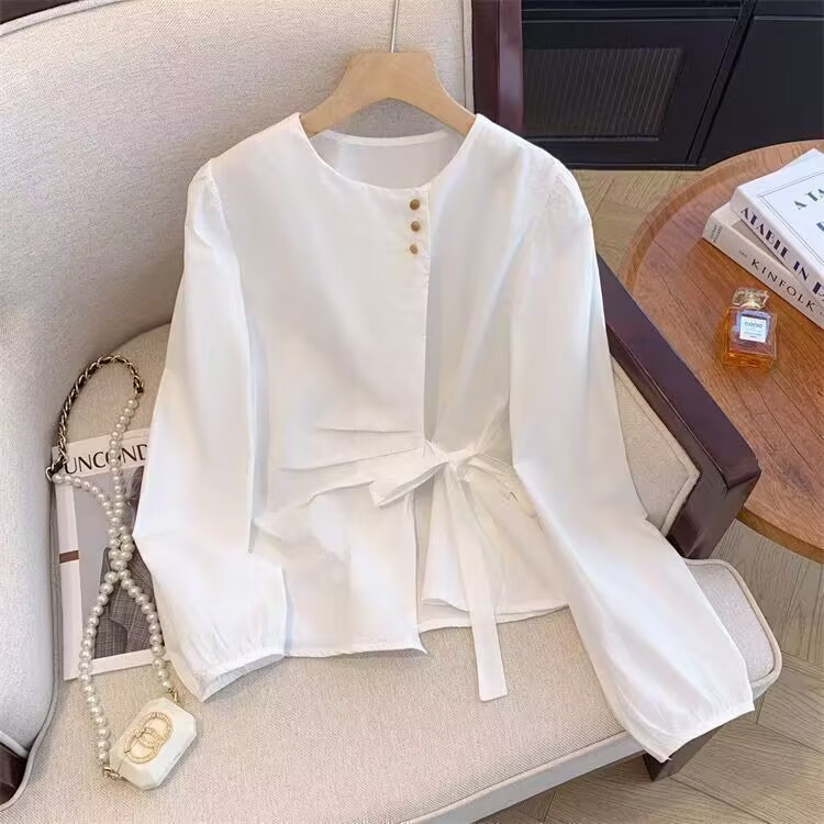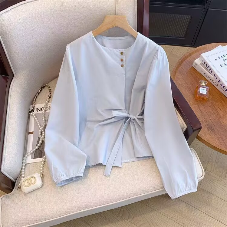 MY15647# 韩系气质长袖衬衫女春秋蝴蝶结绑带别致衬衣不规则设计独特上衣女裝貨源服裝批發