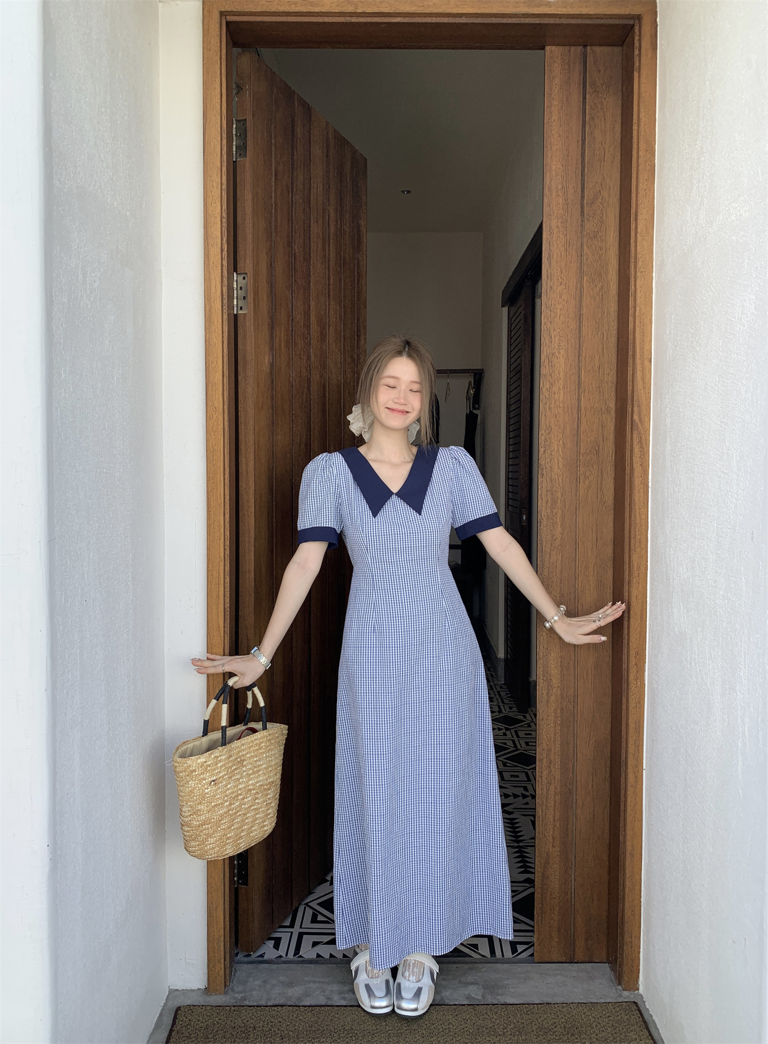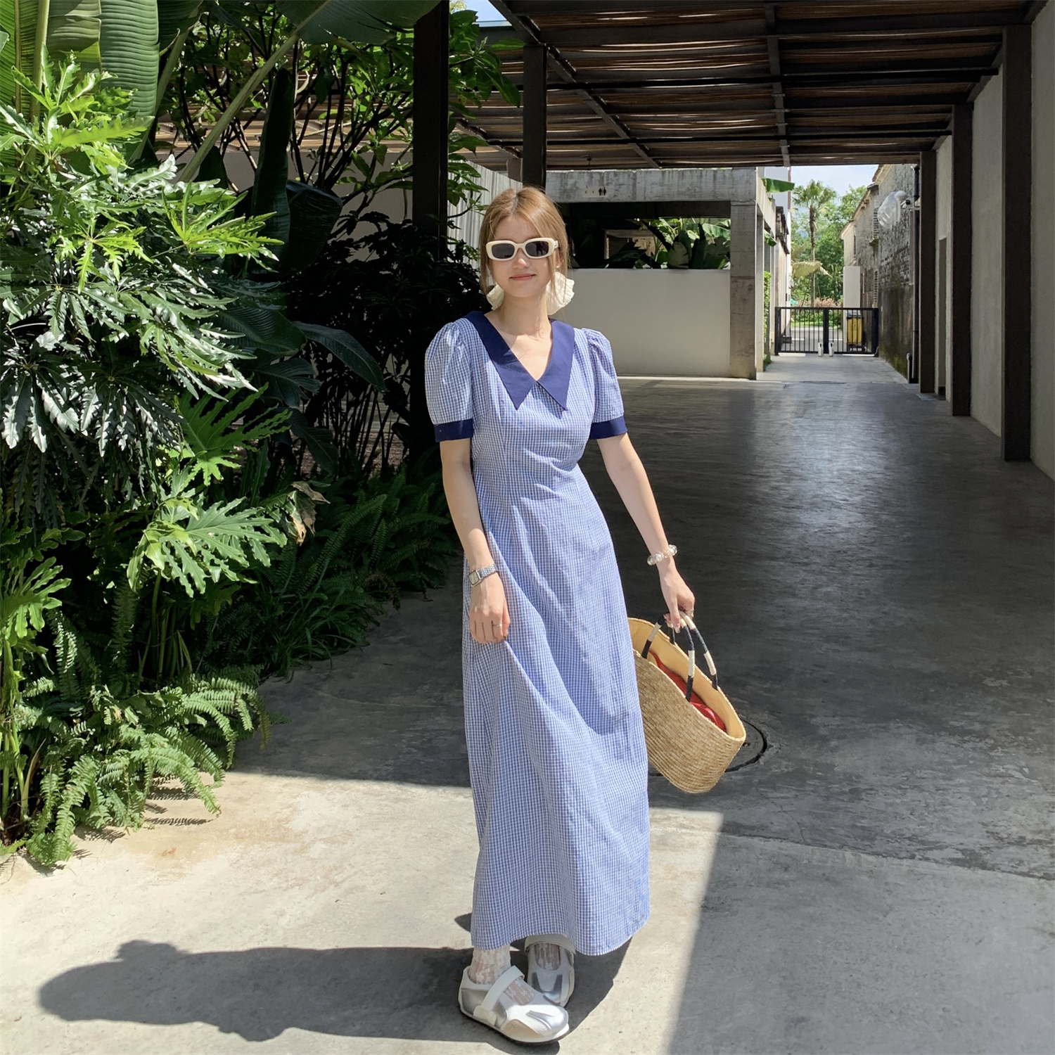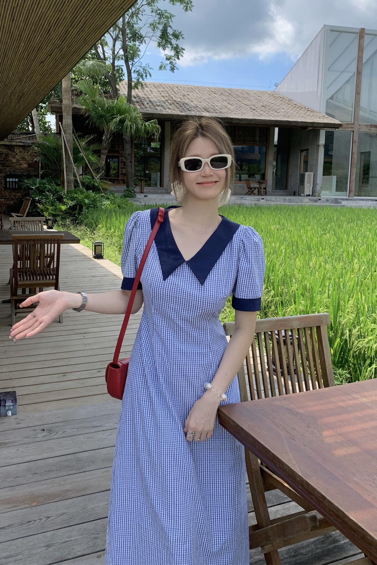 MY16430#韩系设计感撞色翻领格子连衣裙女夏季减龄气质收腰显瘦短袖长裙子