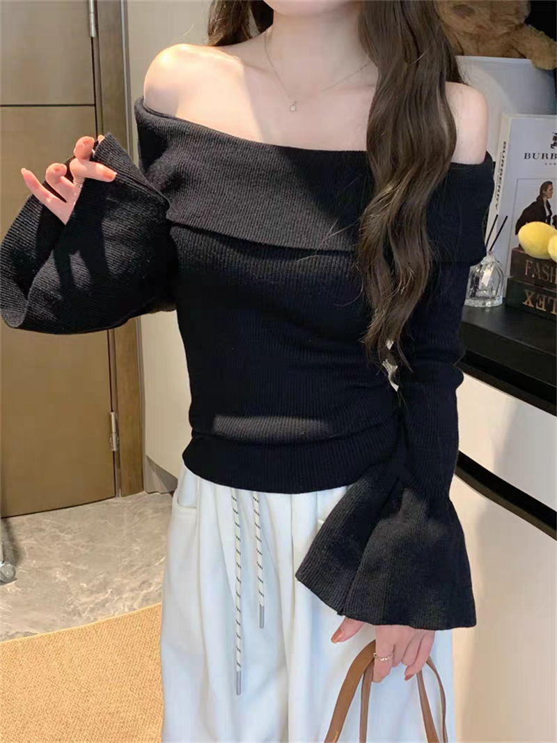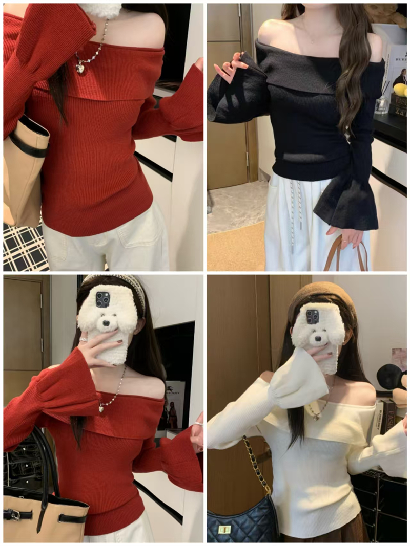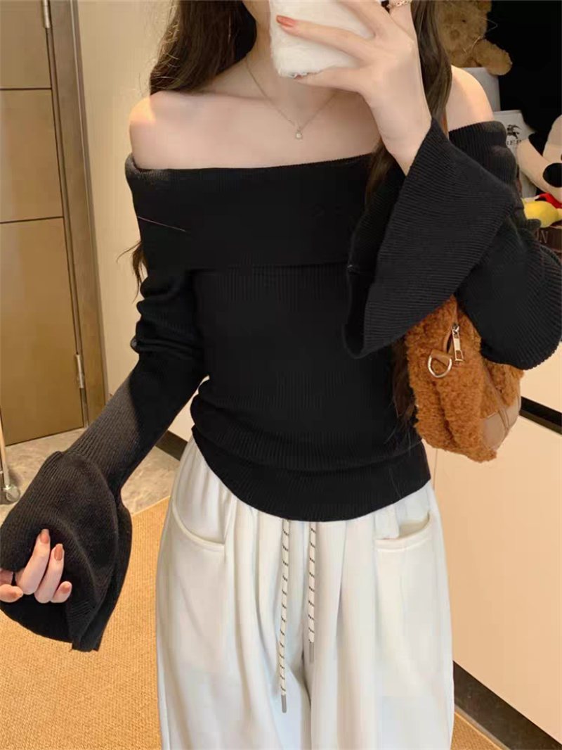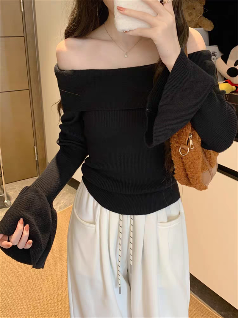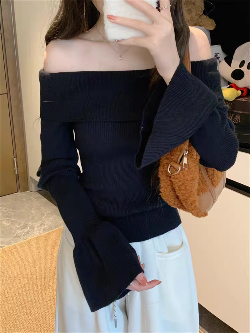 MY16590# 辣妹温柔风一字肩喇叭袖修身长袖针织衫女百搭打底衫露肩上衣女裝貨源服裝批發