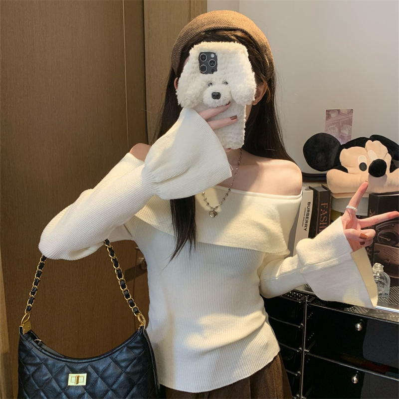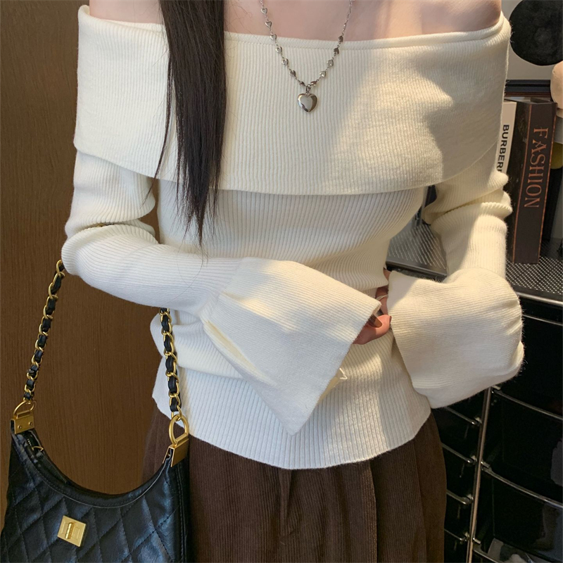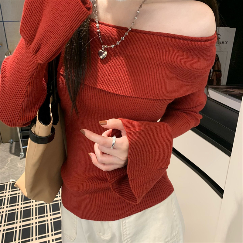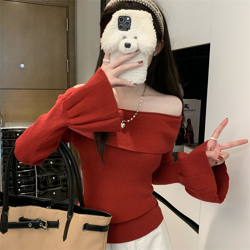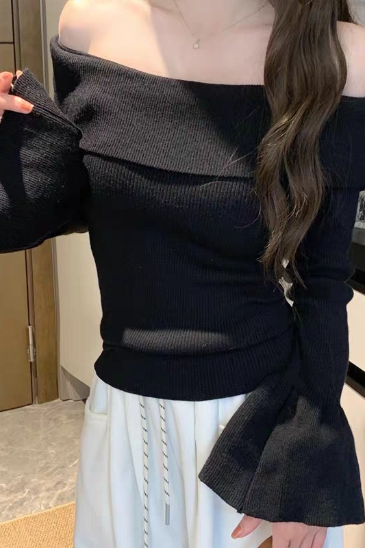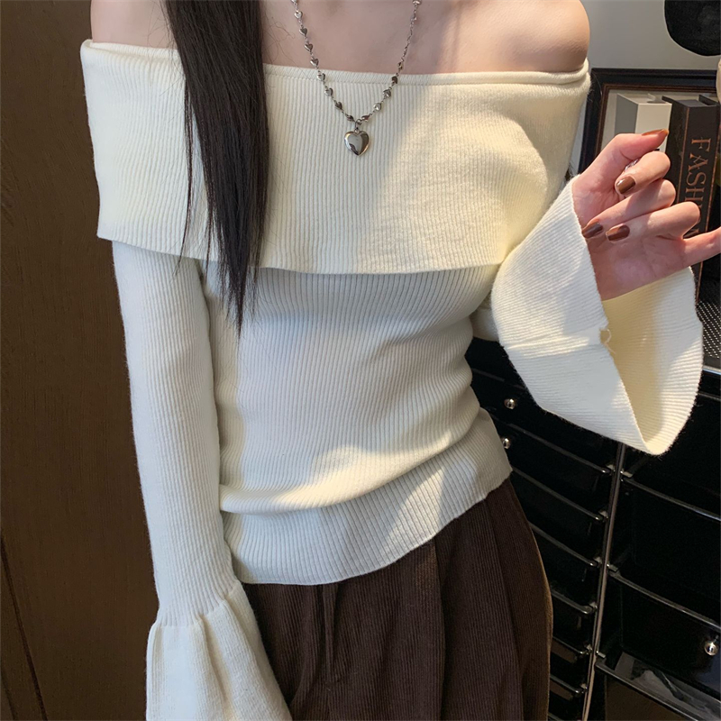 MY16590# 辣妹温柔风一字肩喇叭袖修身长袖针织衫女百搭打底衫露肩上衣女裝貨源服裝批發