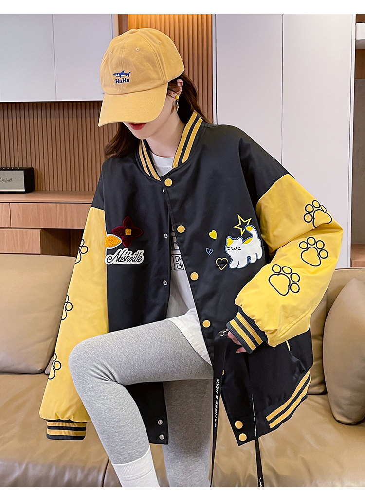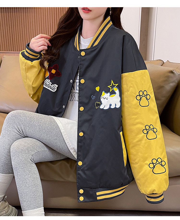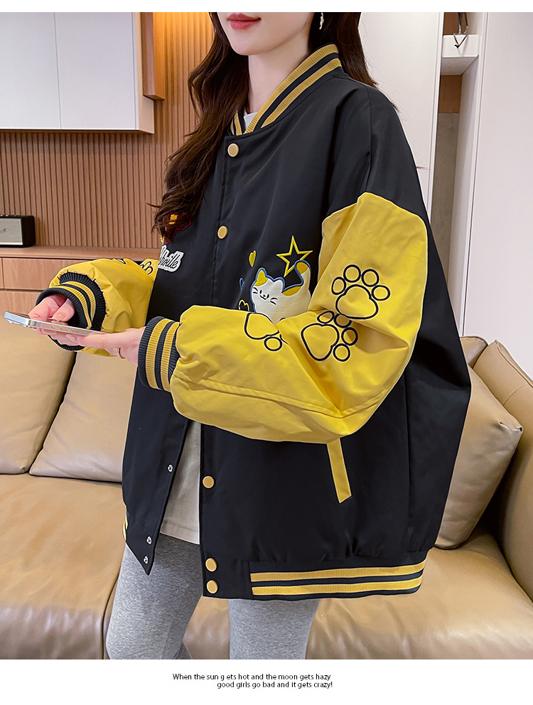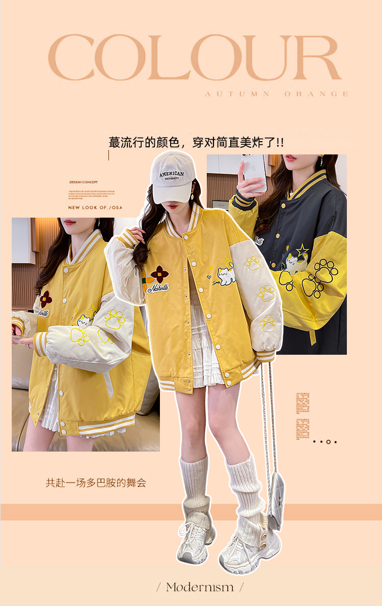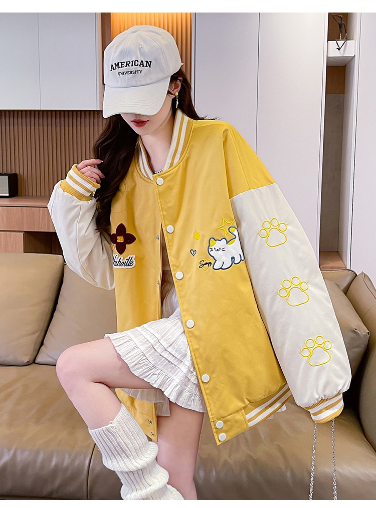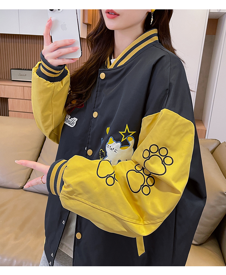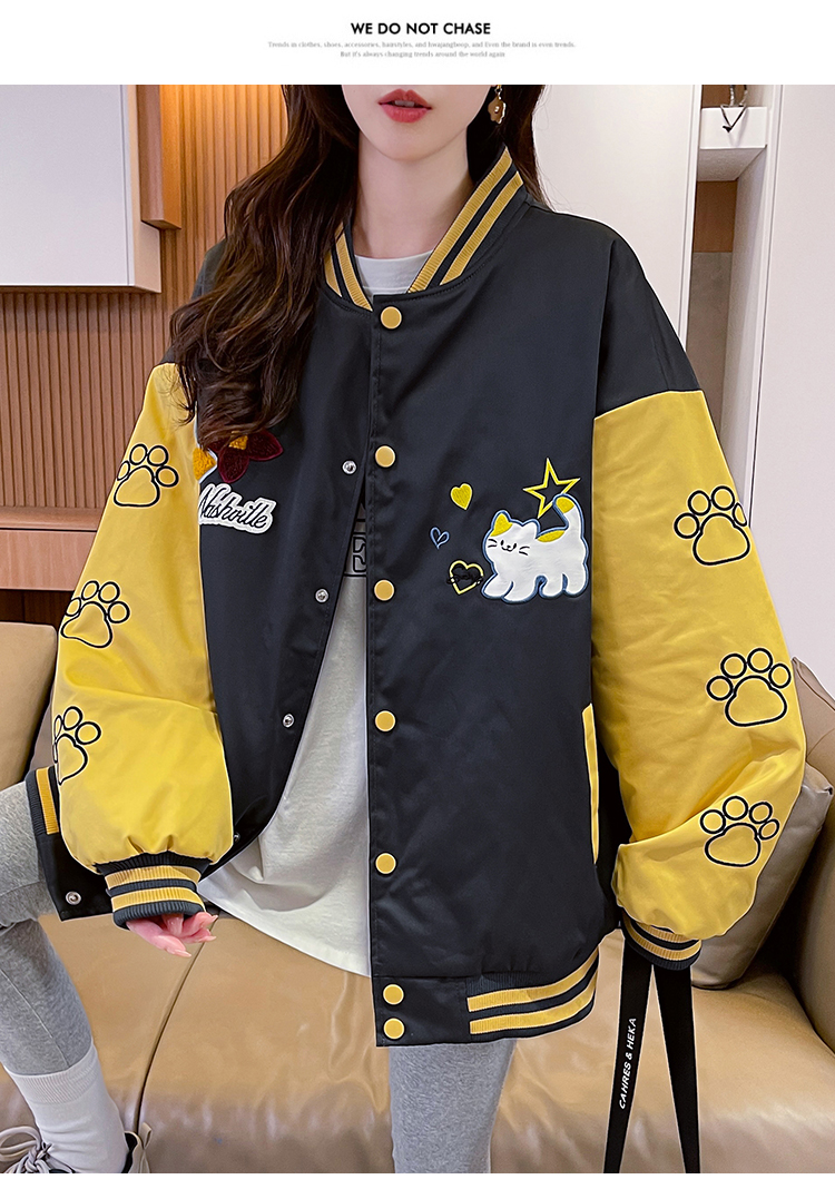 MY17283# 美式甜酷猫爪刺绣撞色超好看夹棉外套棒球服夹克男女百搭宽松情侣女裝貨源服裝批發