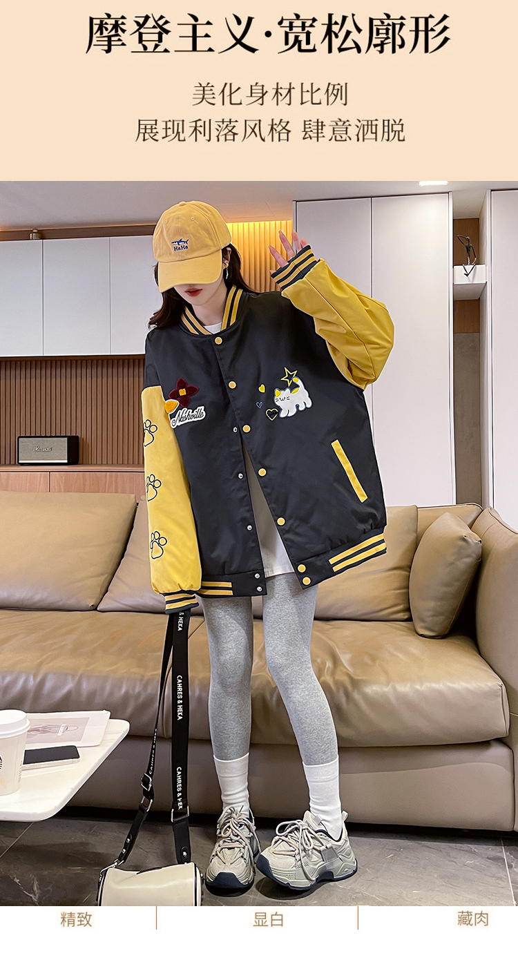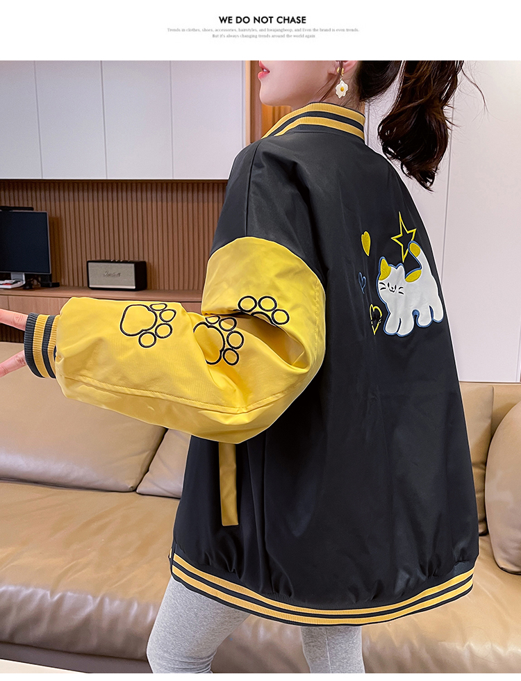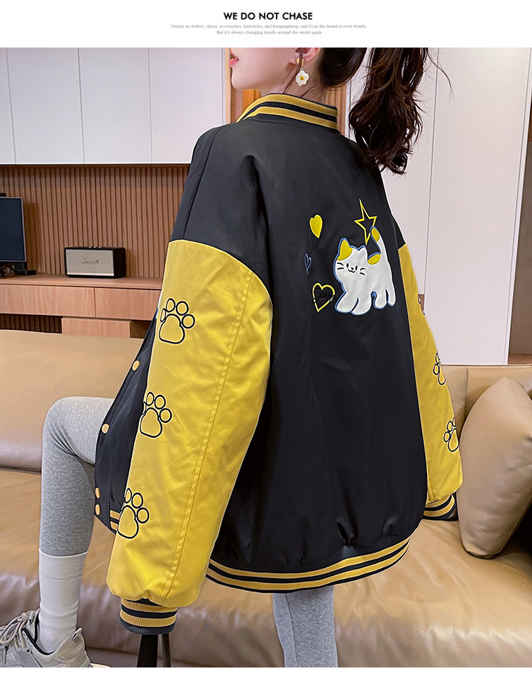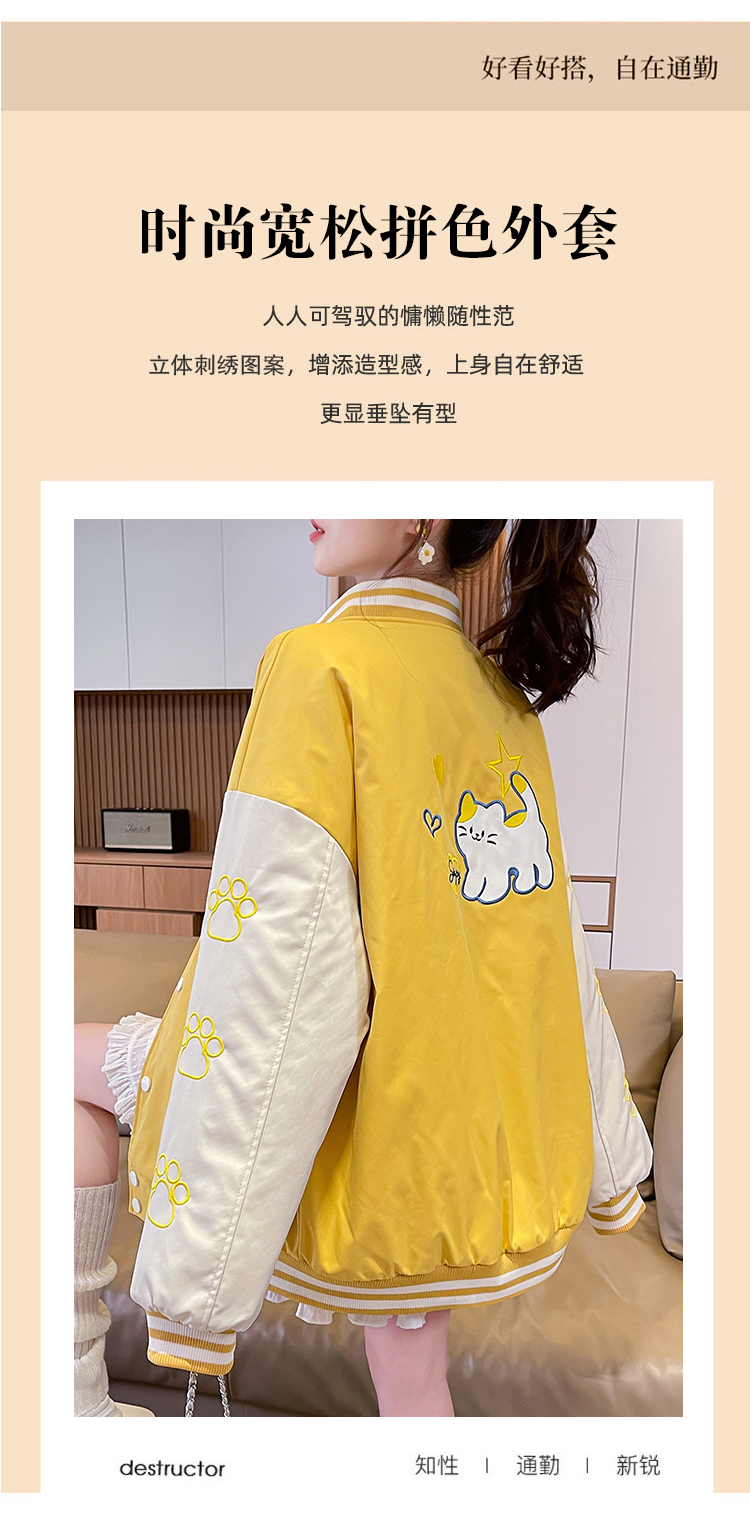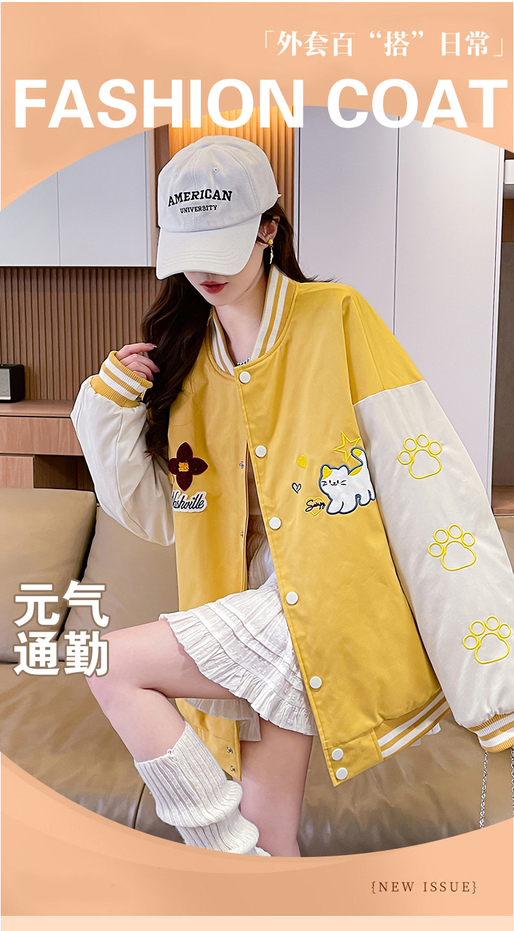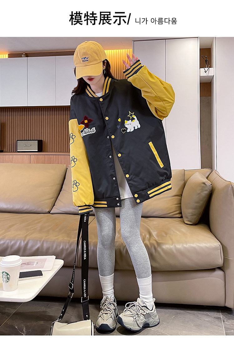 MY17283# 美式甜酷猫爪刺绣撞色超好看夹棉外套棒球服夹克男女百搭宽松情侣女裝貨源服裝批發