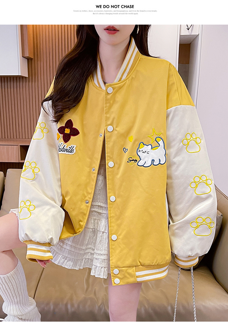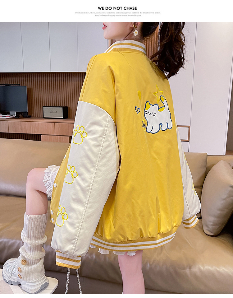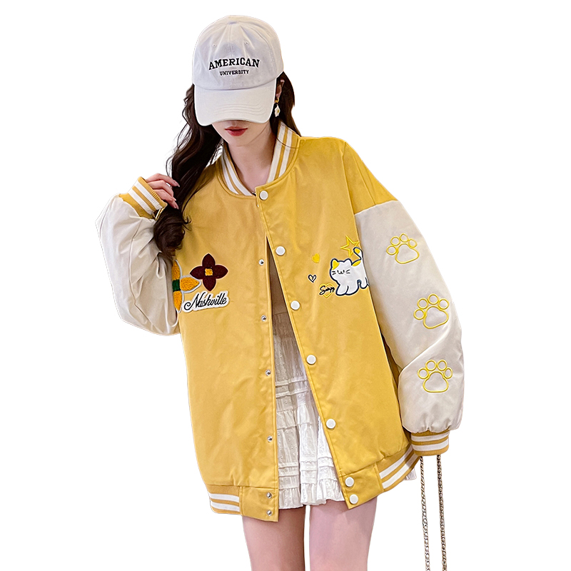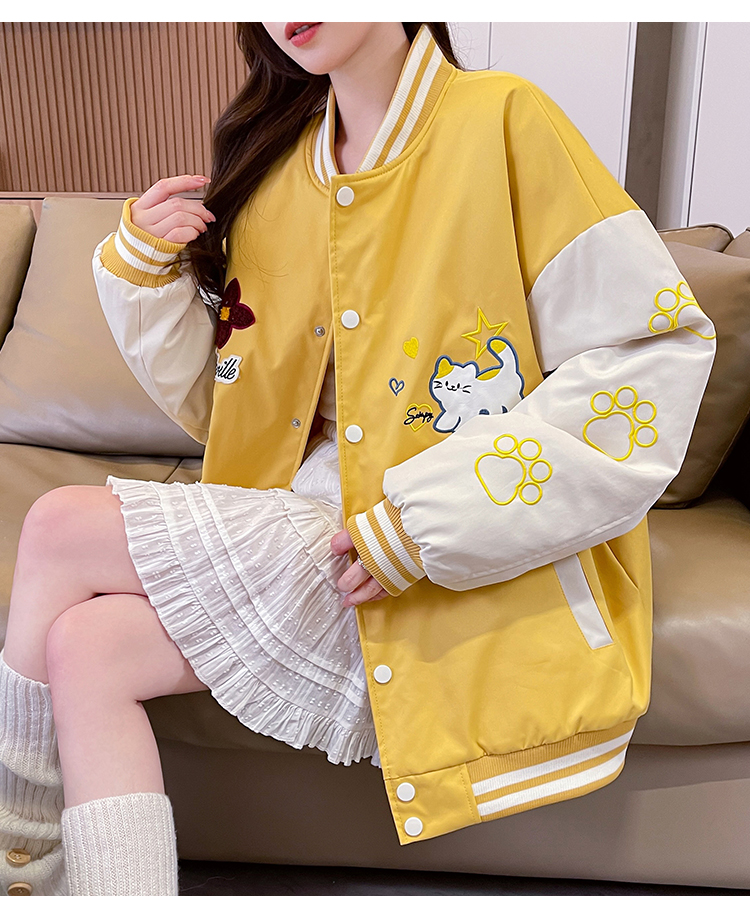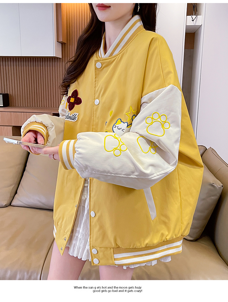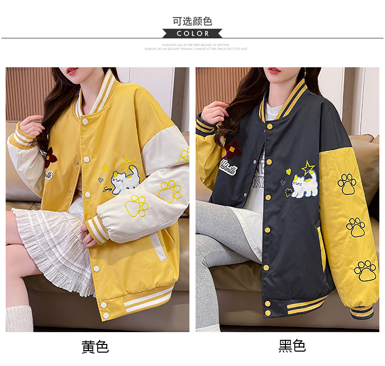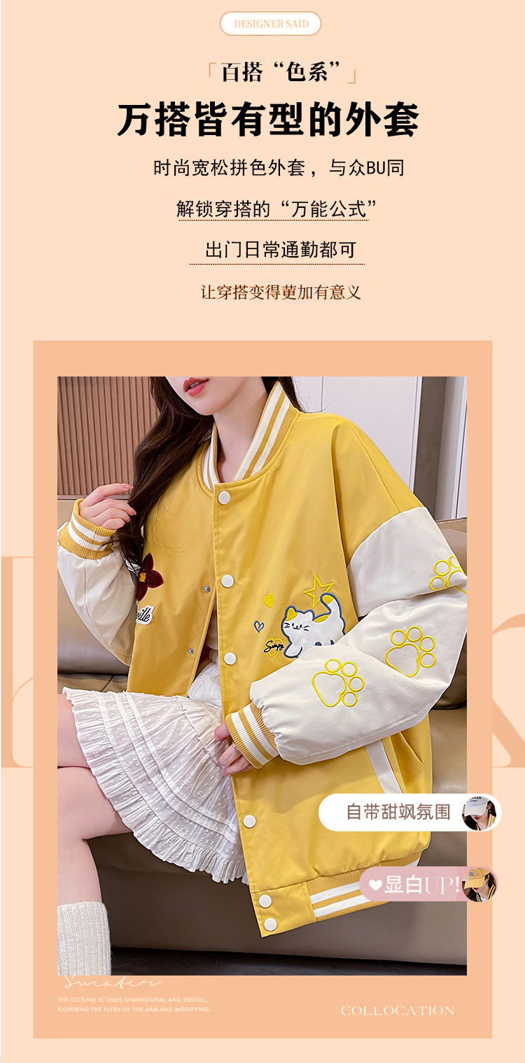 MY17283# 美式甜酷猫爪刺绣撞色超好看夹棉外套棒球服夹克男女百搭宽松情侣女裝貨源服裝批發