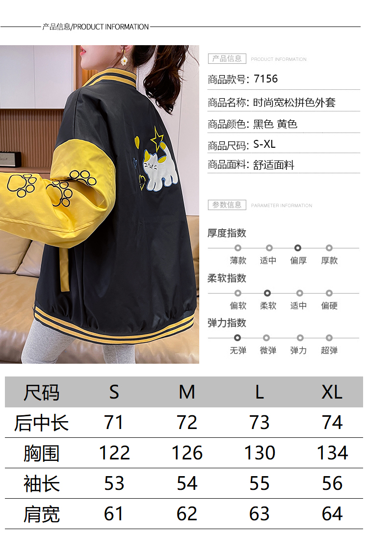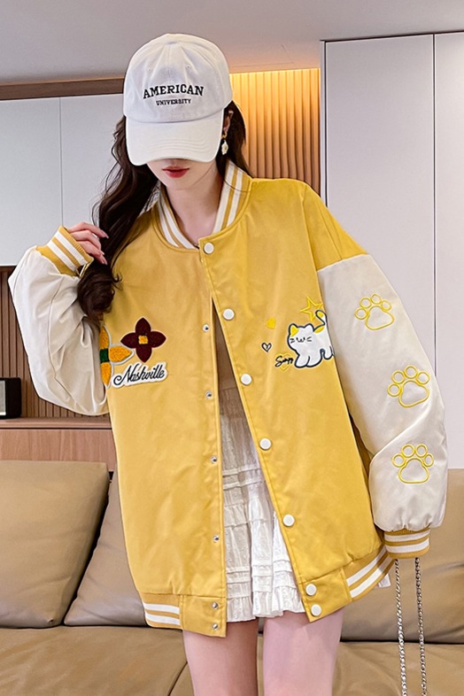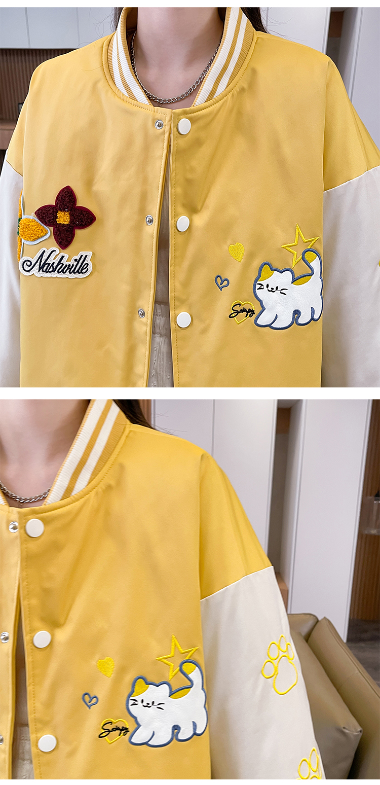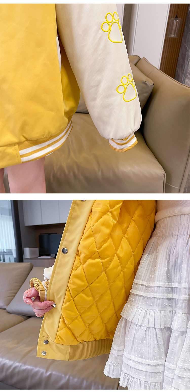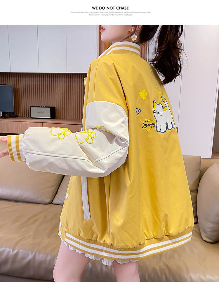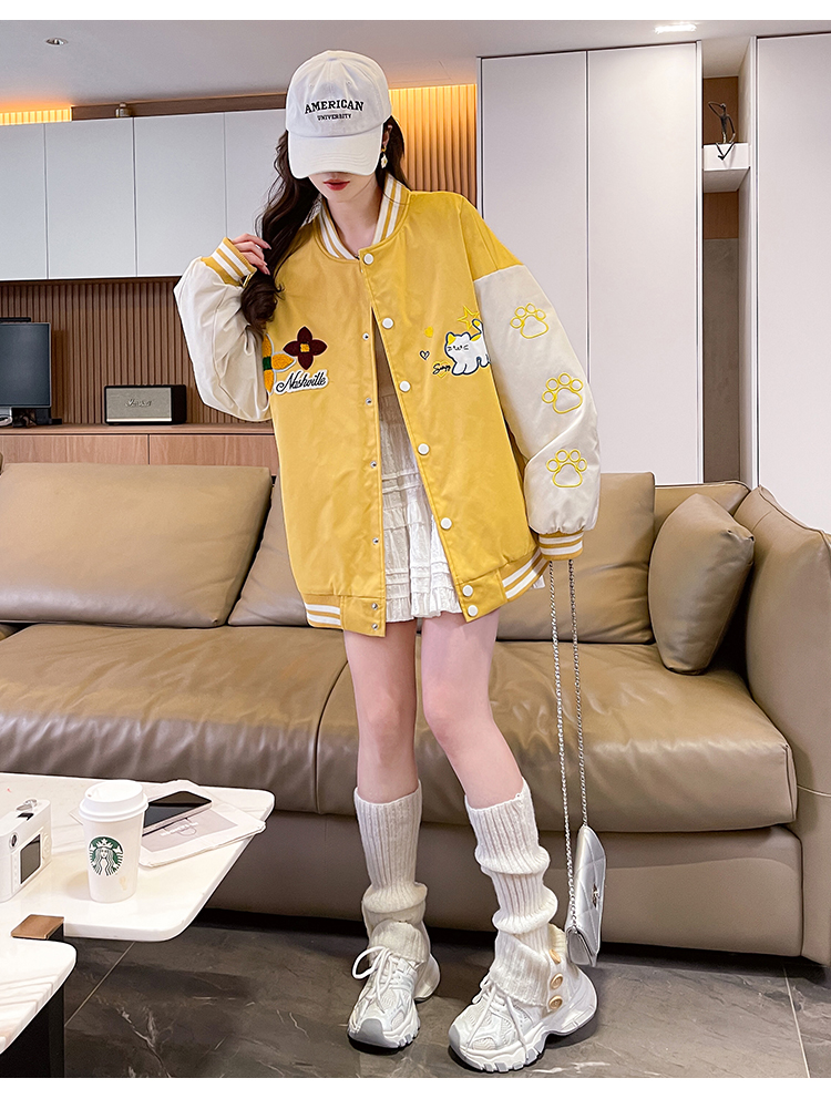 MY17283# 美式甜酷猫爪刺绣撞色超好看夹棉外套棒球服夹克男女百搭宽松情侣女裝貨源服裝批發