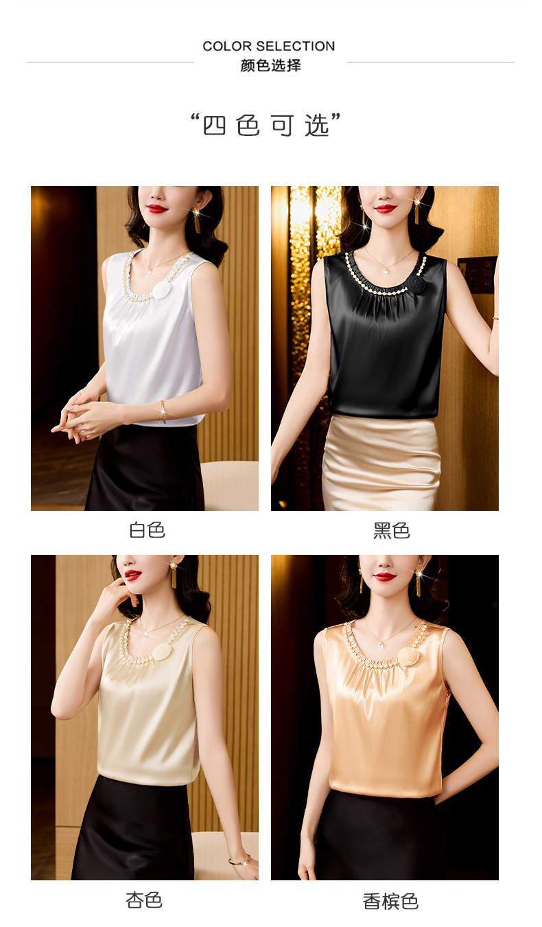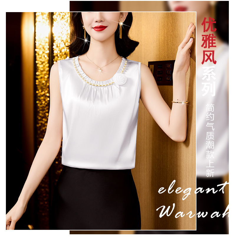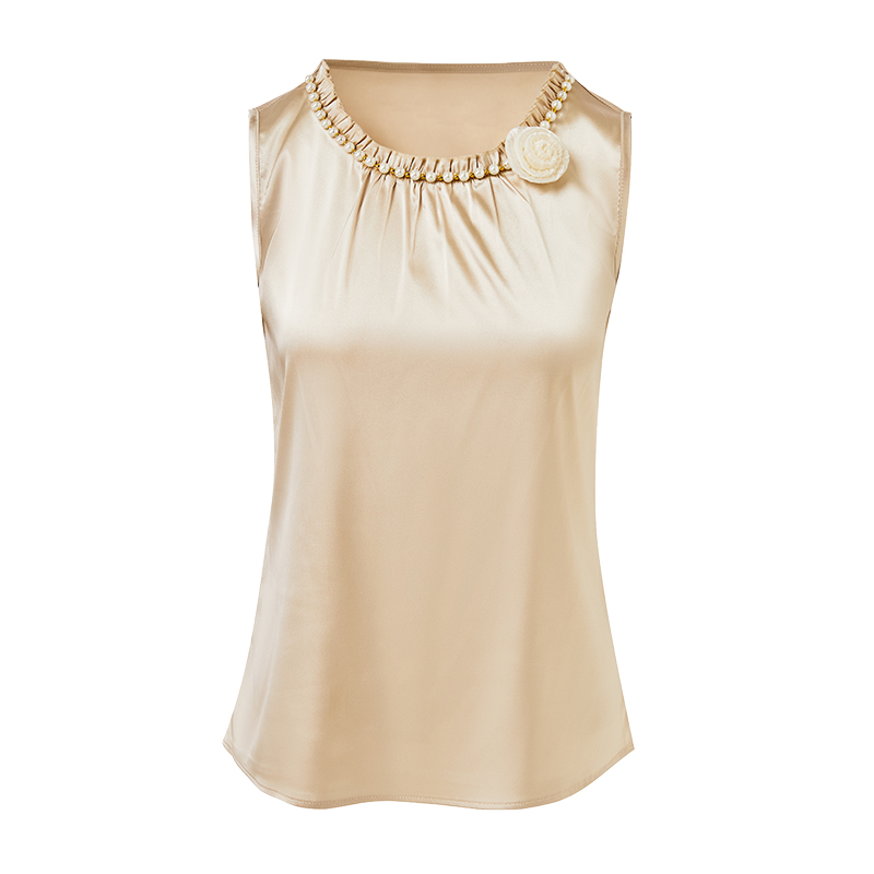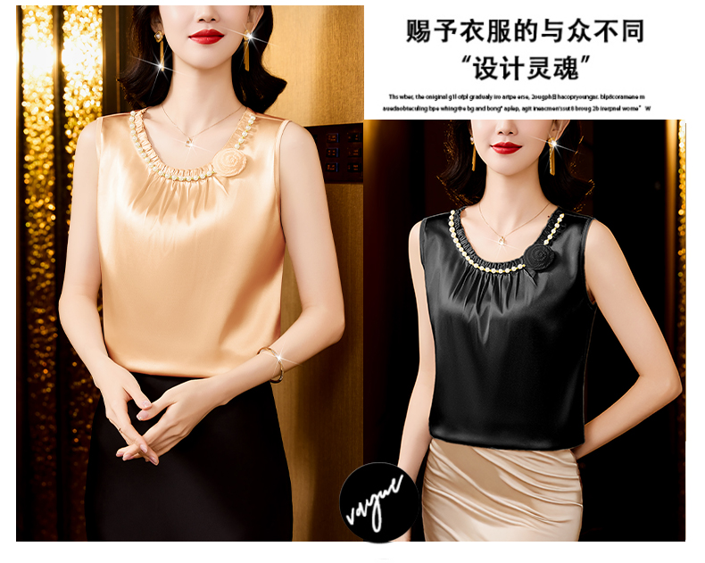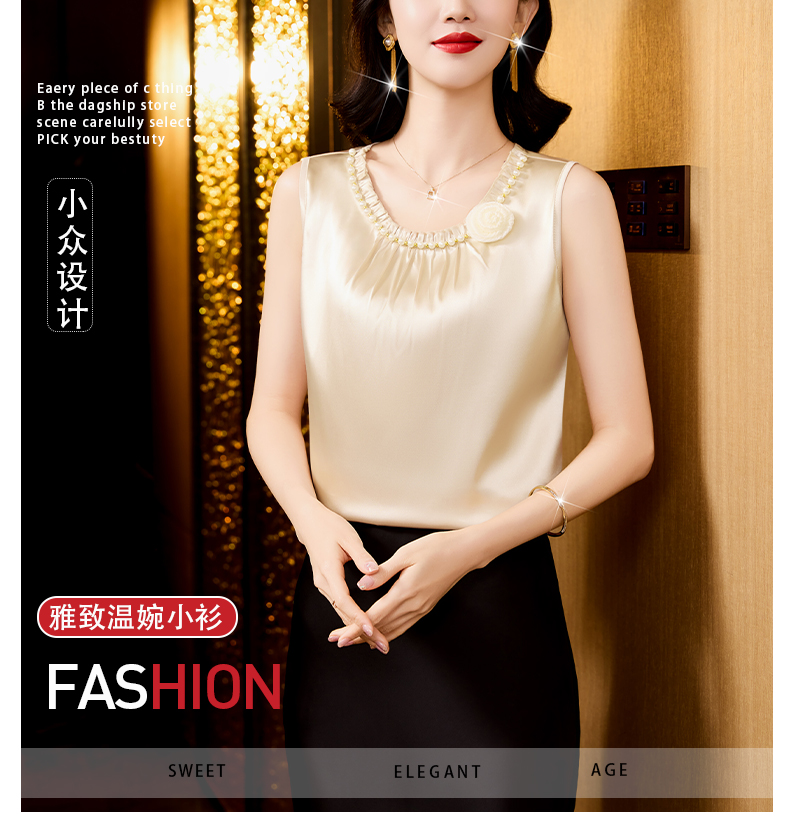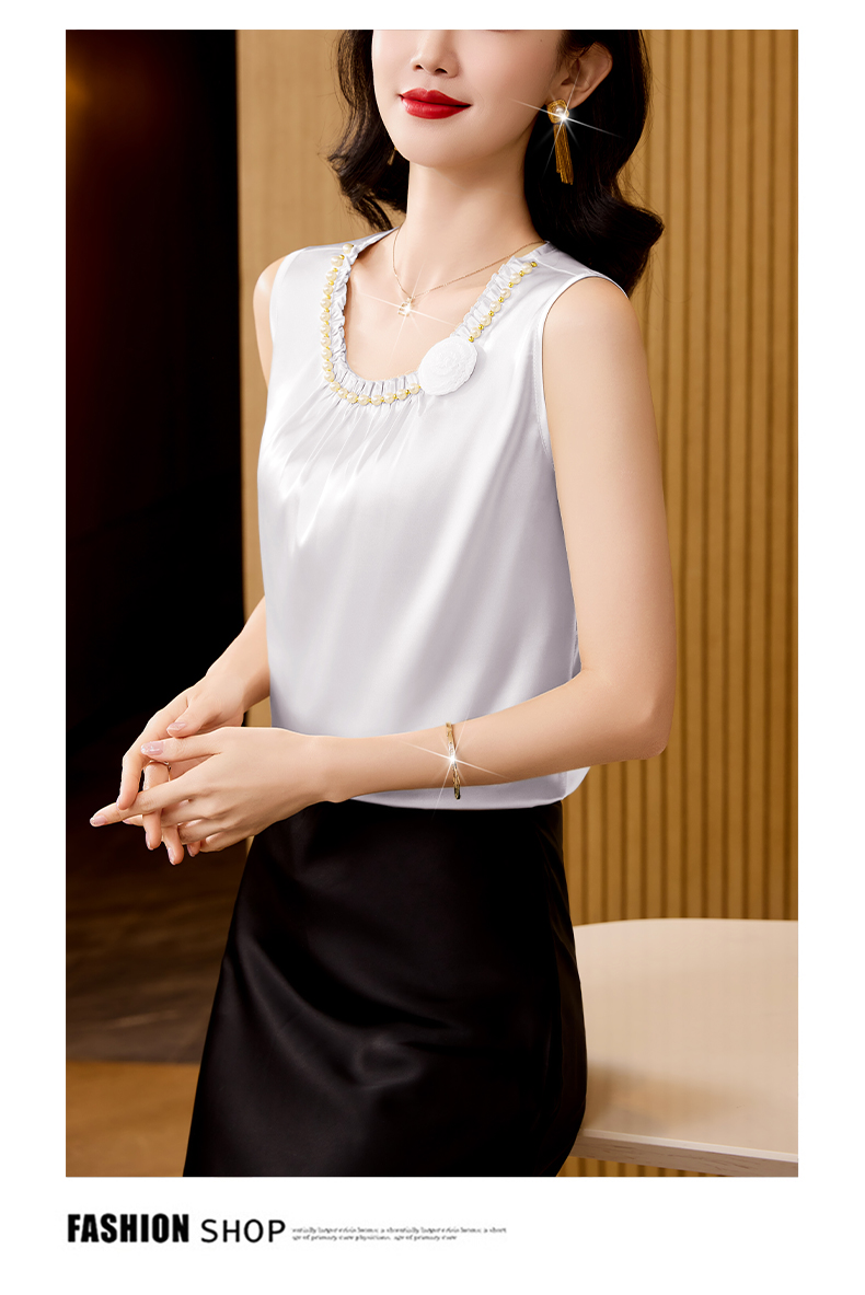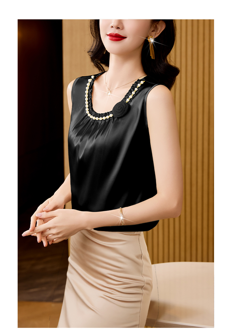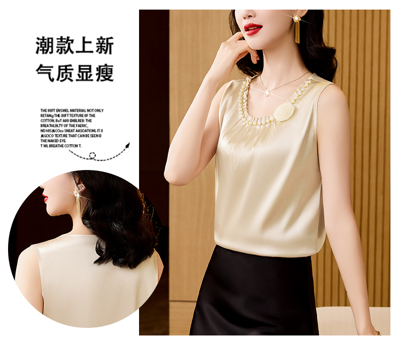 MY17394# 圆领钉珠花朵新款时尚洋气内搭缎面背心女裝貨源服裝批發