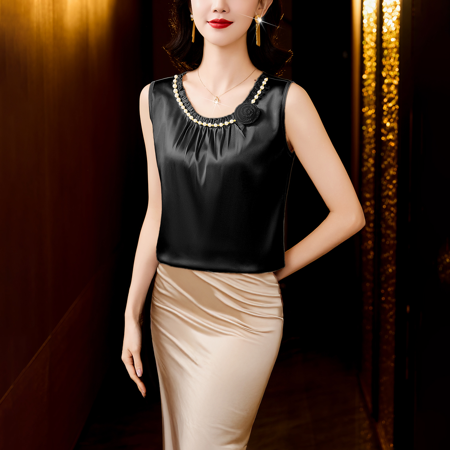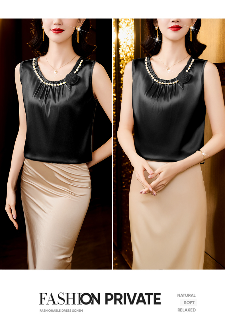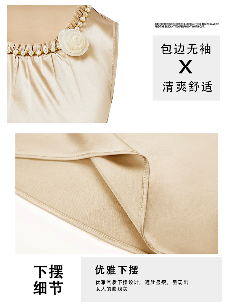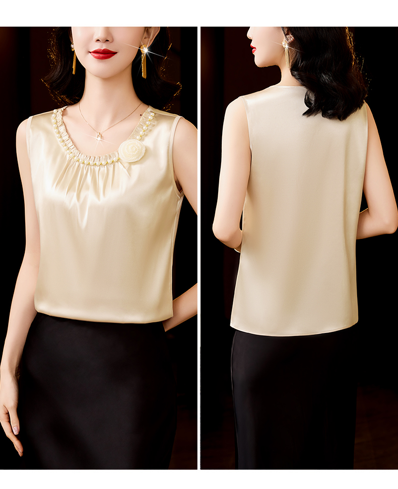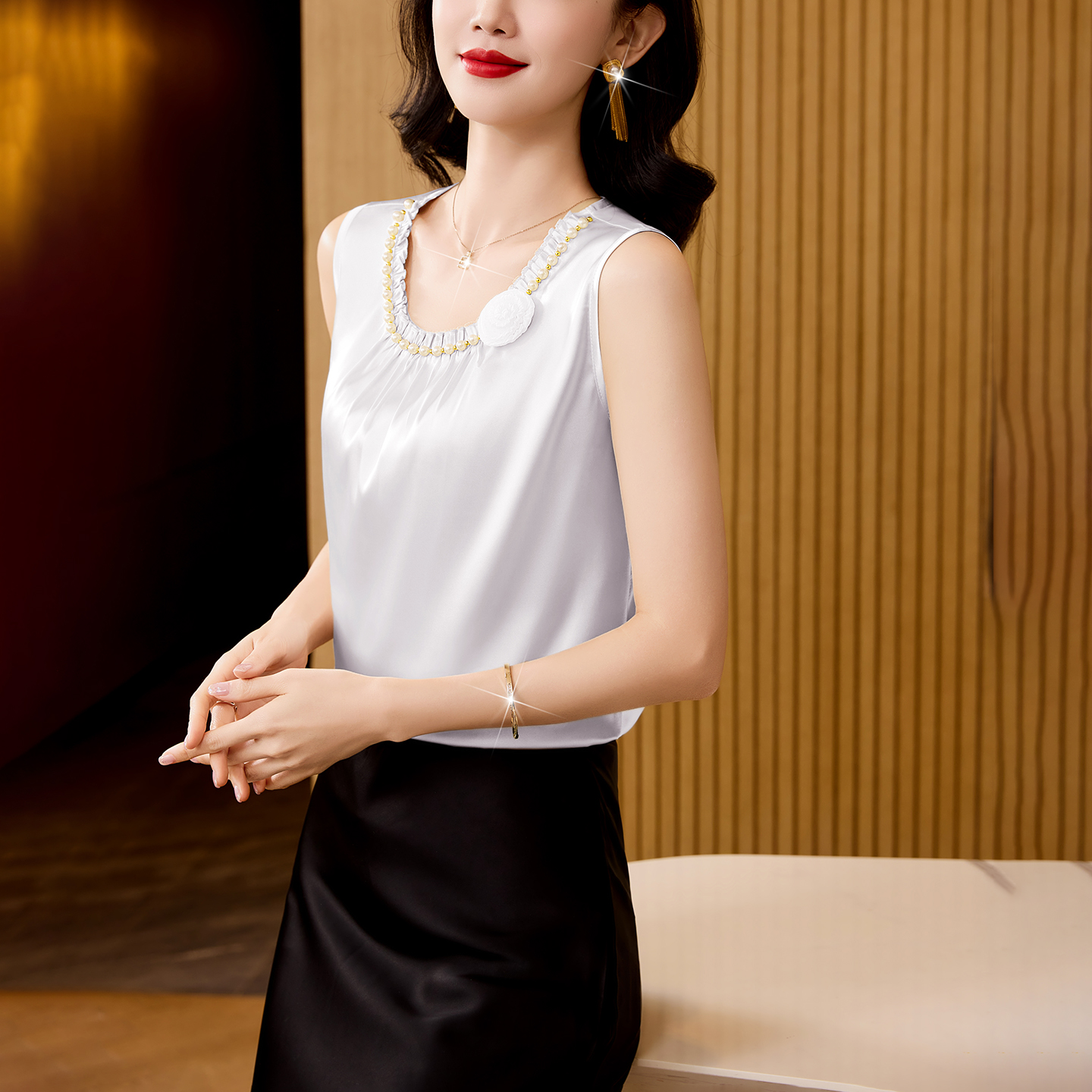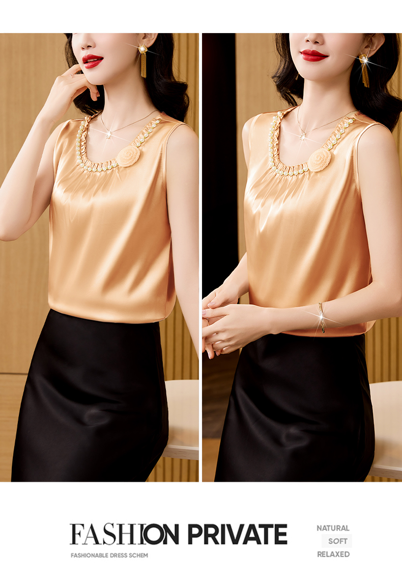 MY17394# 圆领钉珠花朵新款时尚洋气内搭缎面背心女裝貨源服裝批發