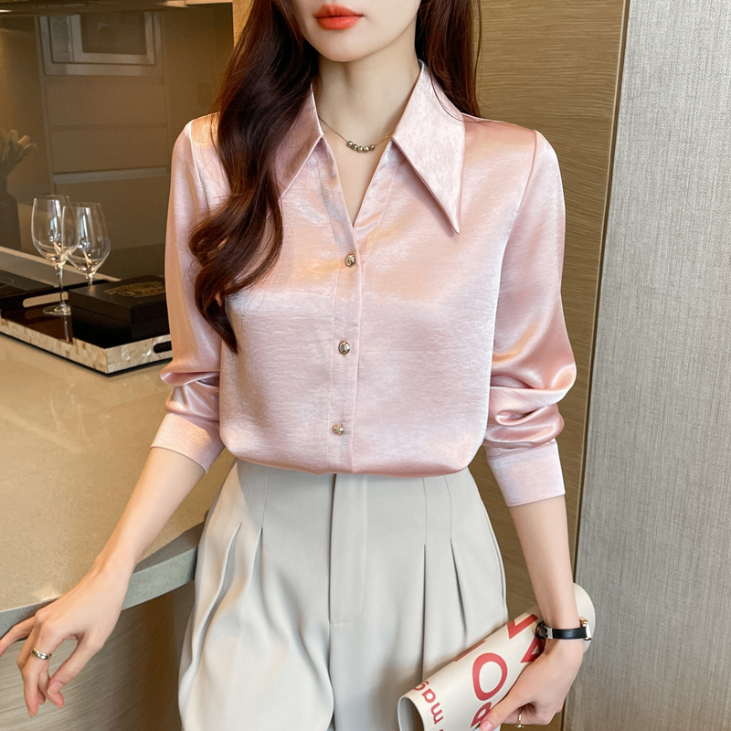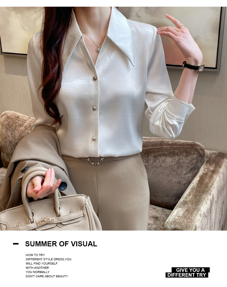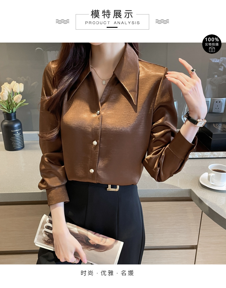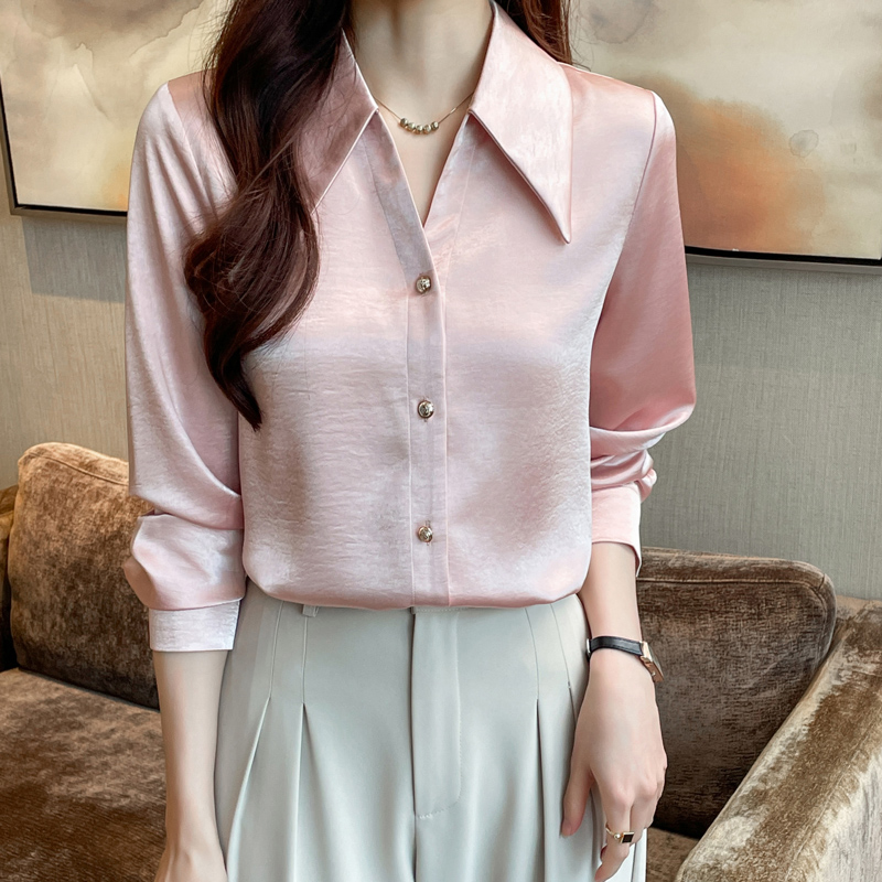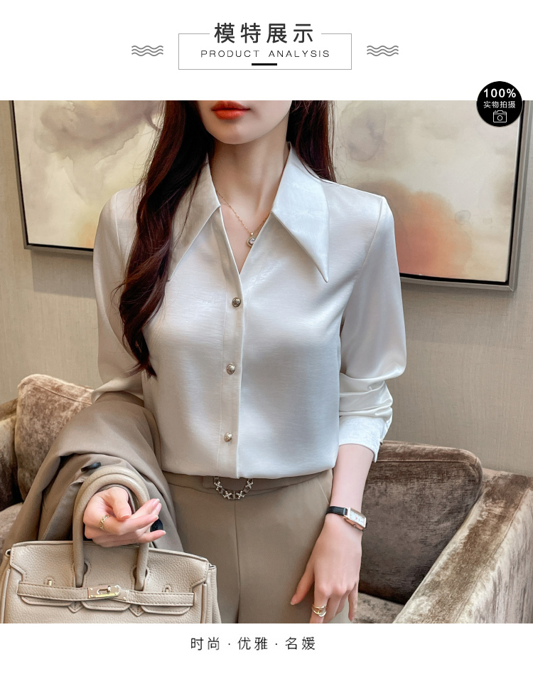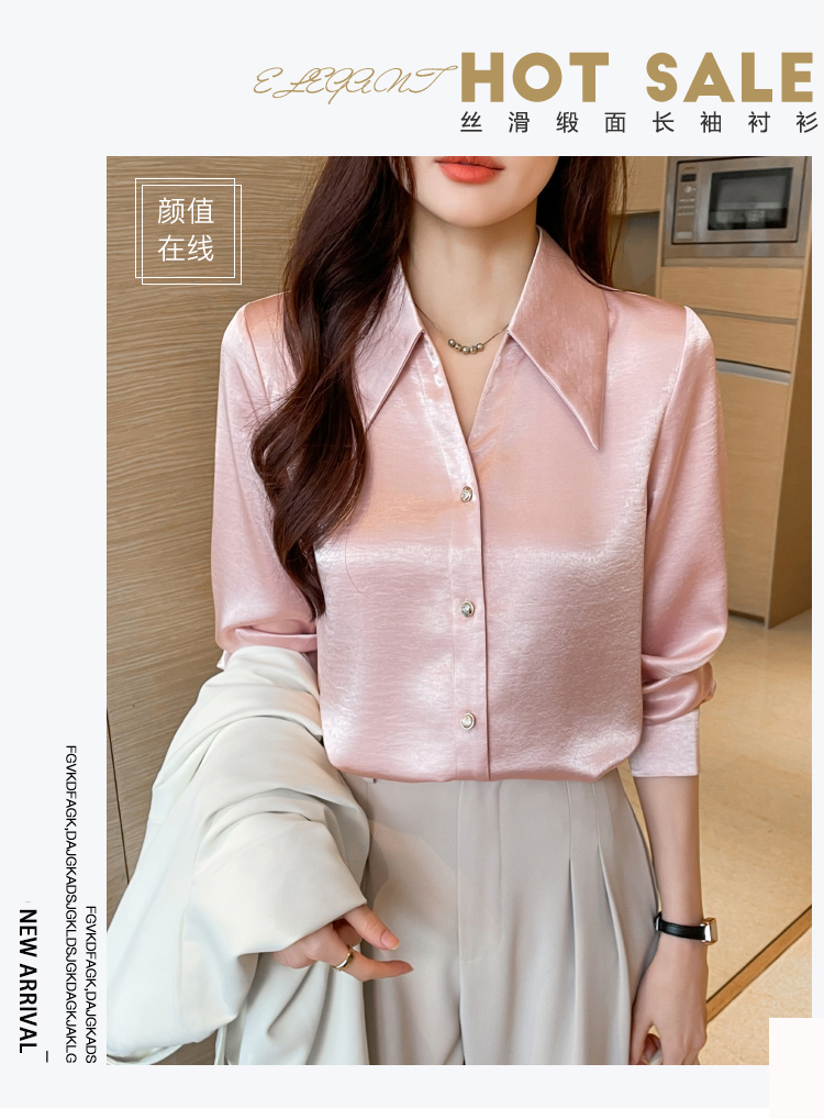 MY17424# 法式气质V领衬衫女长袖高级感缎面衬衣女裝貨源服裝批發