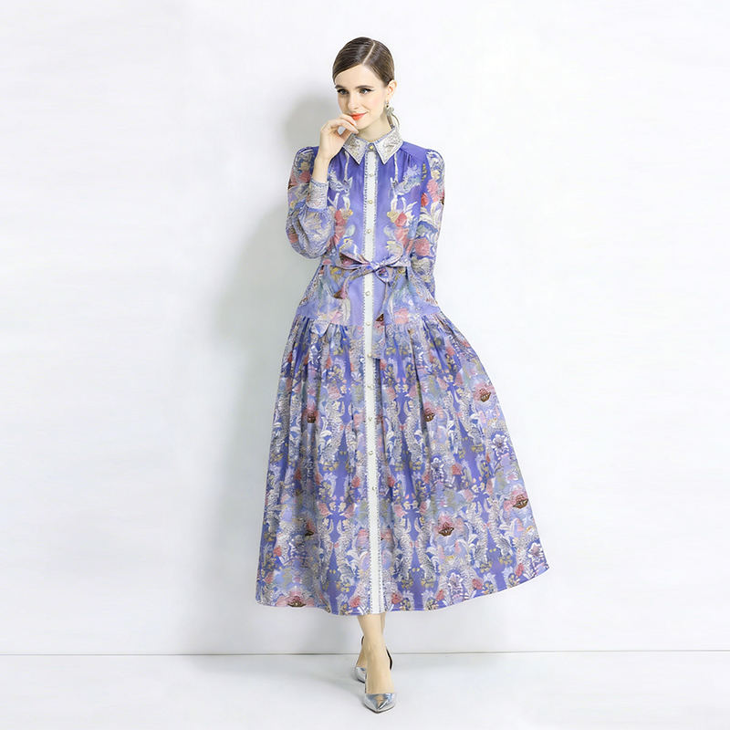 MY17510# 新款复古两件套翻领灯笼袖印花连衣裙长裙女裝貨源服裝批發