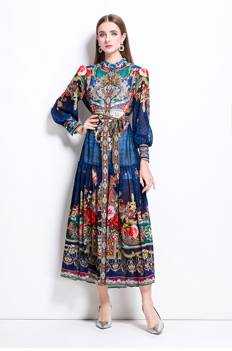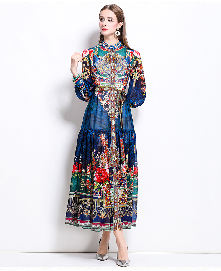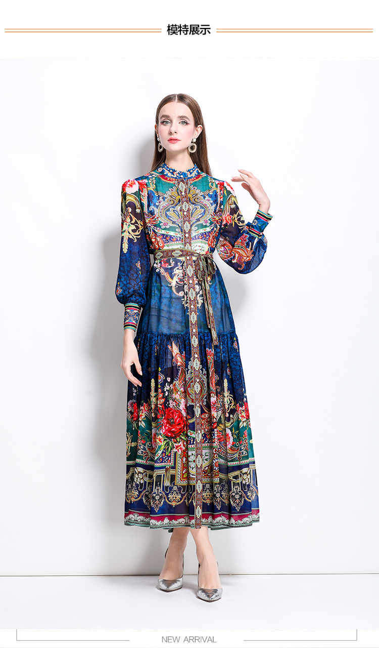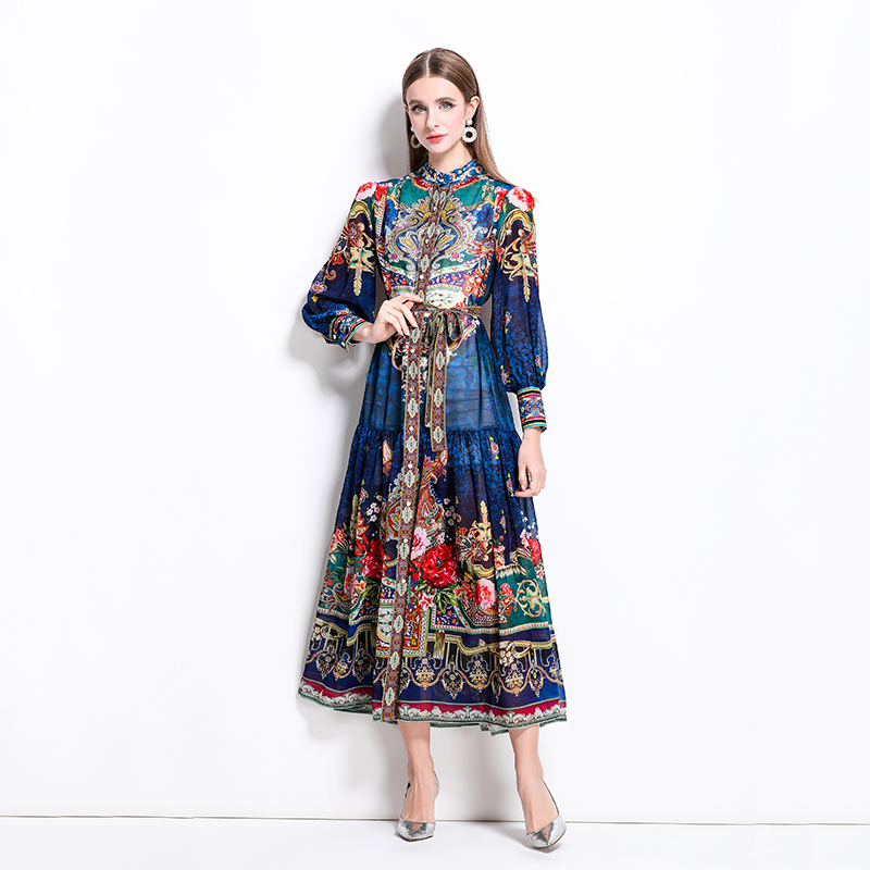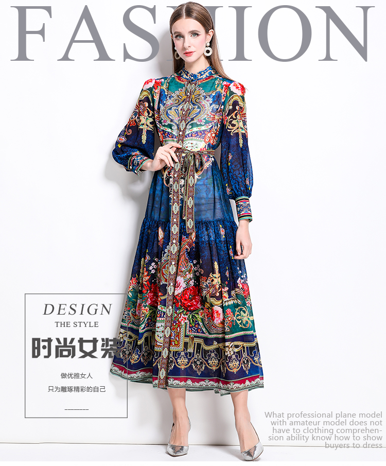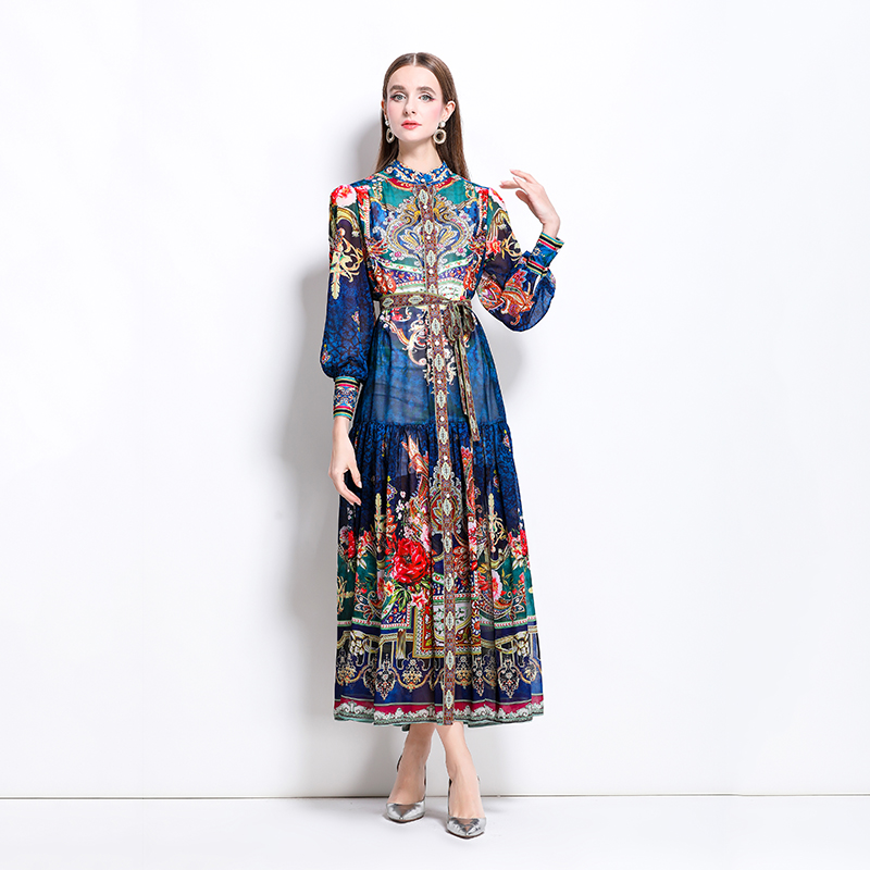 MY17516# 新款复古雪纺立领灯笼袖印花连衣裙长裙女裝貨源服裝批發