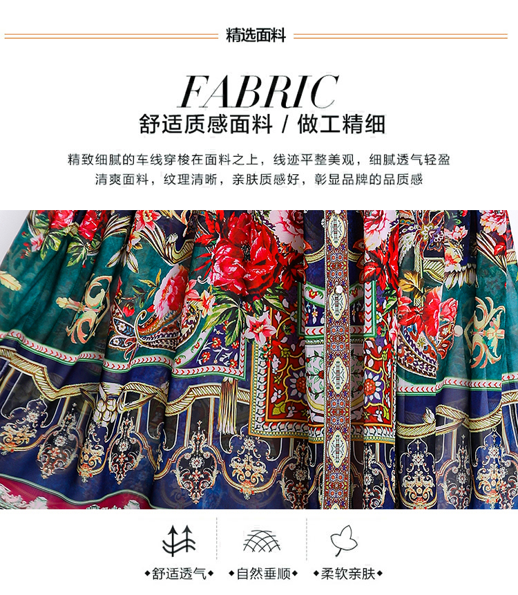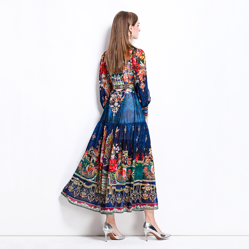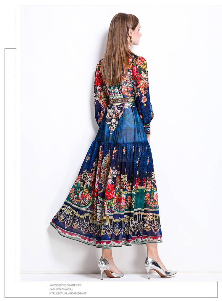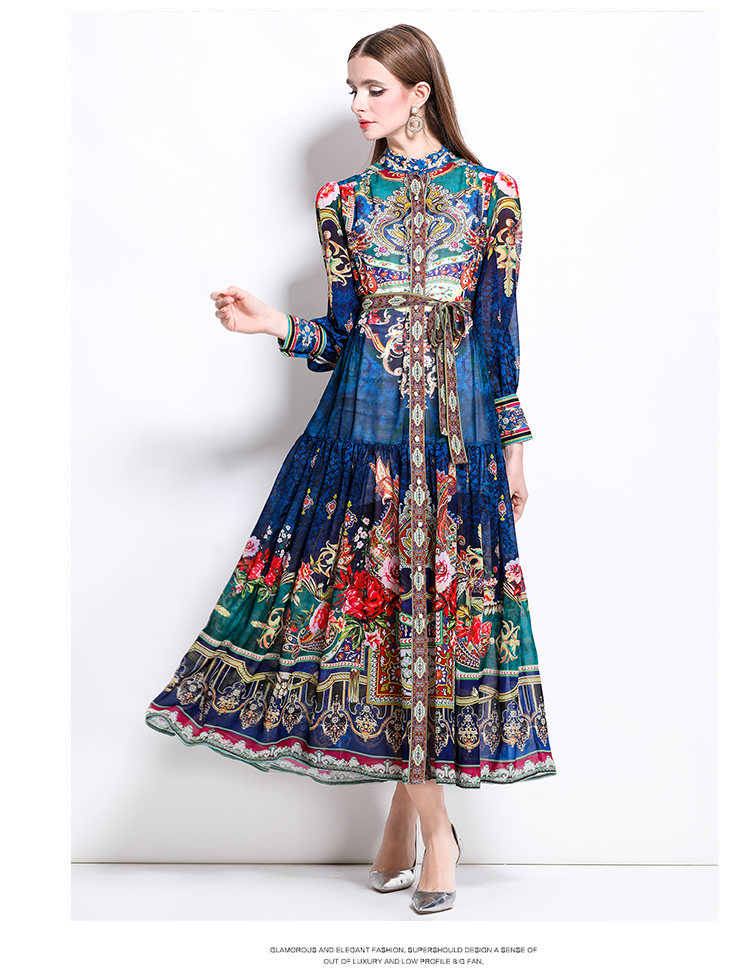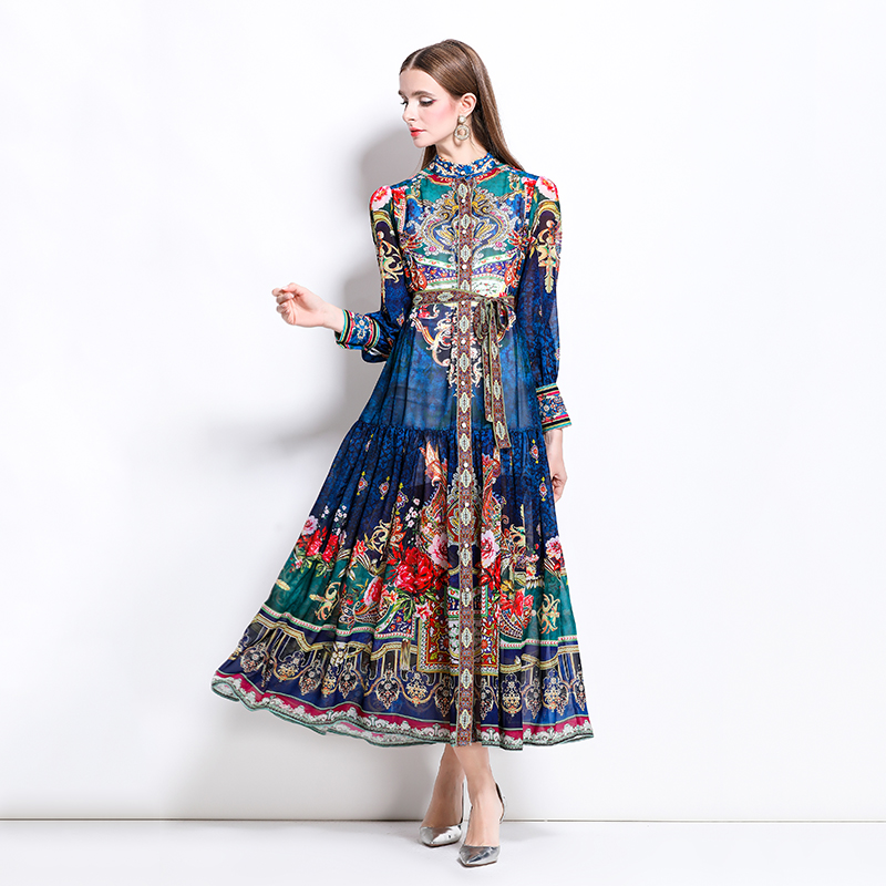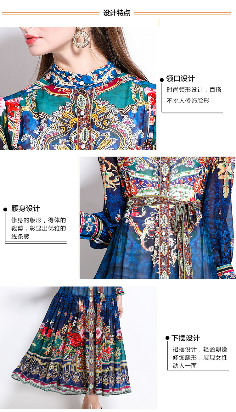 MY17516# 新款复古雪纺立领灯笼袖印花连衣裙长裙女裝貨源服裝批發