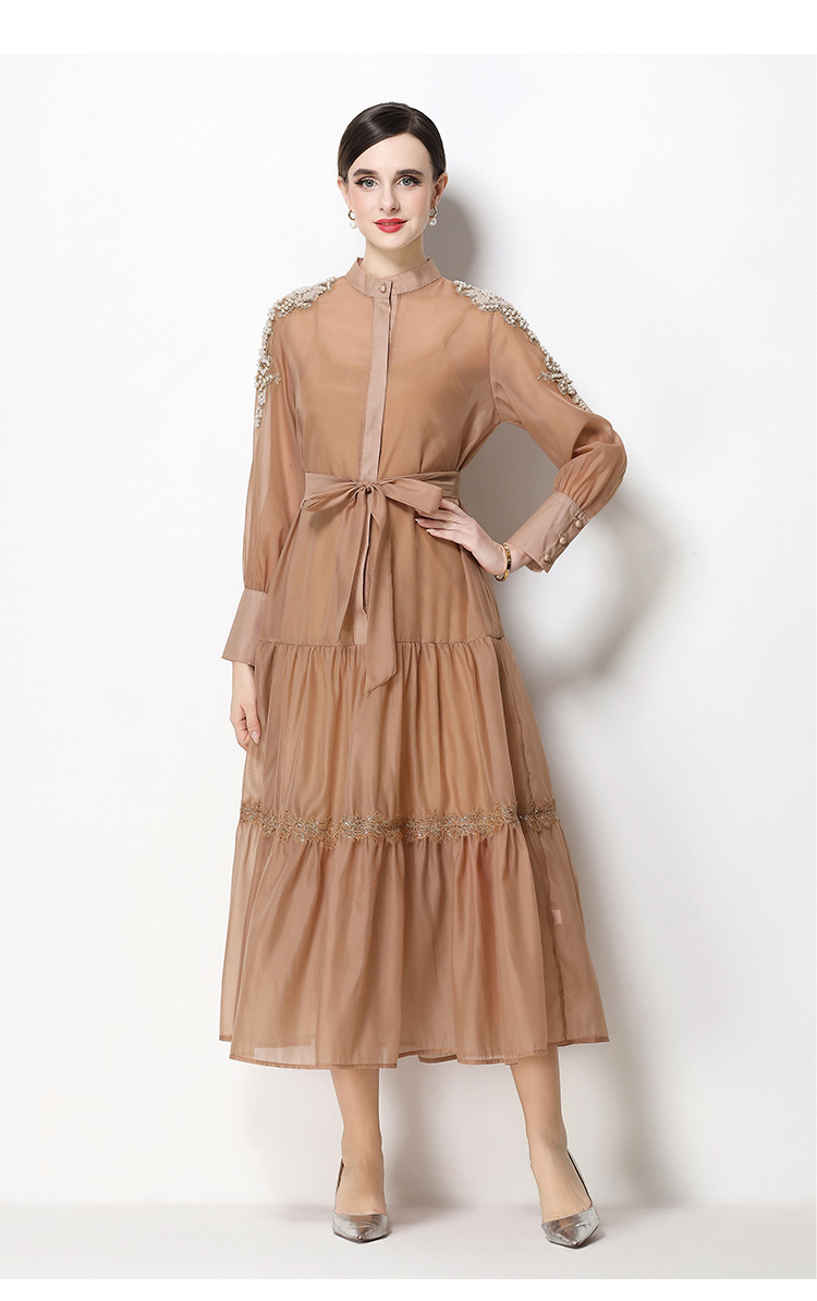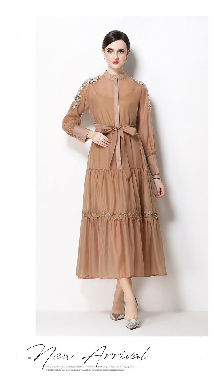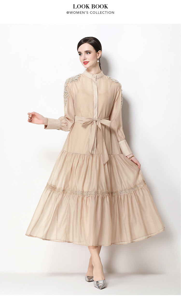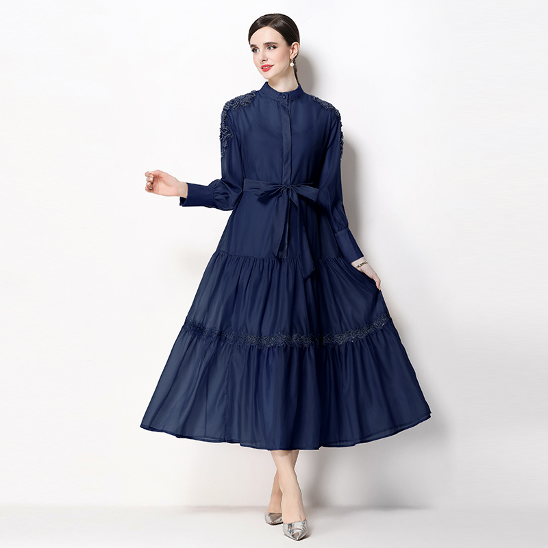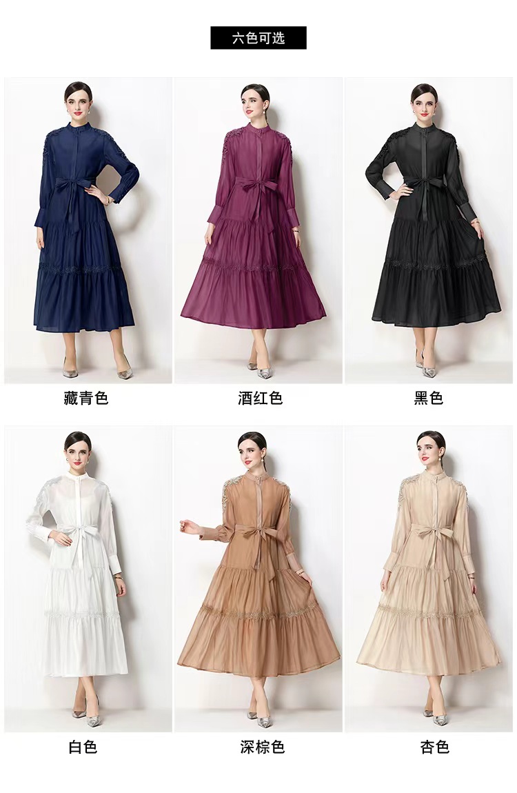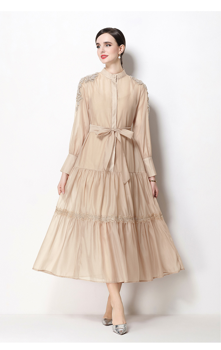 RY783# 2026春夏新款圆领单排扣复古刺绣钉珠宽松长裙连衣裙配腰带
