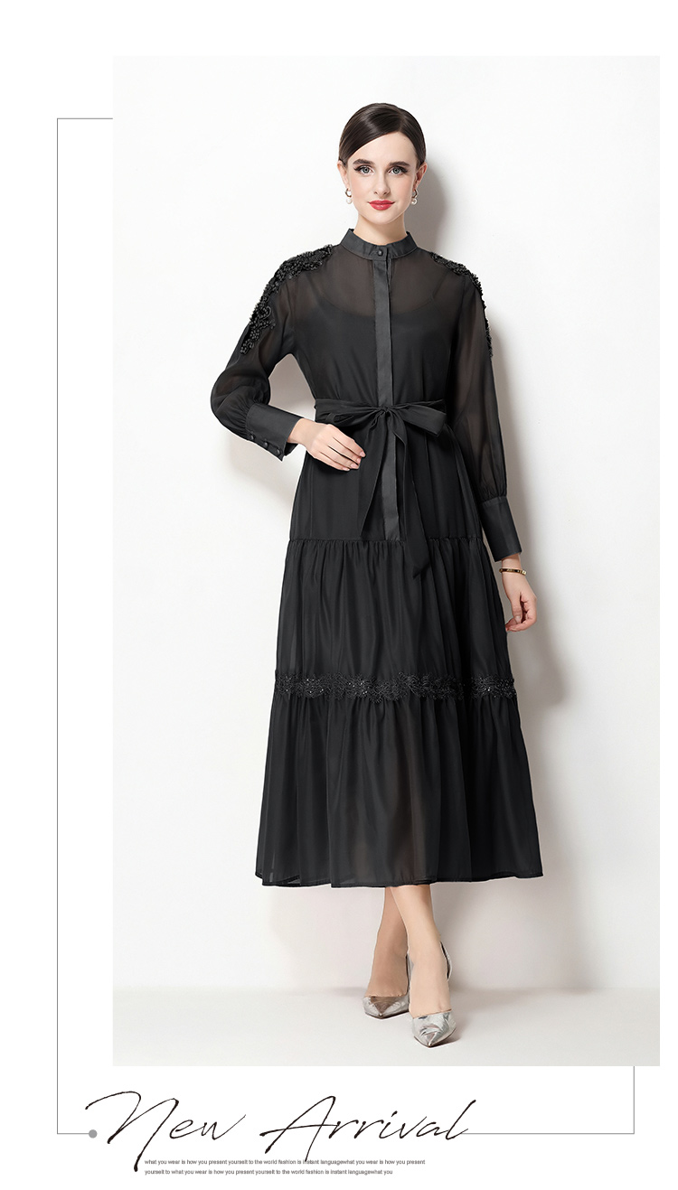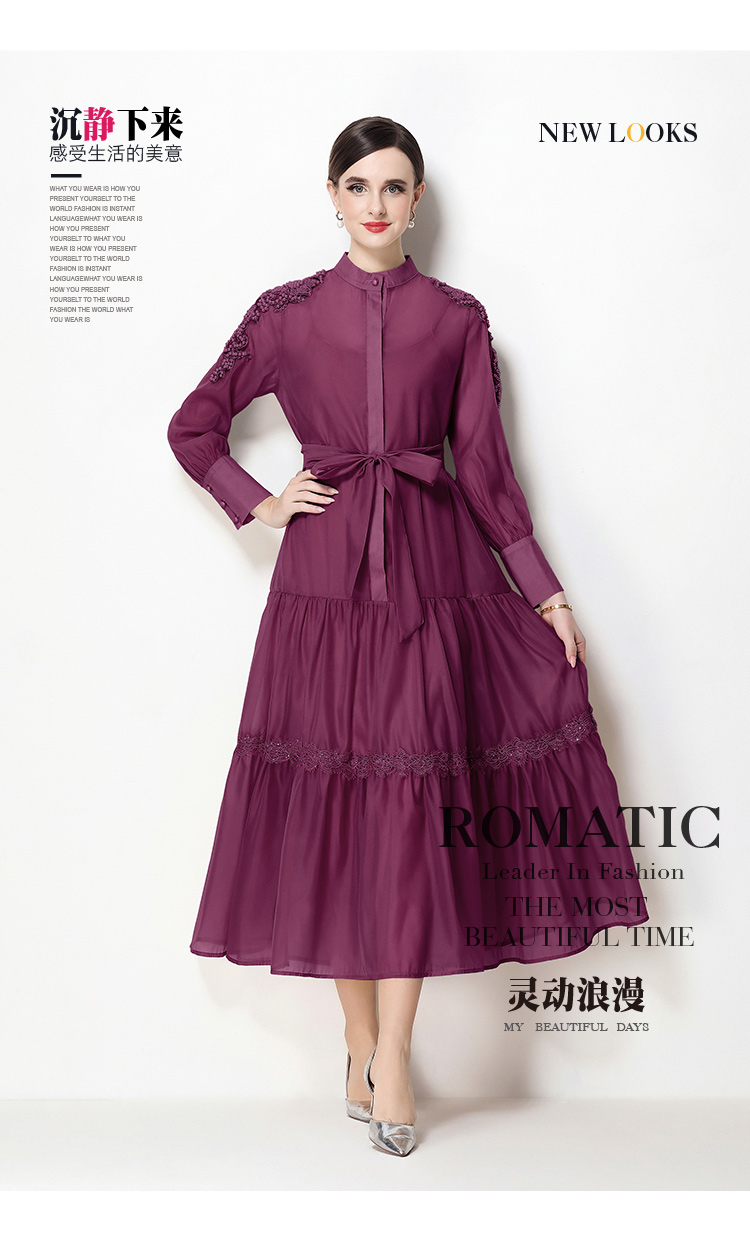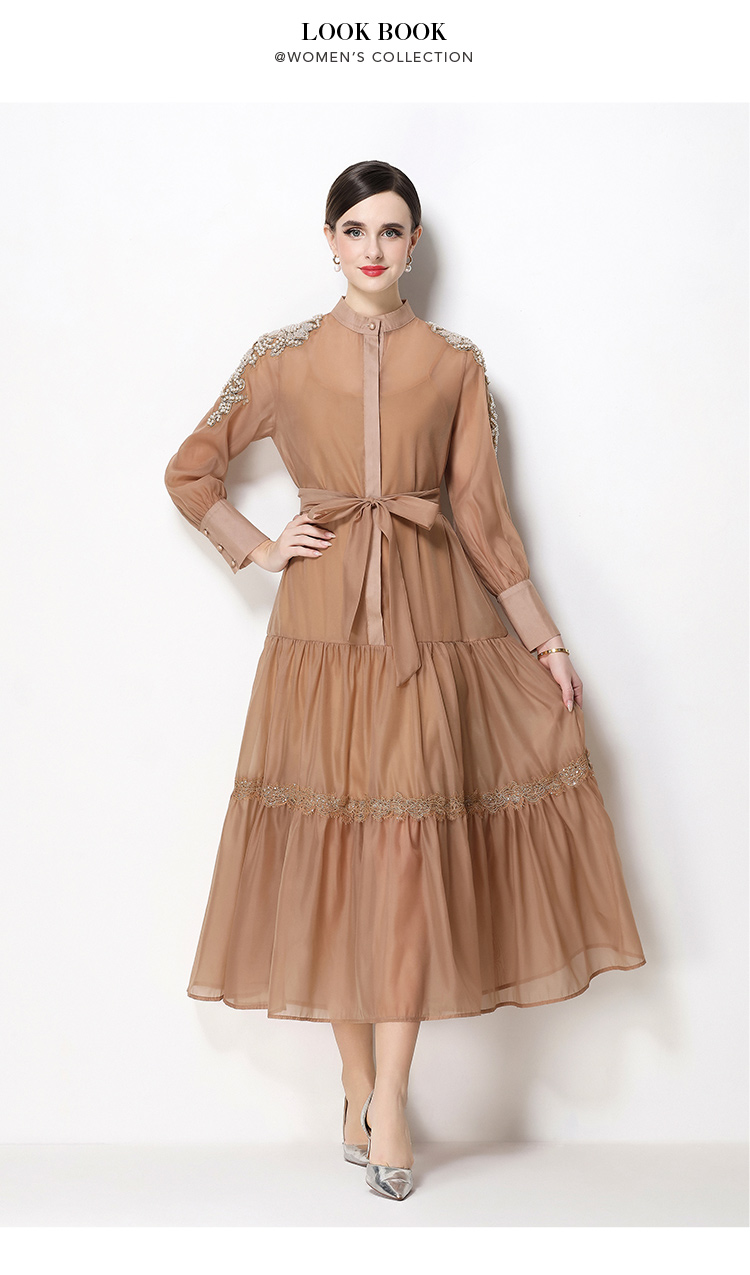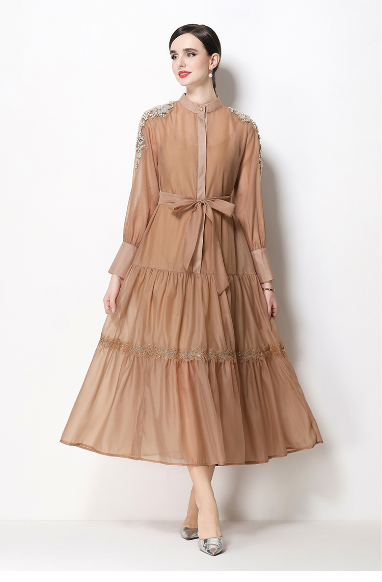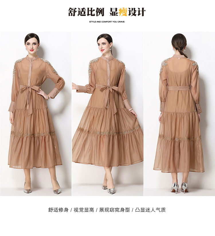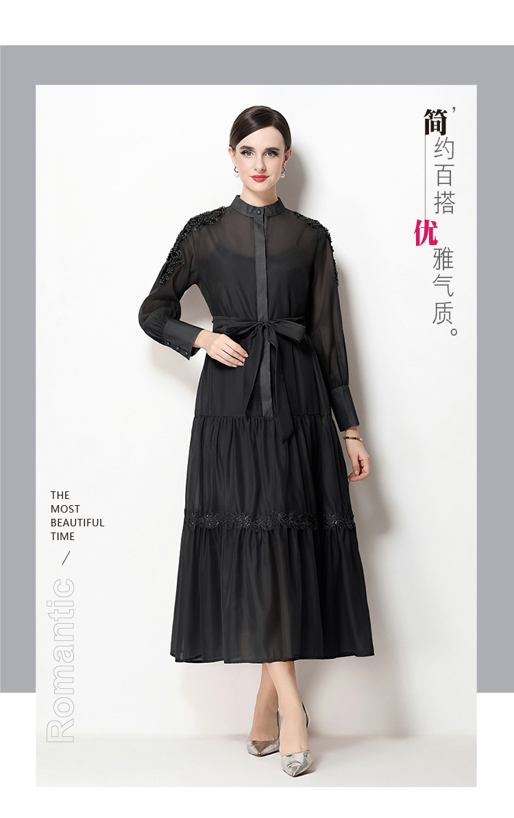 RY783# 2026春夏新款圆领单排扣复古刺绣钉珠宽松长裙连衣裙配腰带