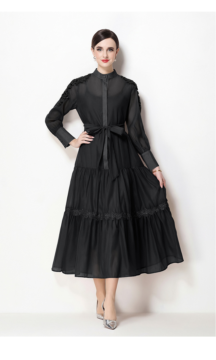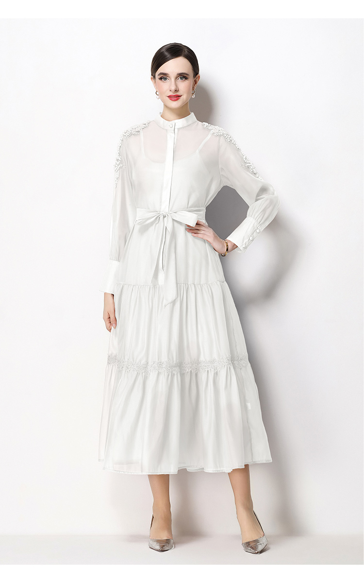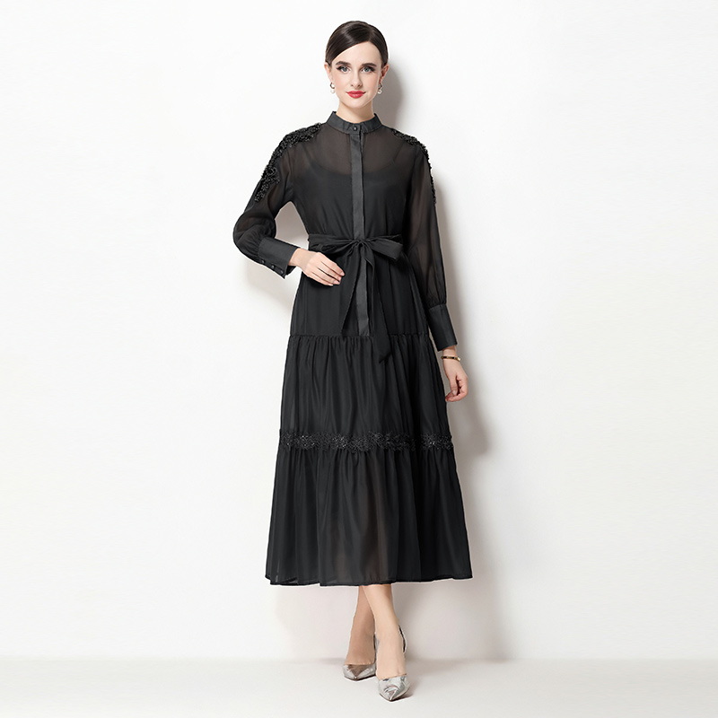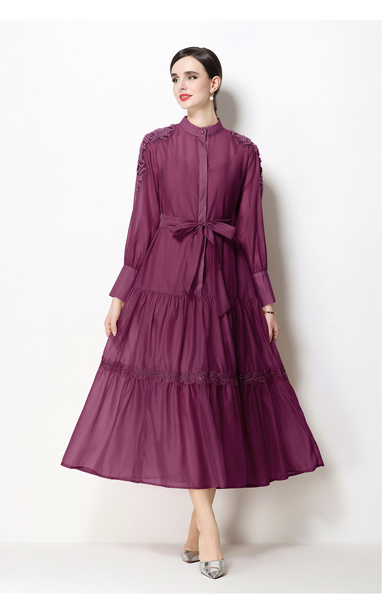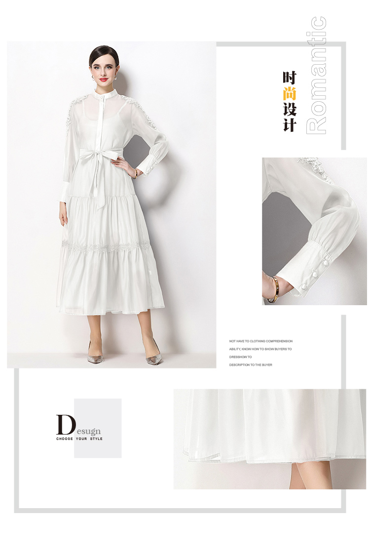 RY783# 2026春夏新款圆领单排扣复古刺绣钉珠宽松长裙连衣裙配腰带
