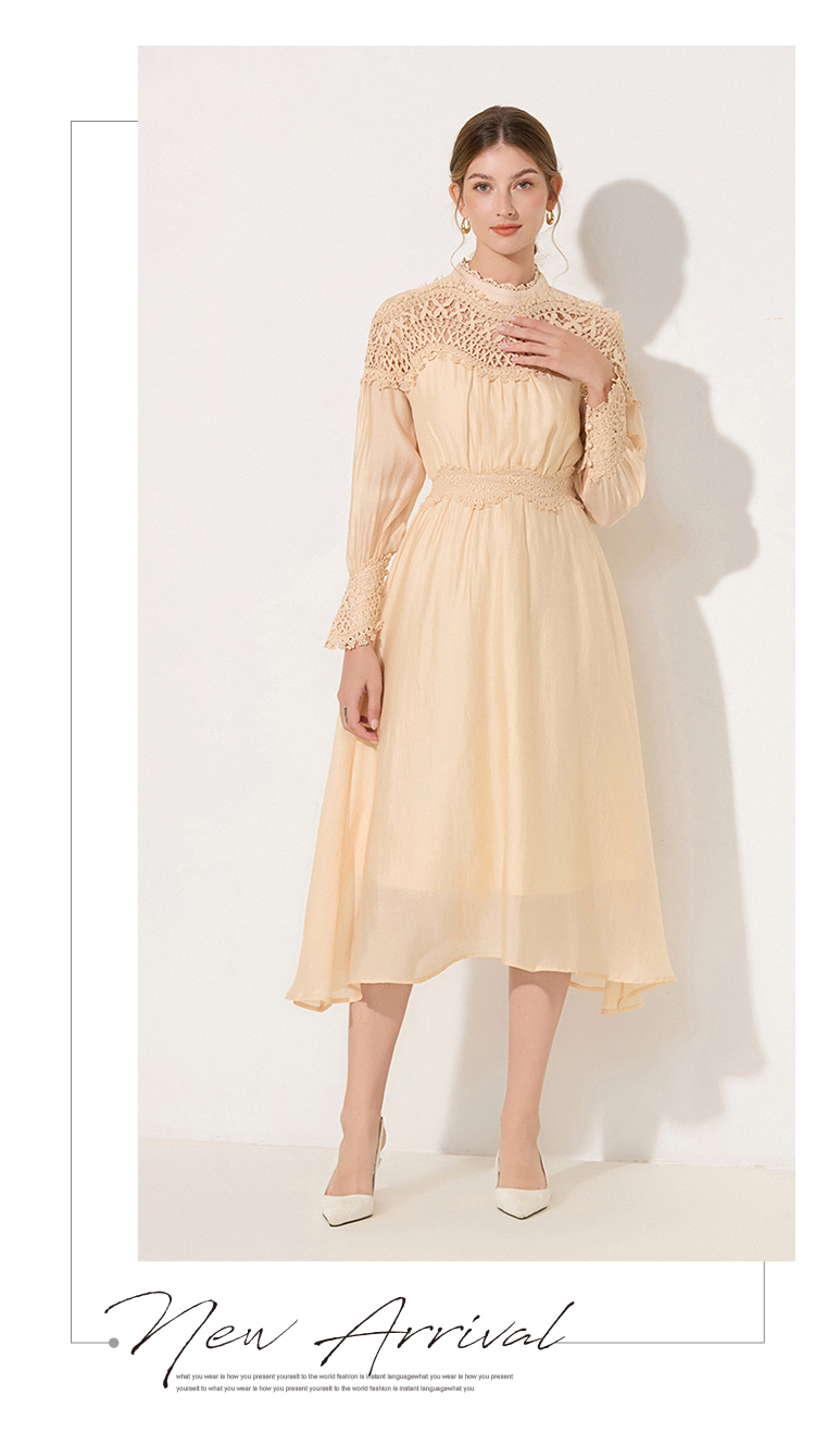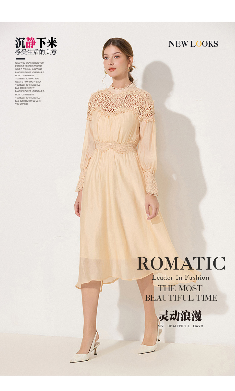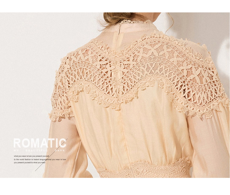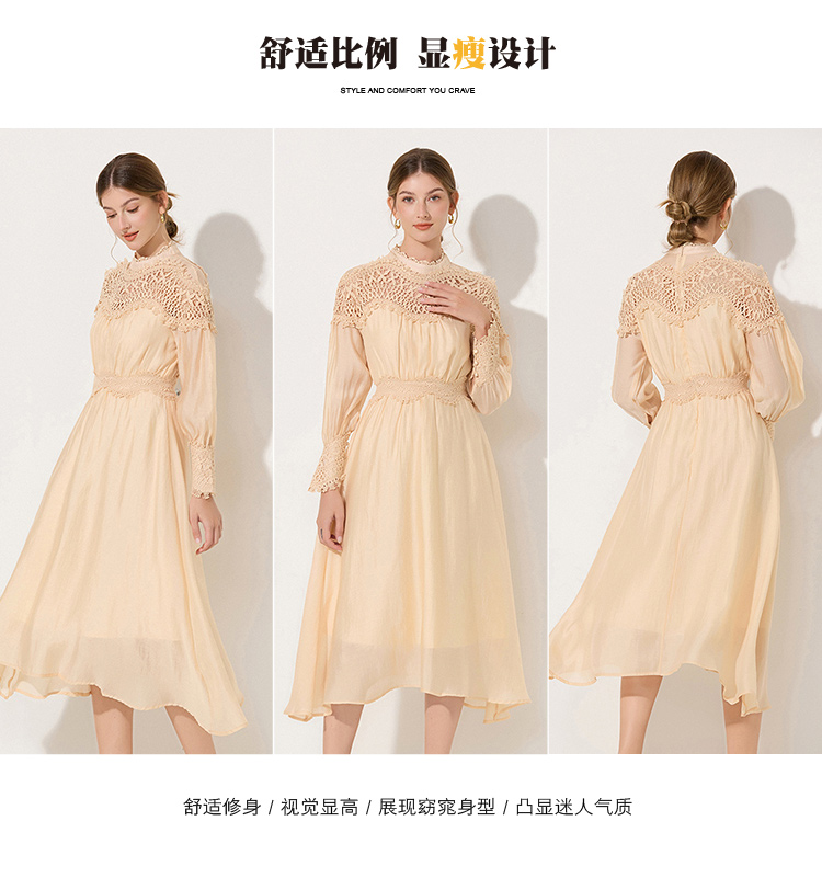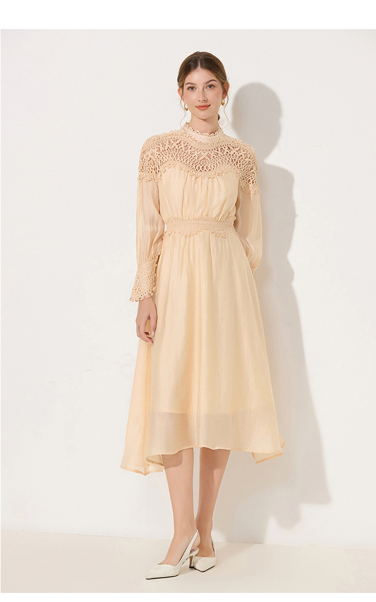 RY786# 秋季时立领复古灯笼袖拼接镂空波浪花边收腰大摆连衣裙