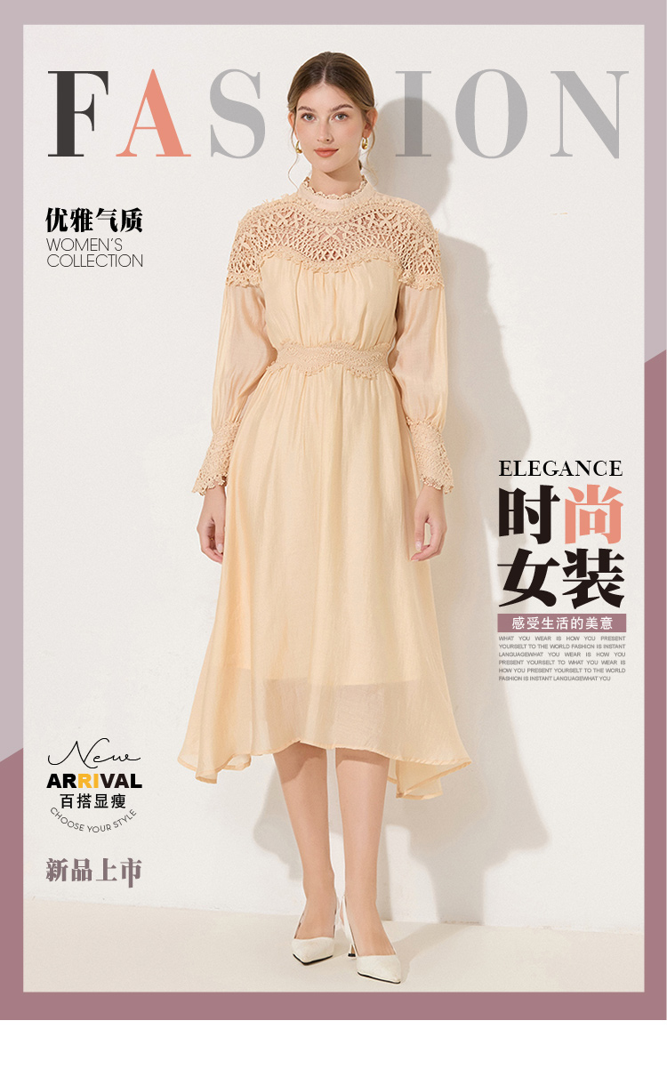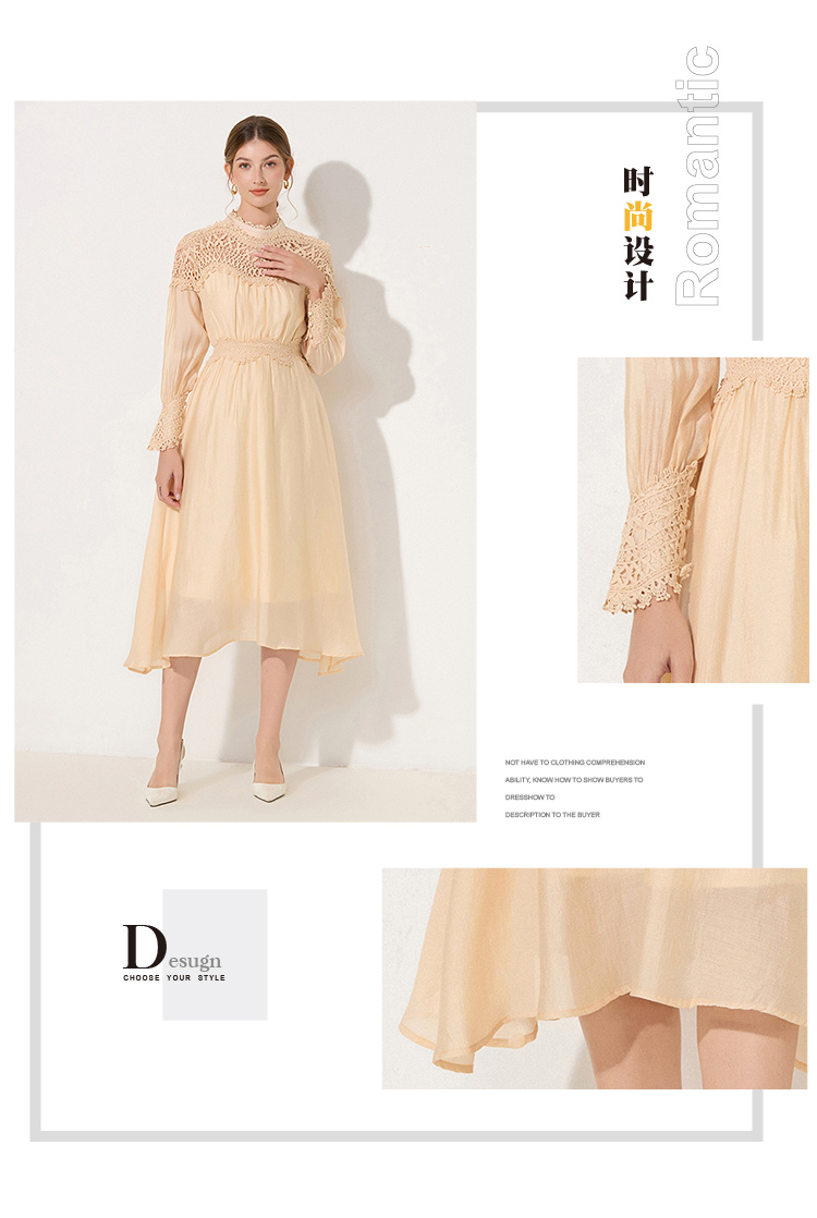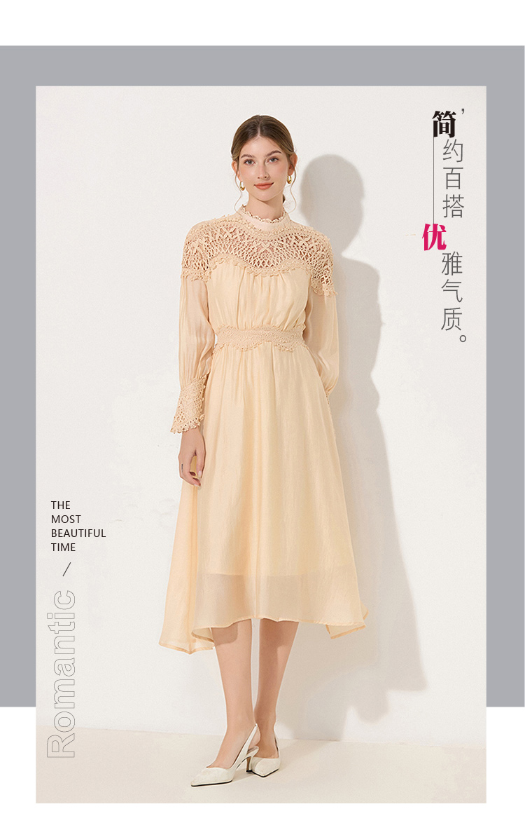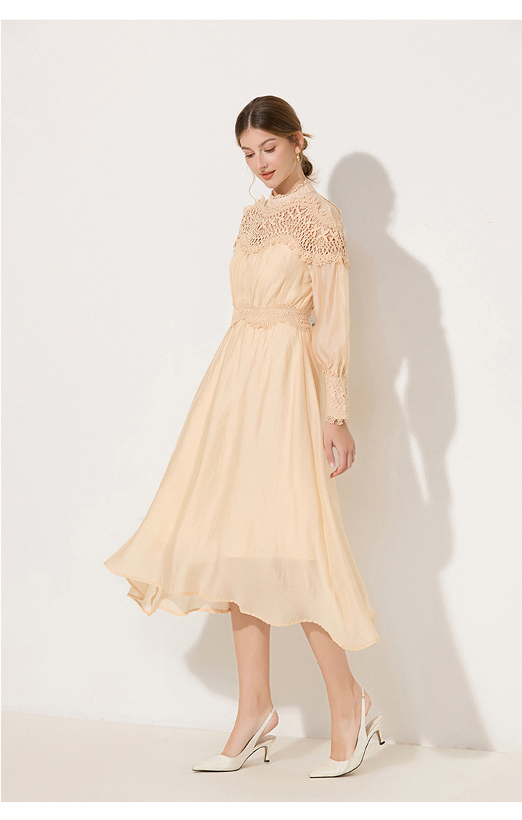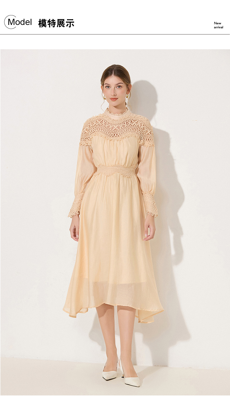 RY786# 秋季时立领复古灯笼袖拼接镂空波浪花边收腰大摆连衣裙