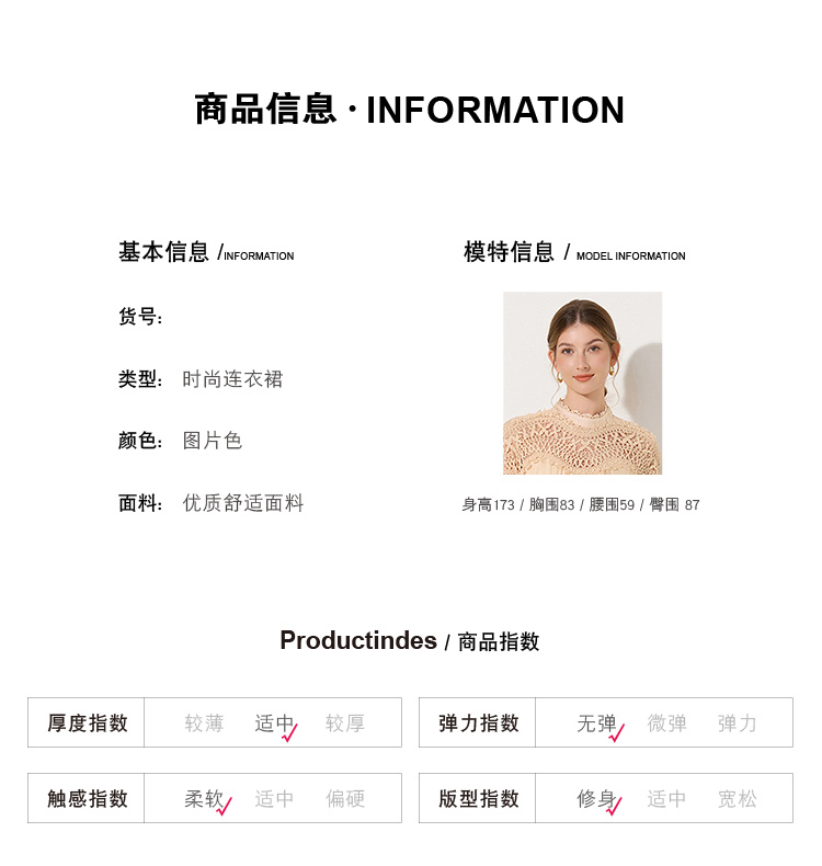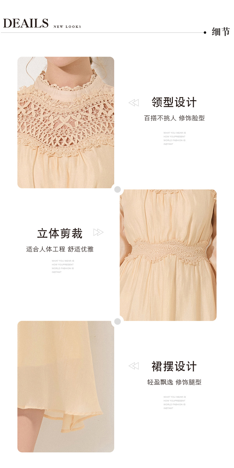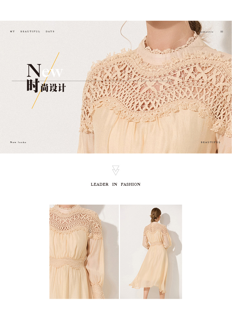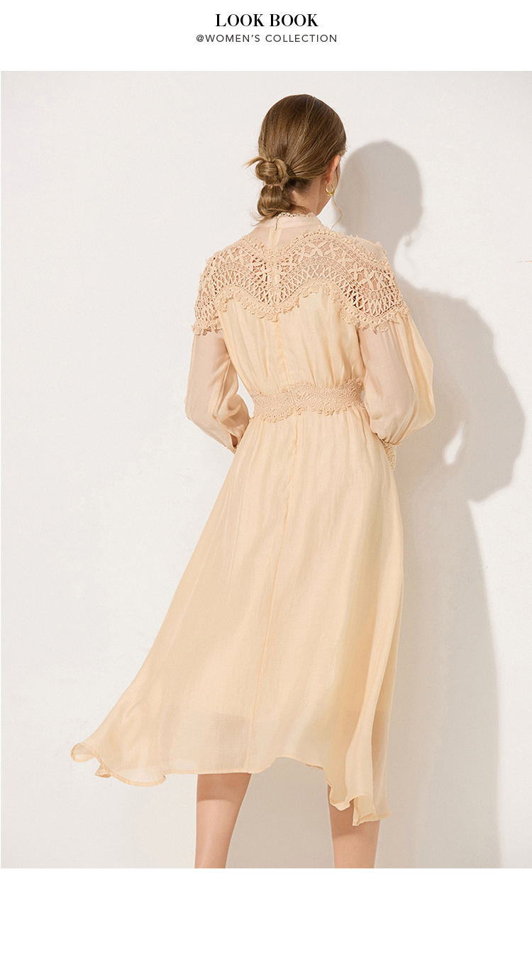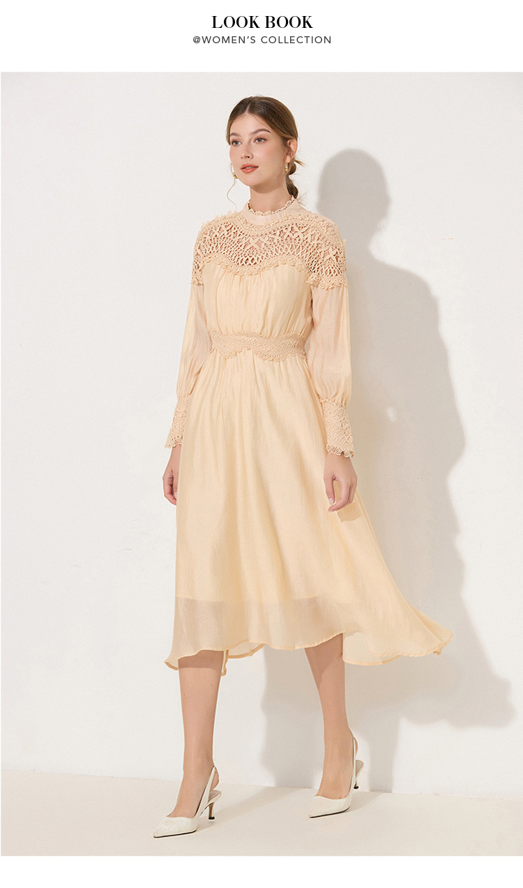 RY786# 秋季时立领复古灯笼袖拼接镂空波浪花边收腰大摆连衣裙