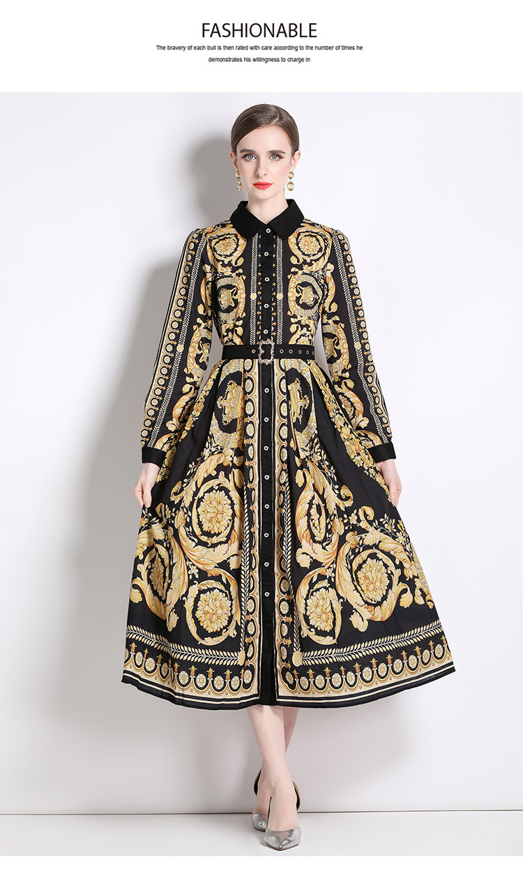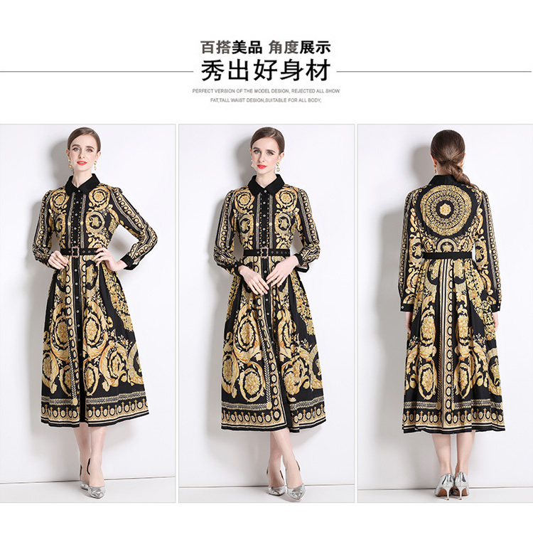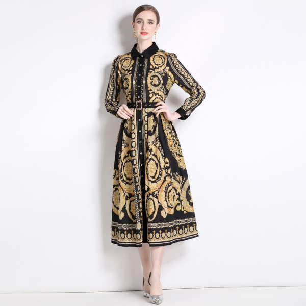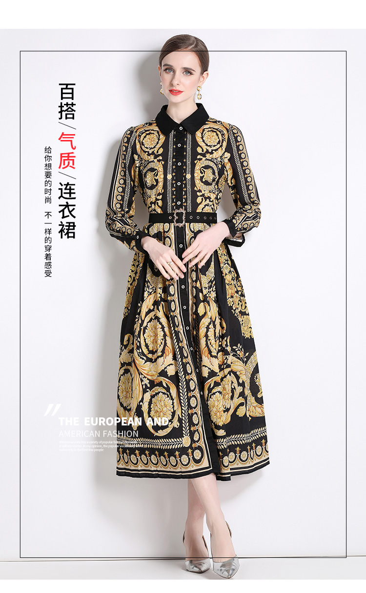 RM4875#新款单排扣翻领长袖印花衬衣连衣裙