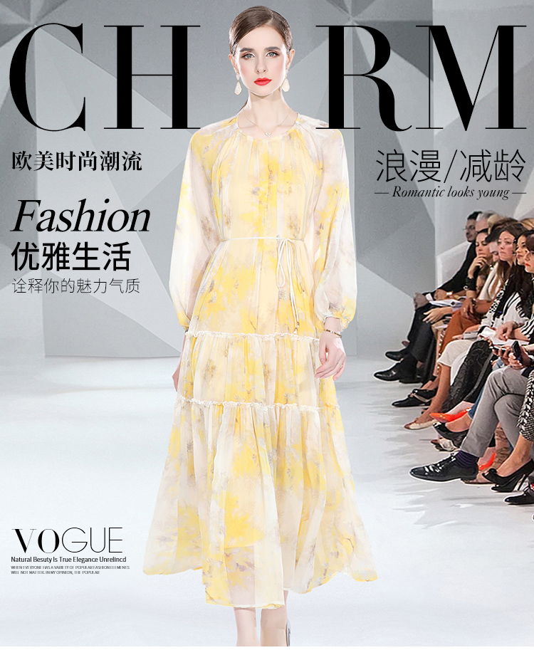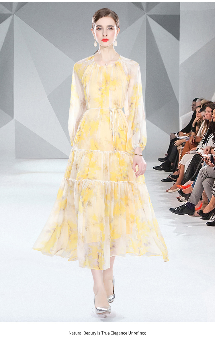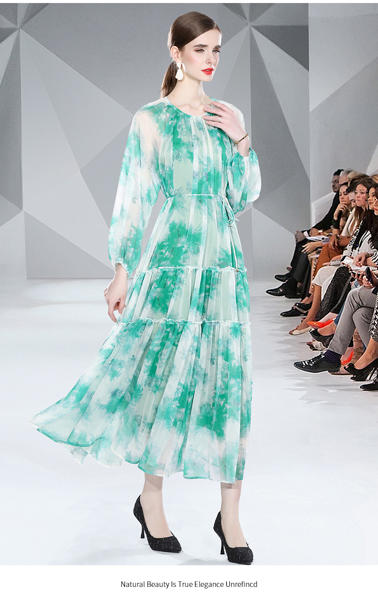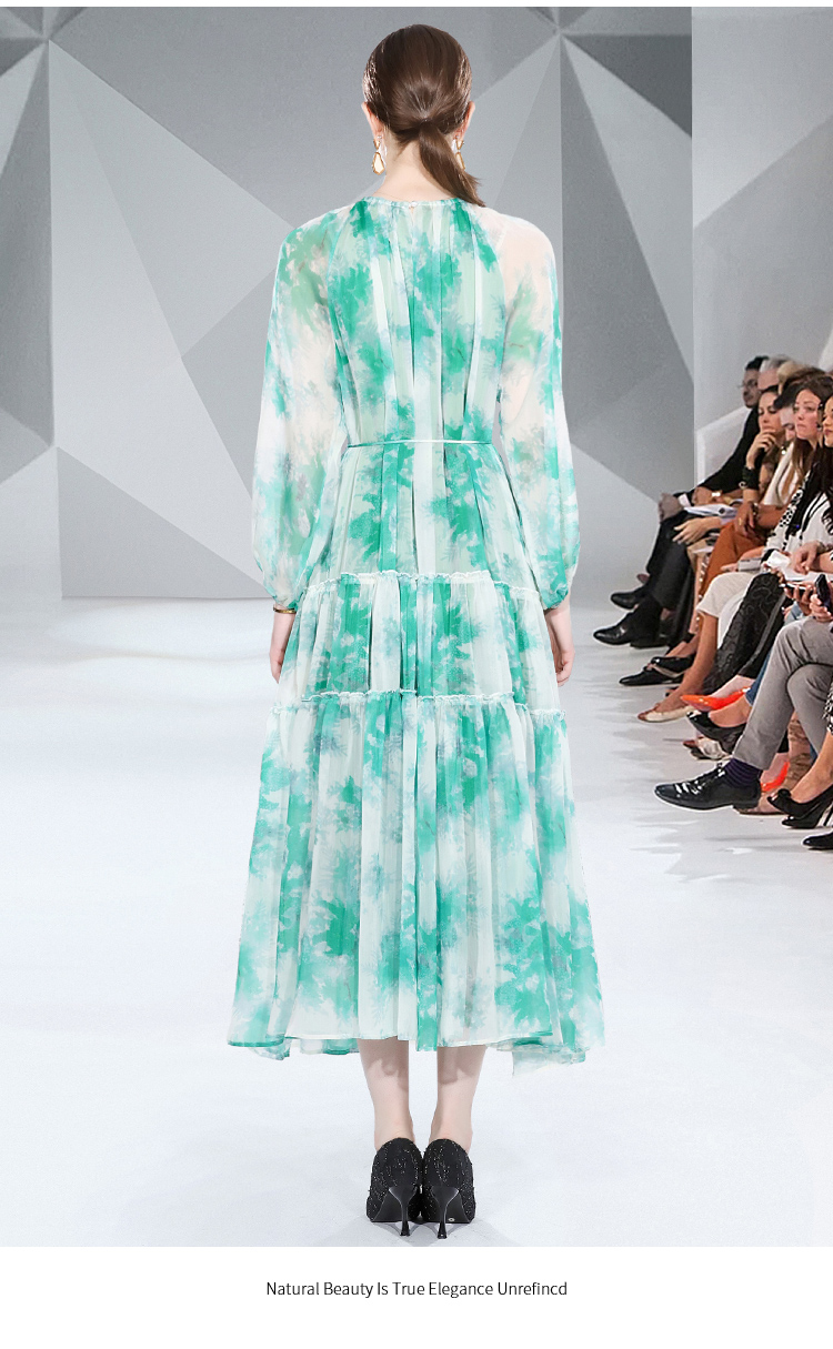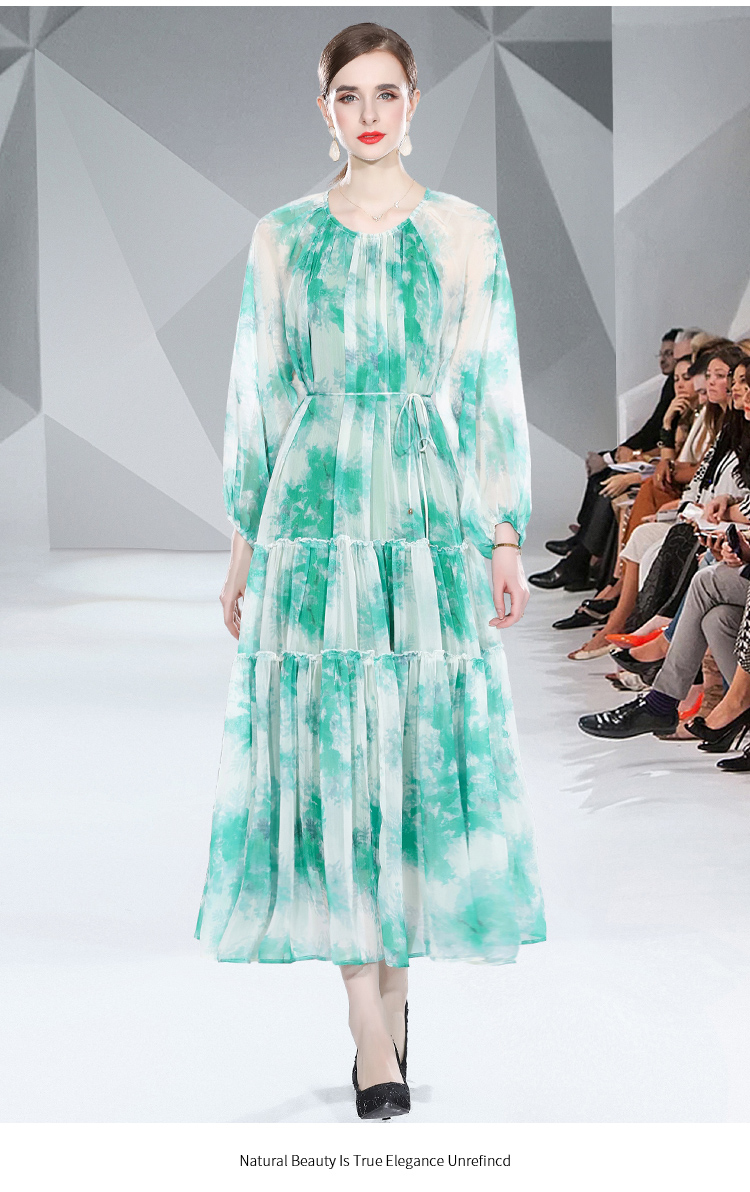 RM5268#长袖系带雪纺长款印花连衣裙