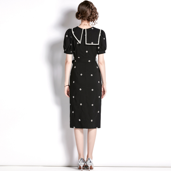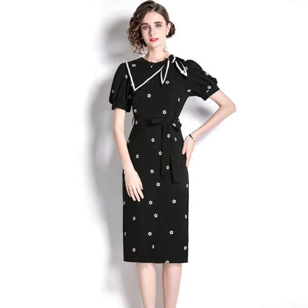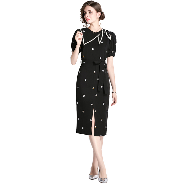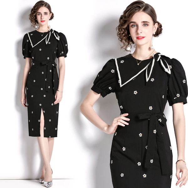 RM5270#新款女蝴蝶结系带修身显瘦开衩绣花连衣裙