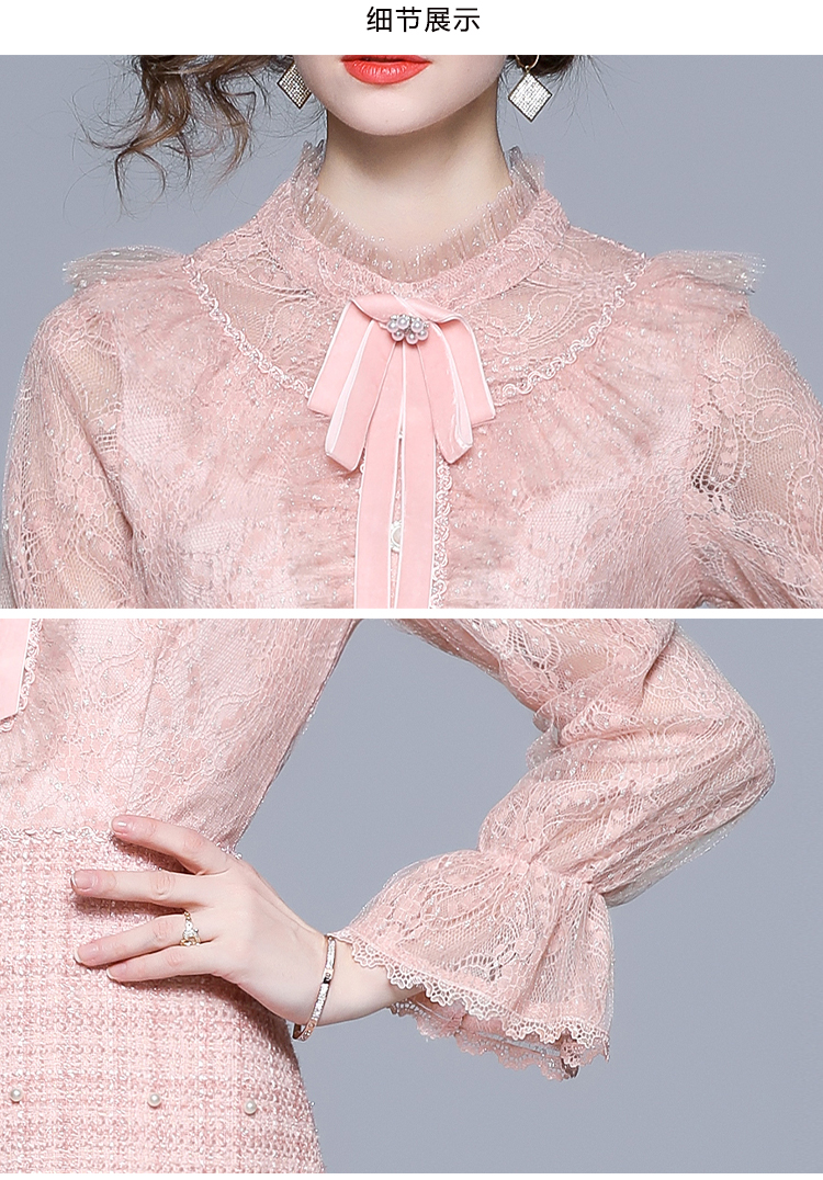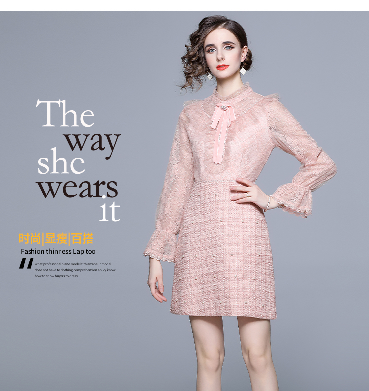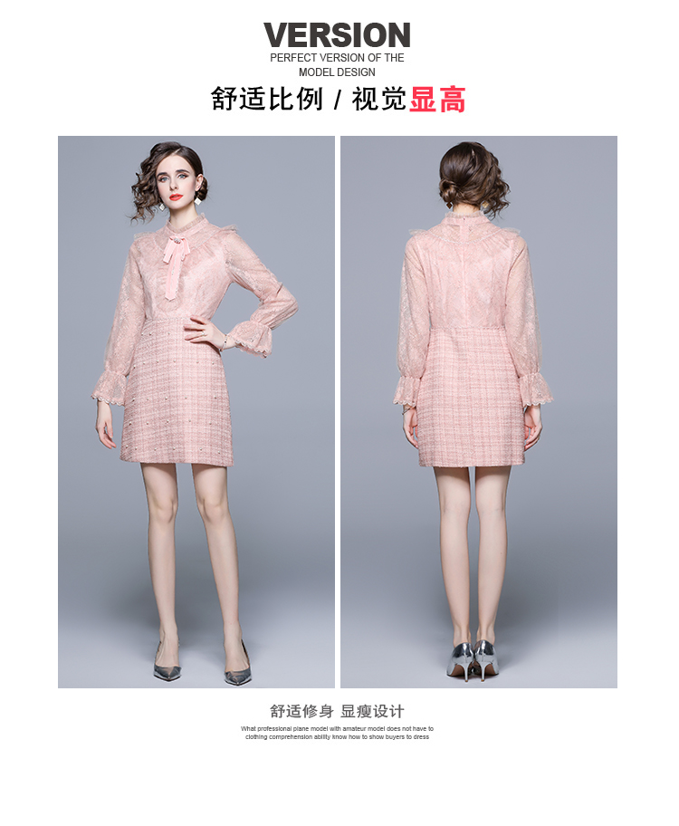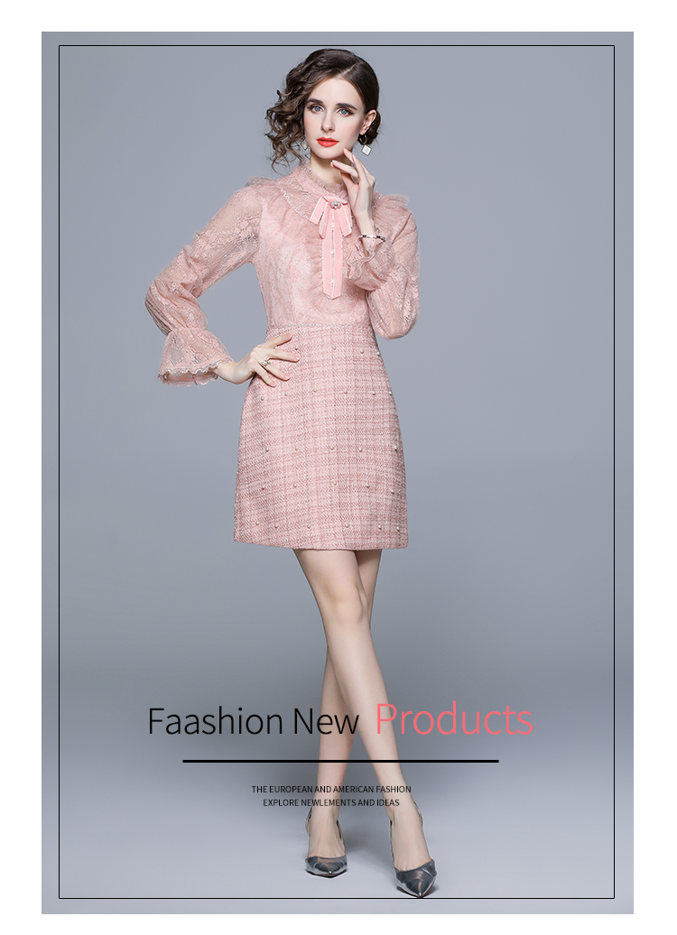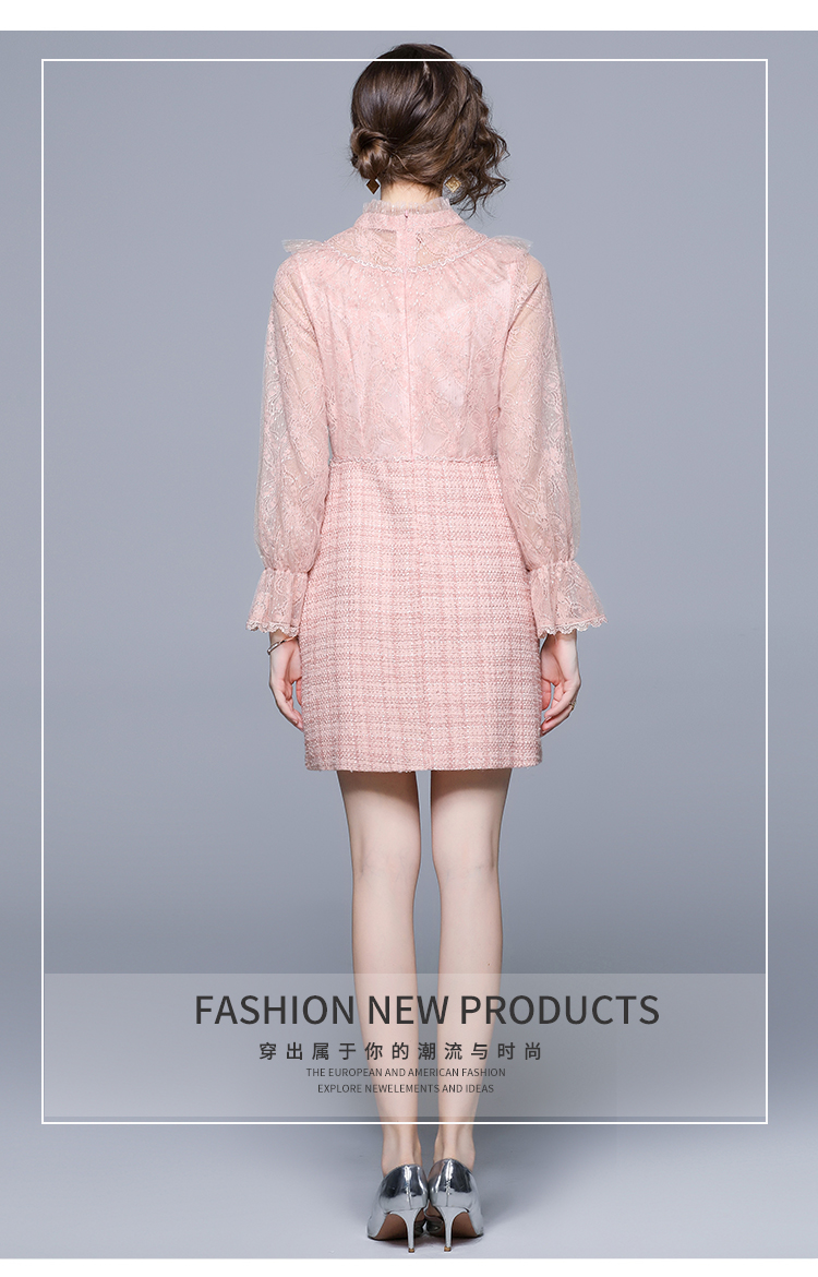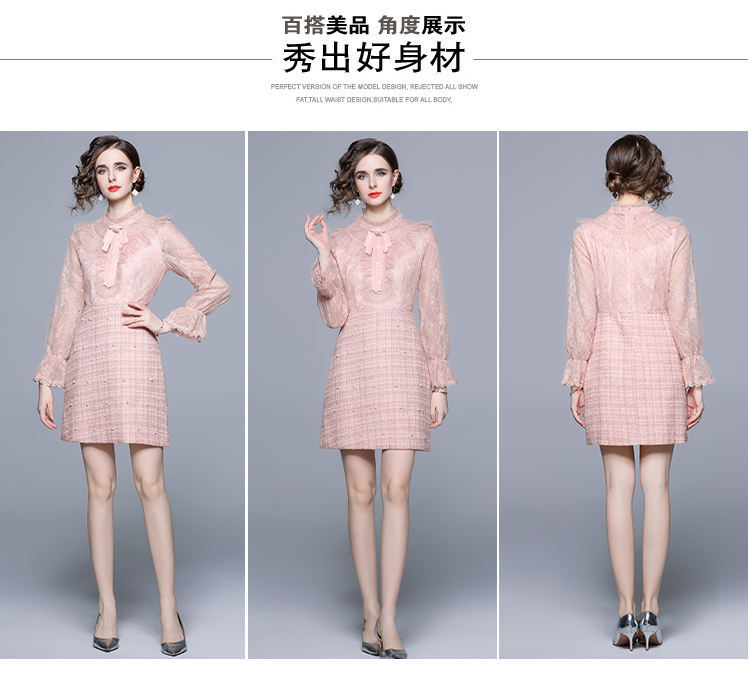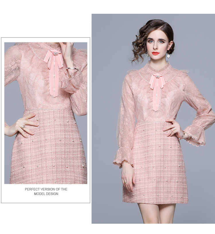 RM5277#新款粉色显瘦气质下摆钉珠粗呢连衣裙